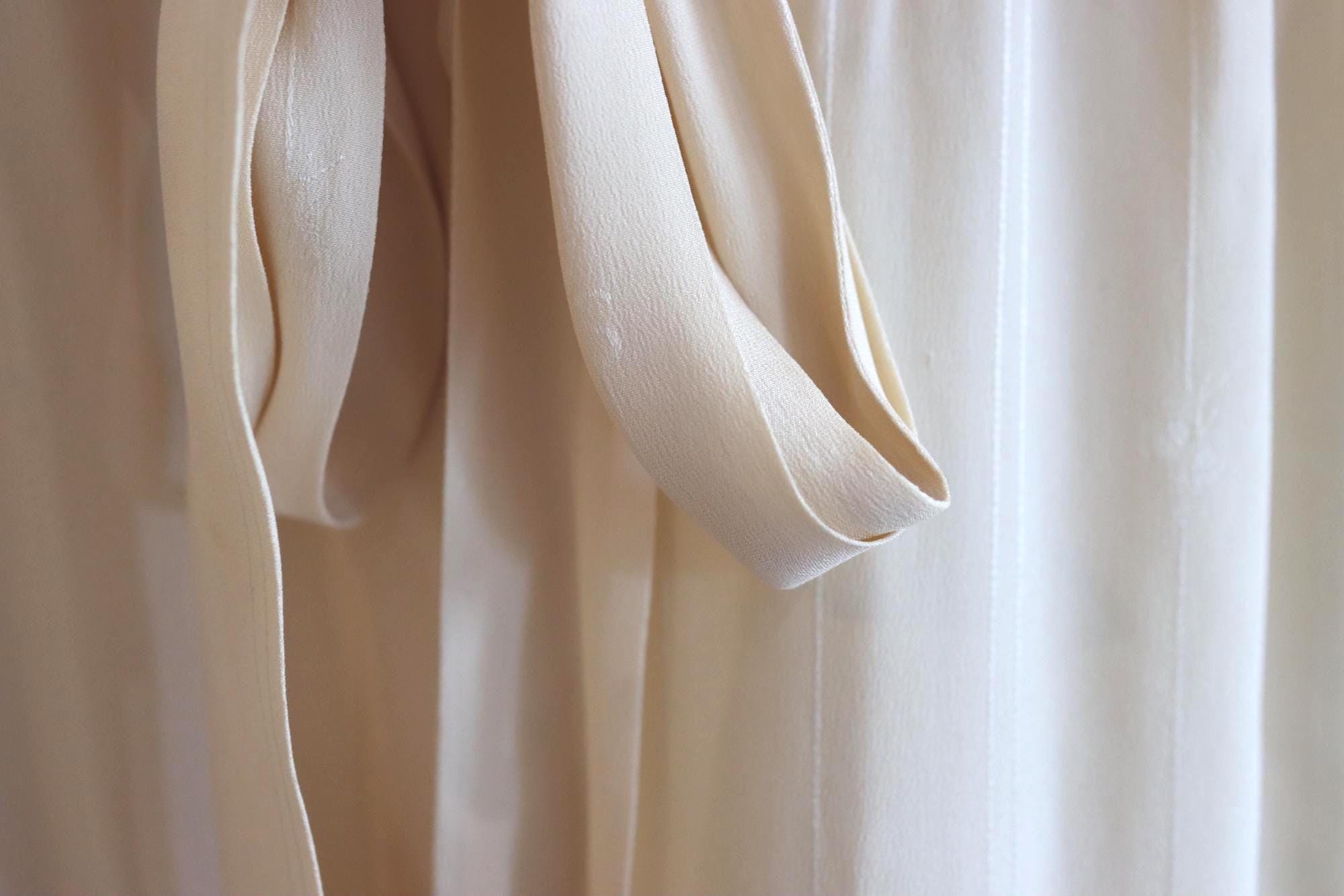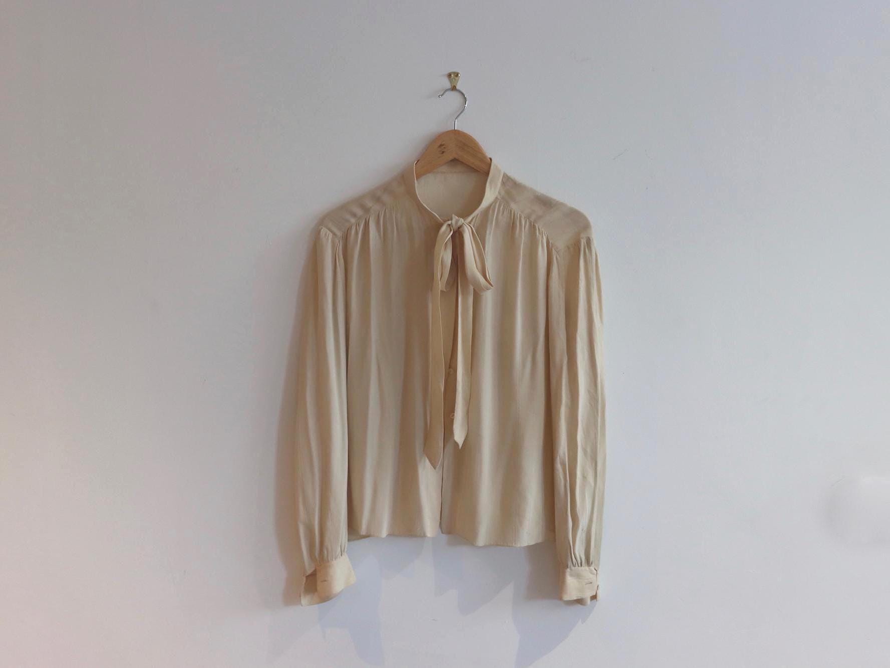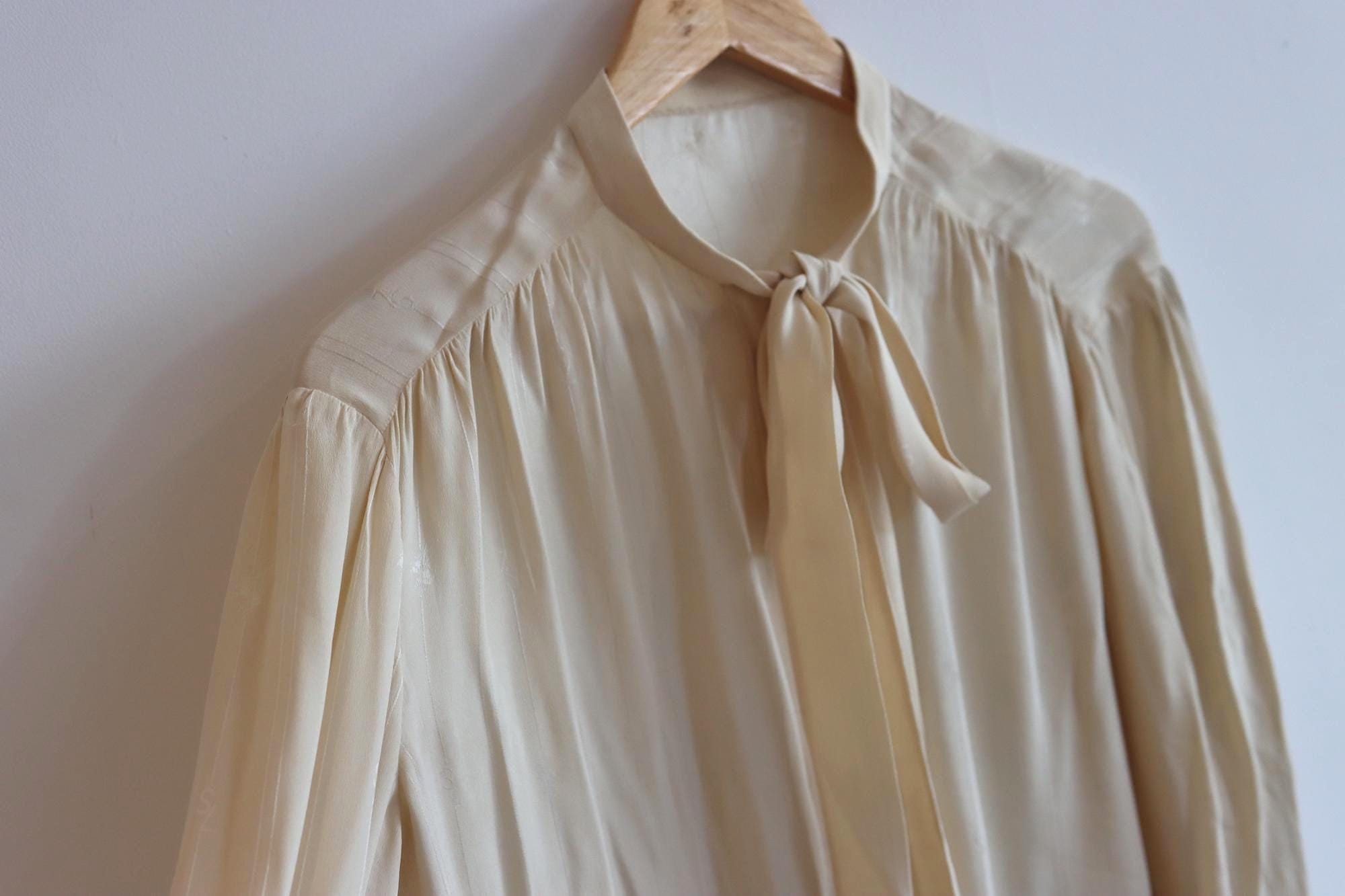 Pussy bow tie vintage blouse with a SL monogram faintly running through the fabric. It looks very similar to the YSL monogram but its an unknown label as all been removed for aesthetic reasons.
