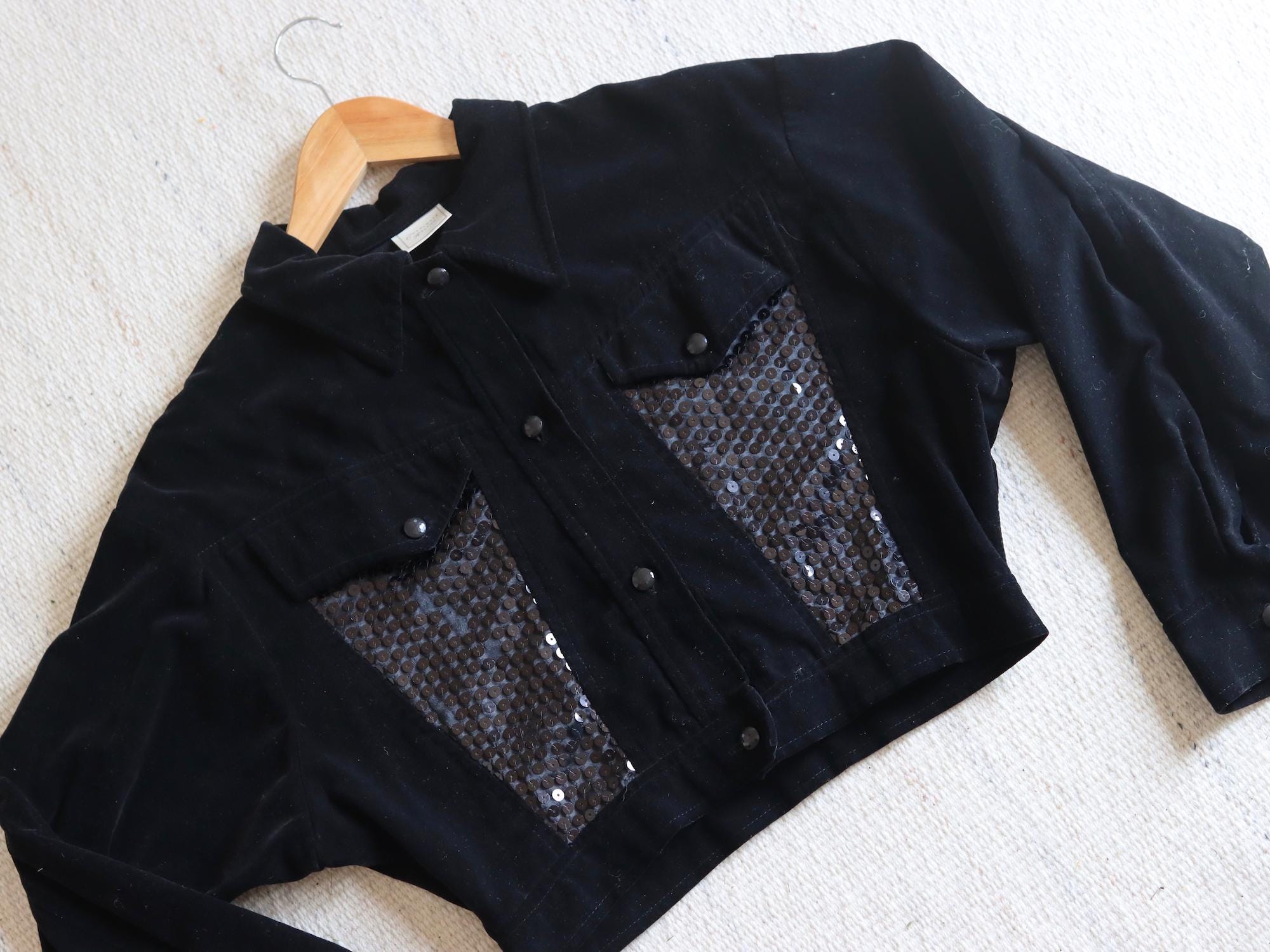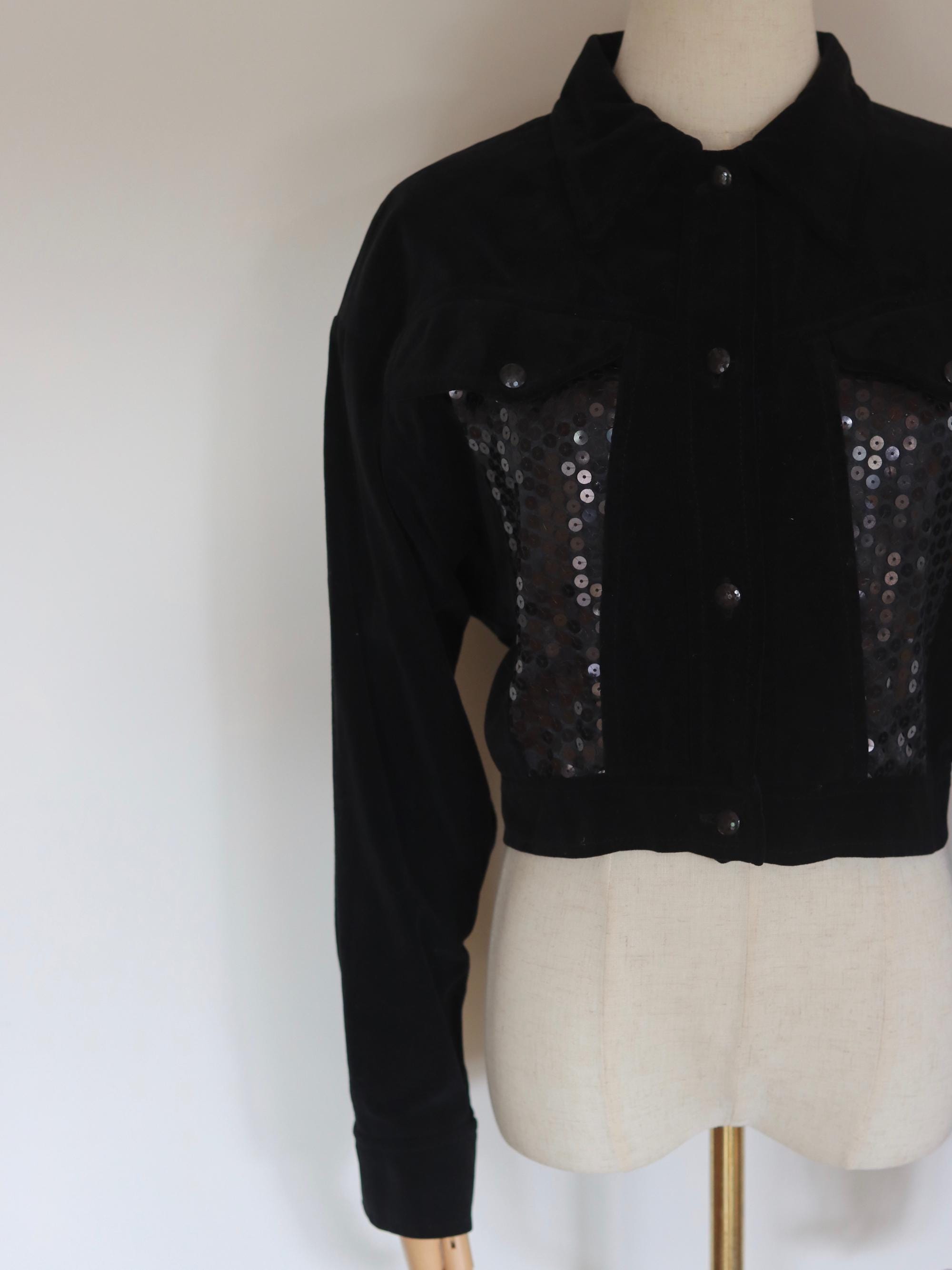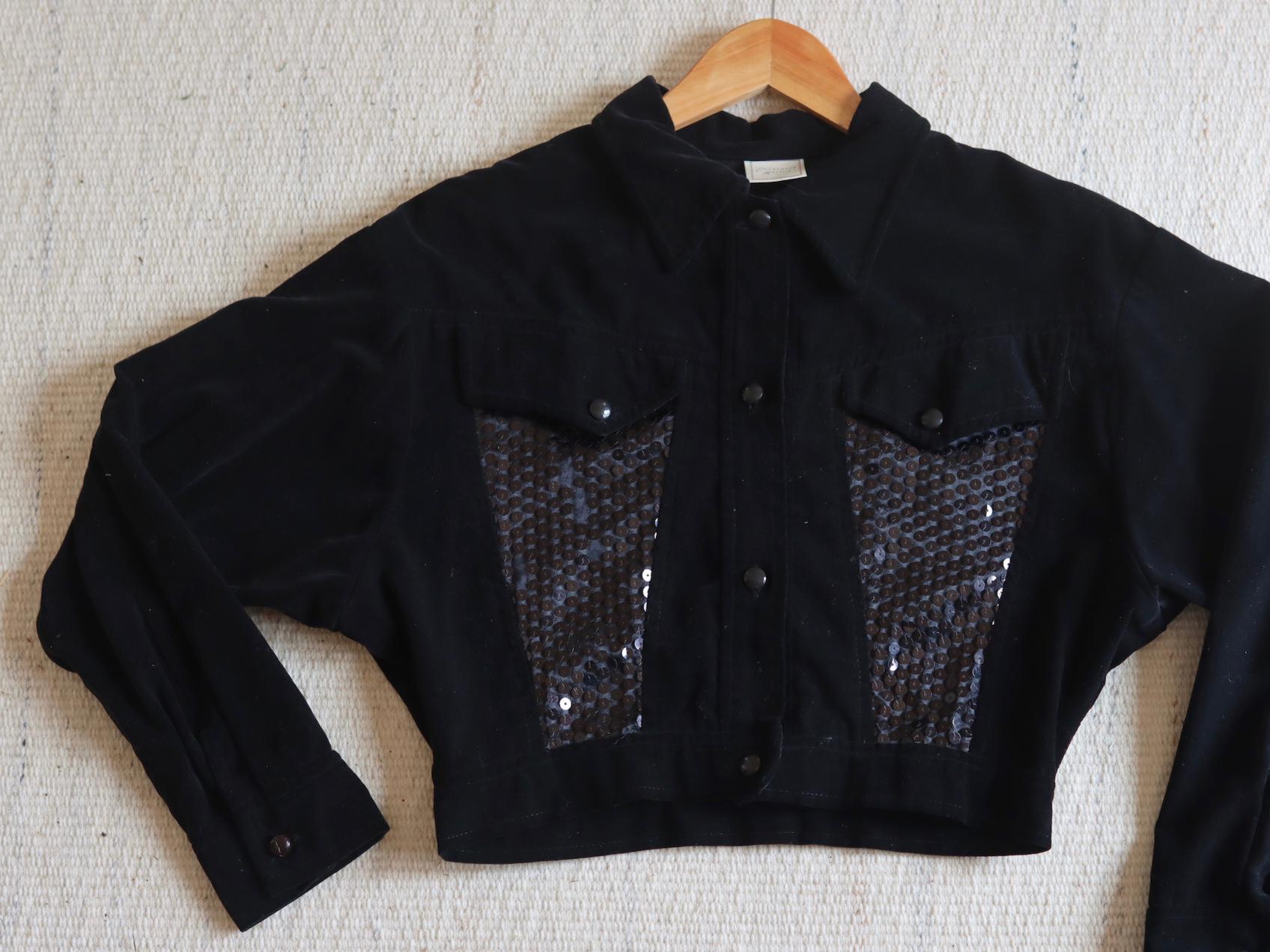 Black velvet cotton cropped jacket with shirt collar style and slightly batwing sleeves, fabulous sequin pockets (the breast pockets are decorative only). Looks great with high waisted skirts or trousers