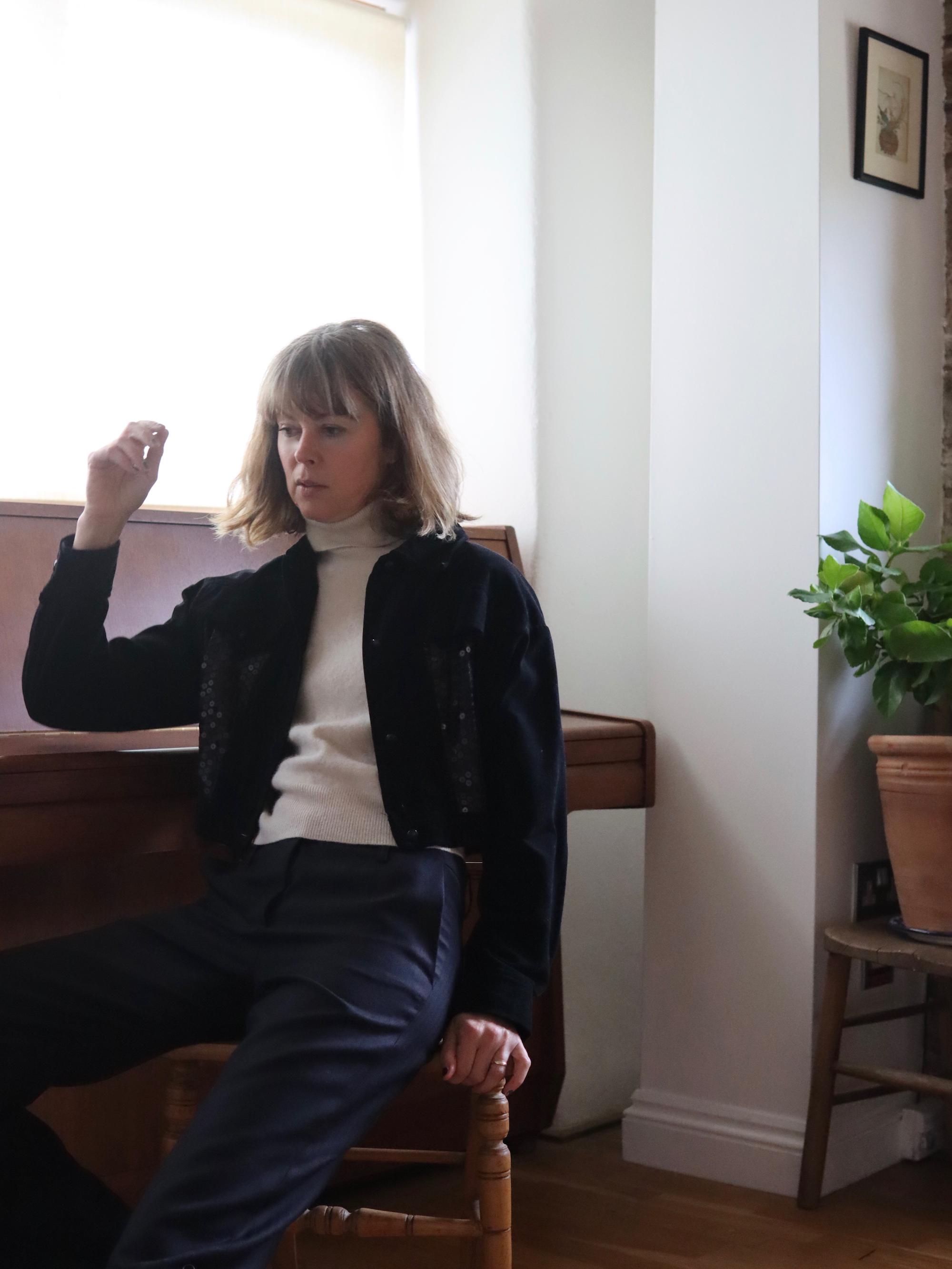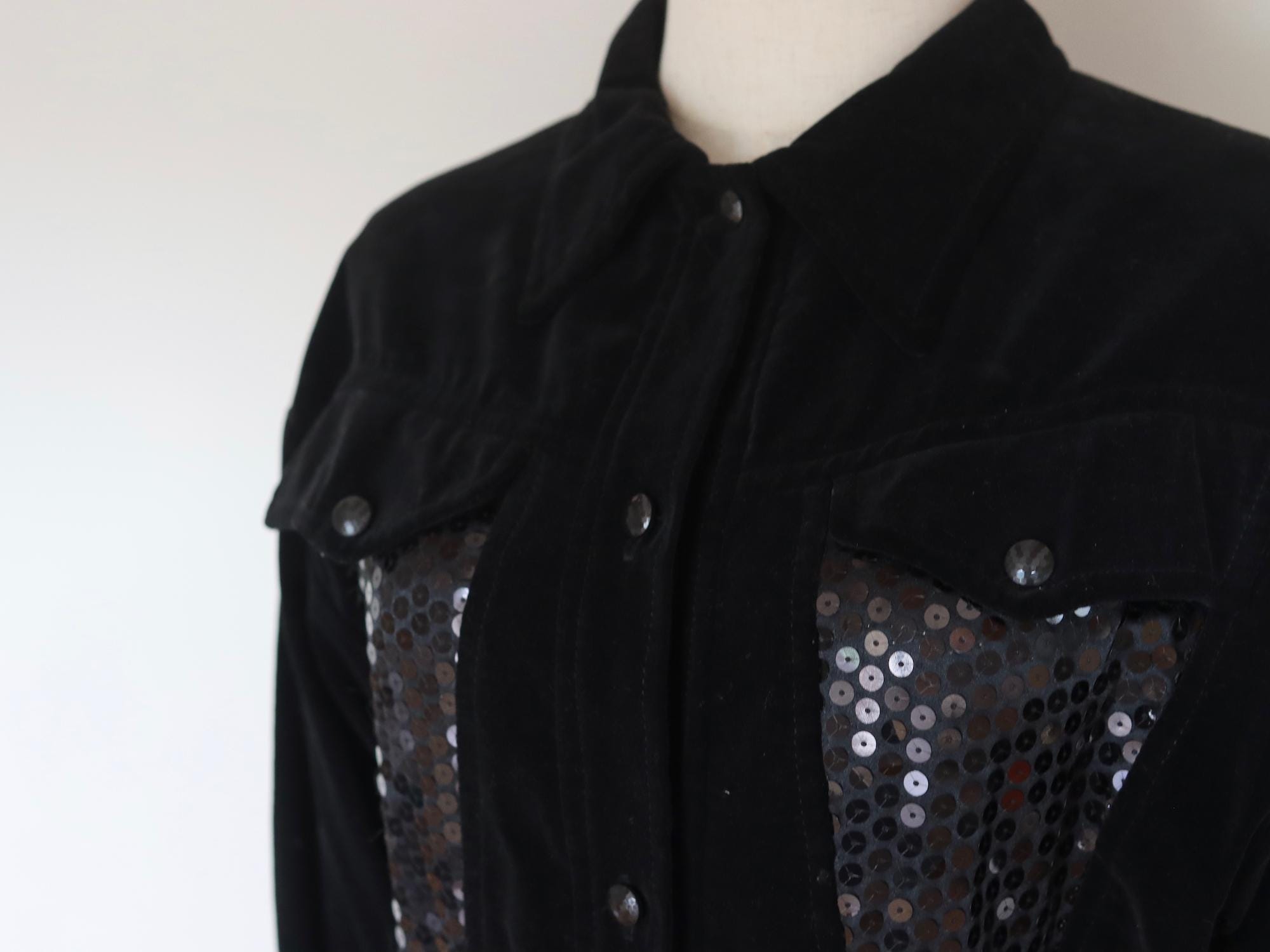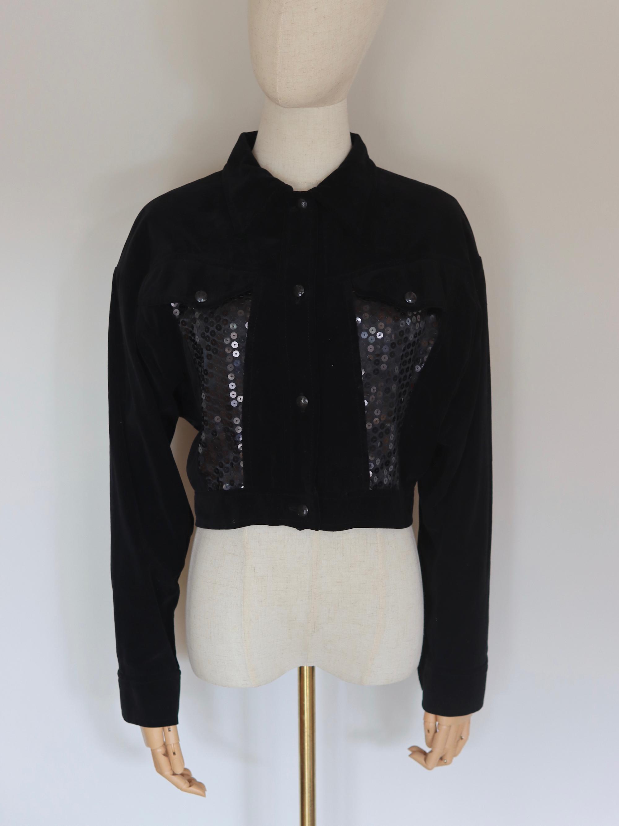 Black velvet cotton cropped jacket with shirt collar style and slightly batwing sleeves, fabulous sequin pockets (the breast pockets are decorative only). Looks great with high waisted skirts or trousers