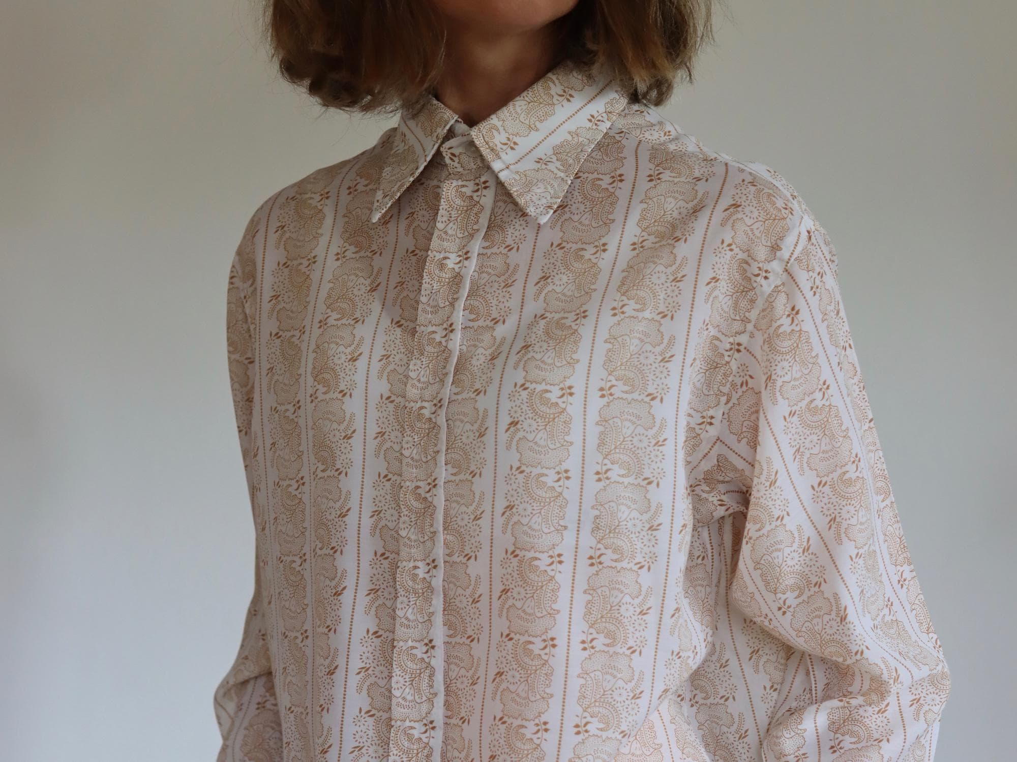 1970s mens fit printed shirt by Conway of Jermyn Street in London the street is famous for its heritage shirt makers. Its quite a silky feel and we love the cuff design.