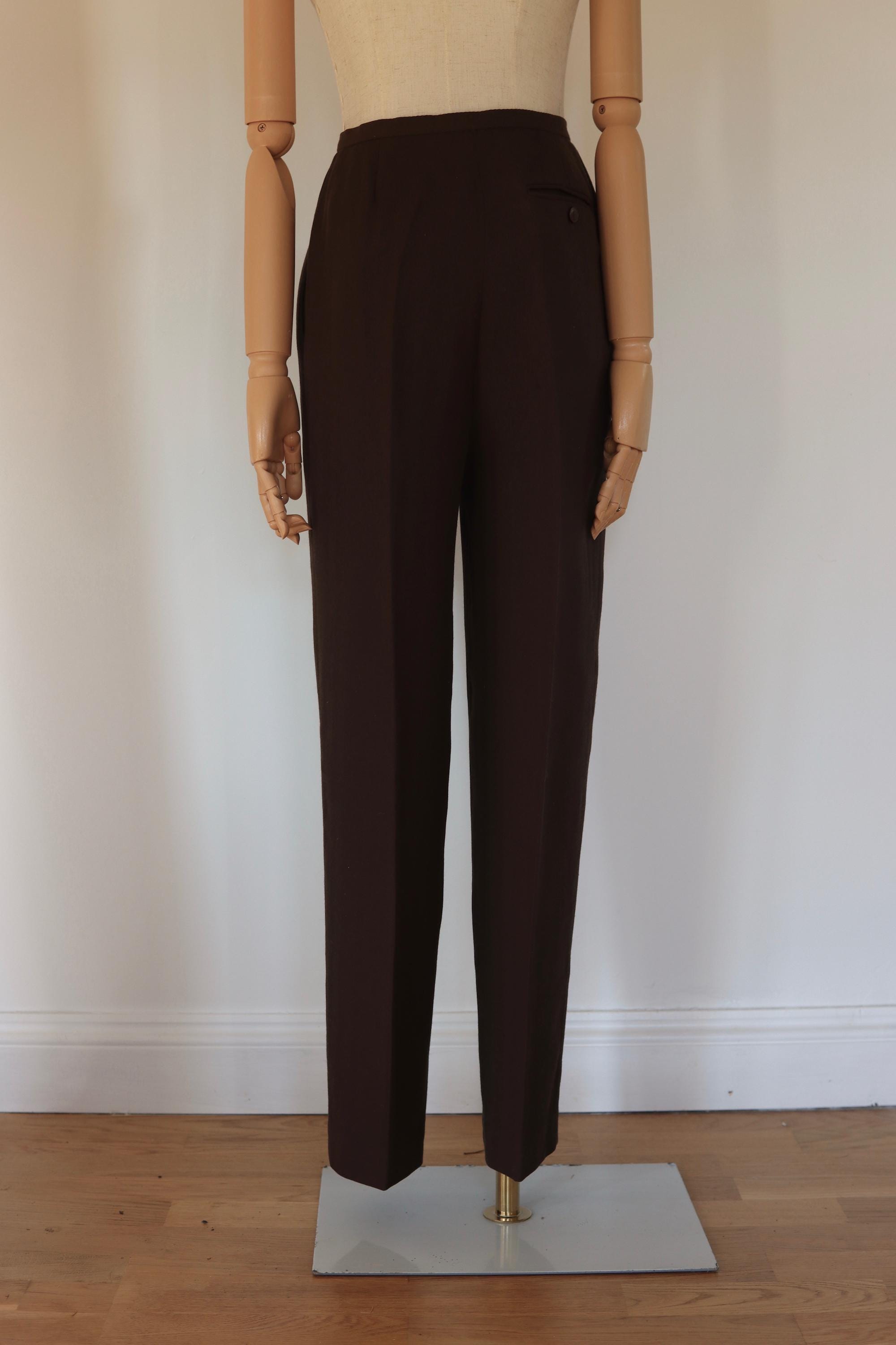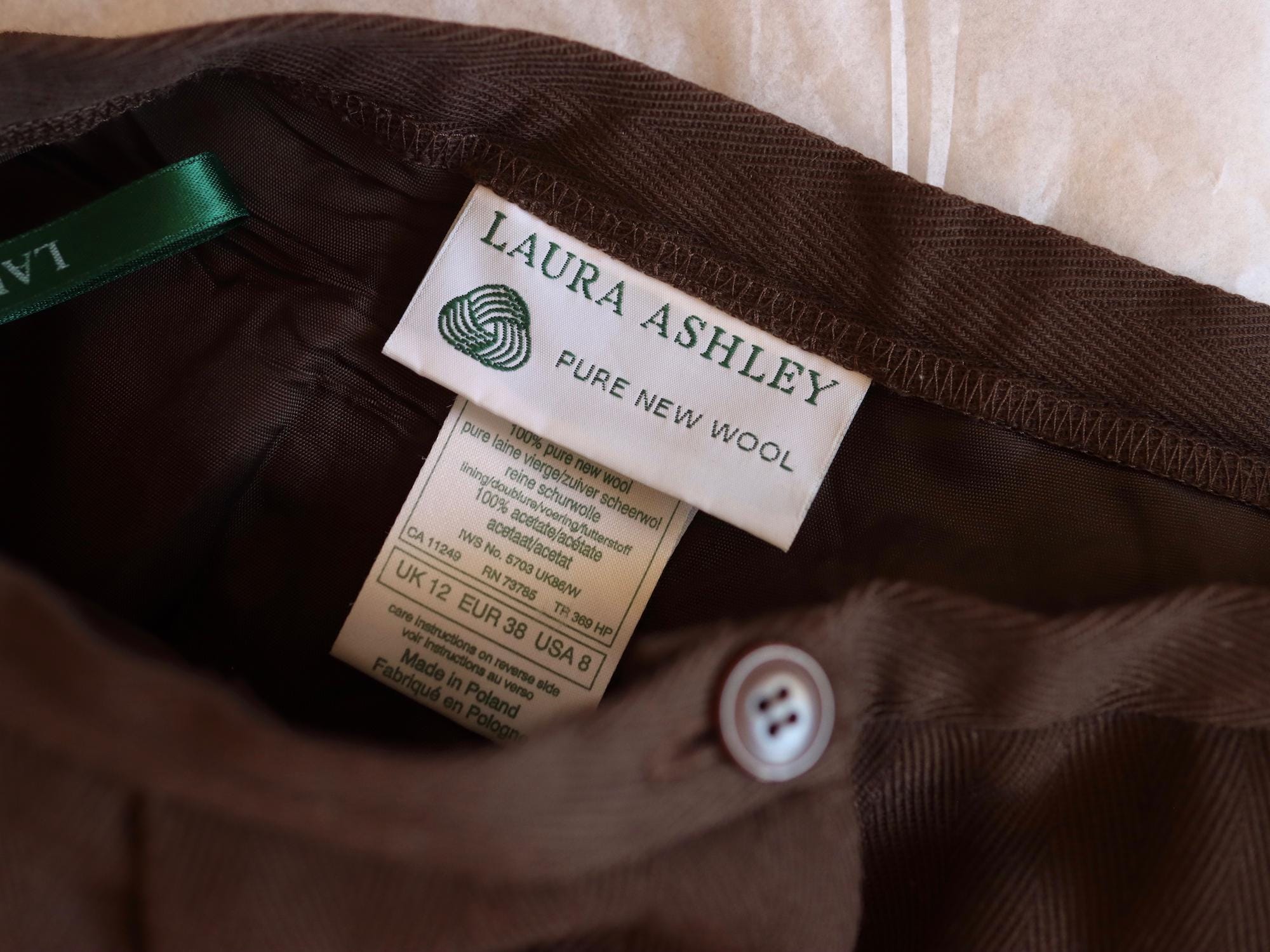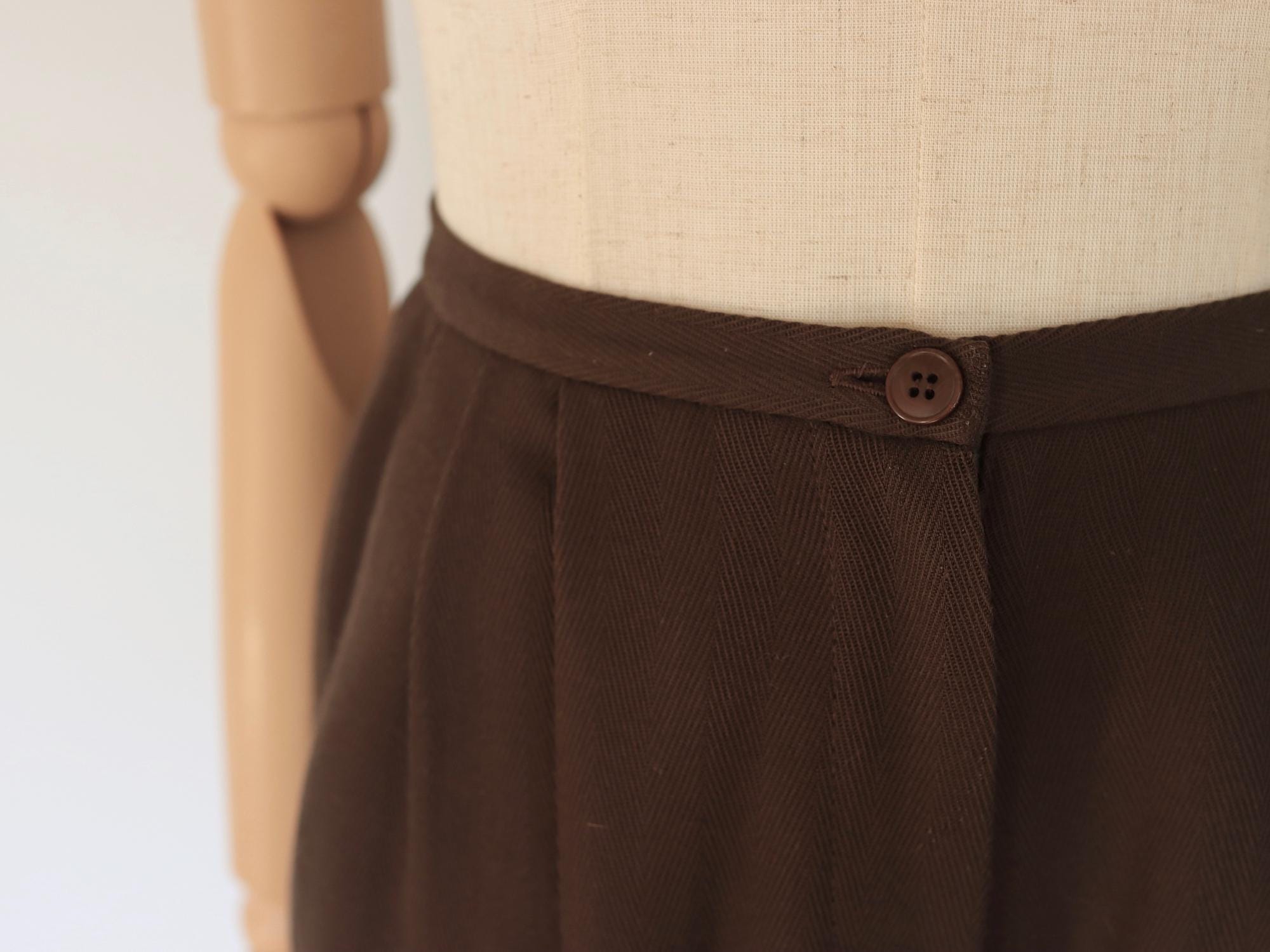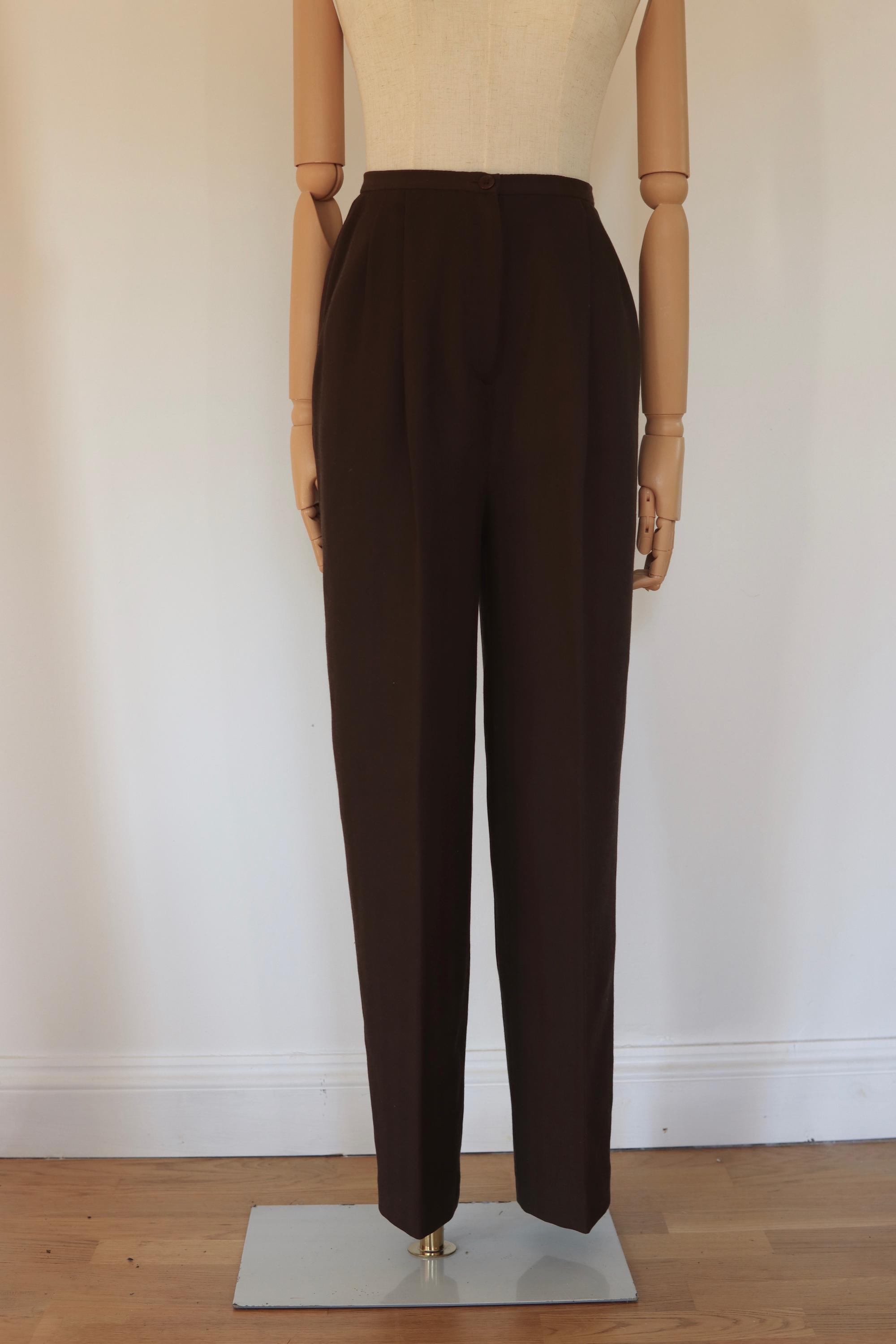 Laura Ashley brown herringbone pure wool trousers with double pleats, front button and zip fly, pockets, one back pocket, high waist, tapered leg, fully lined.
