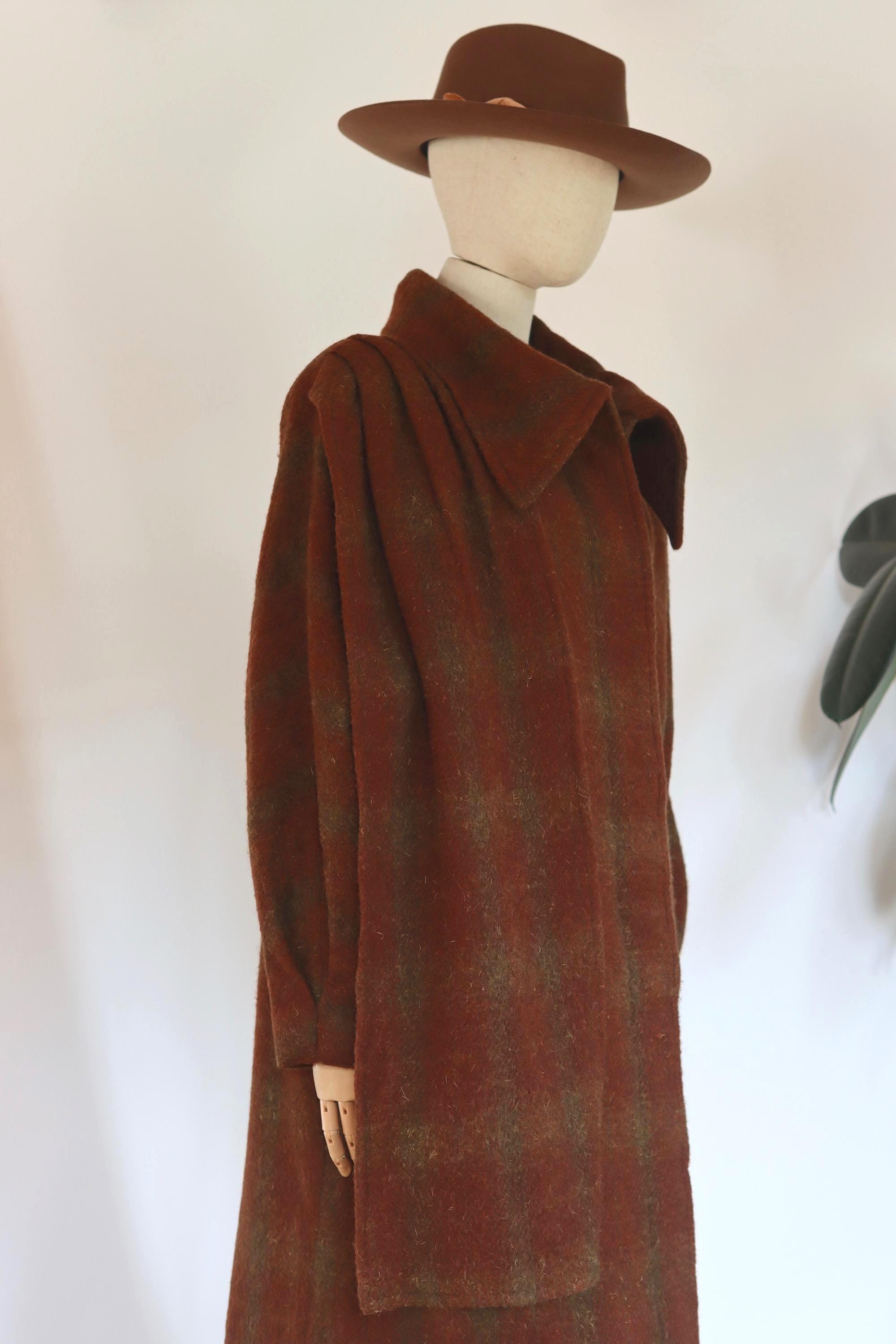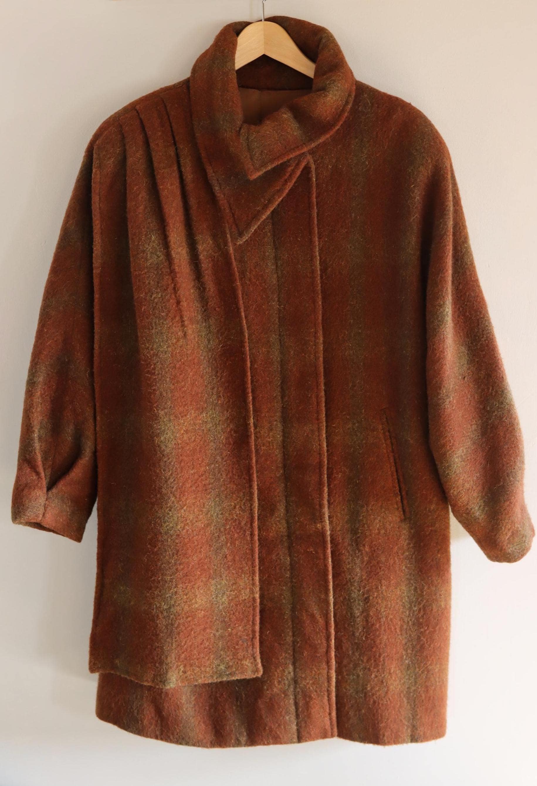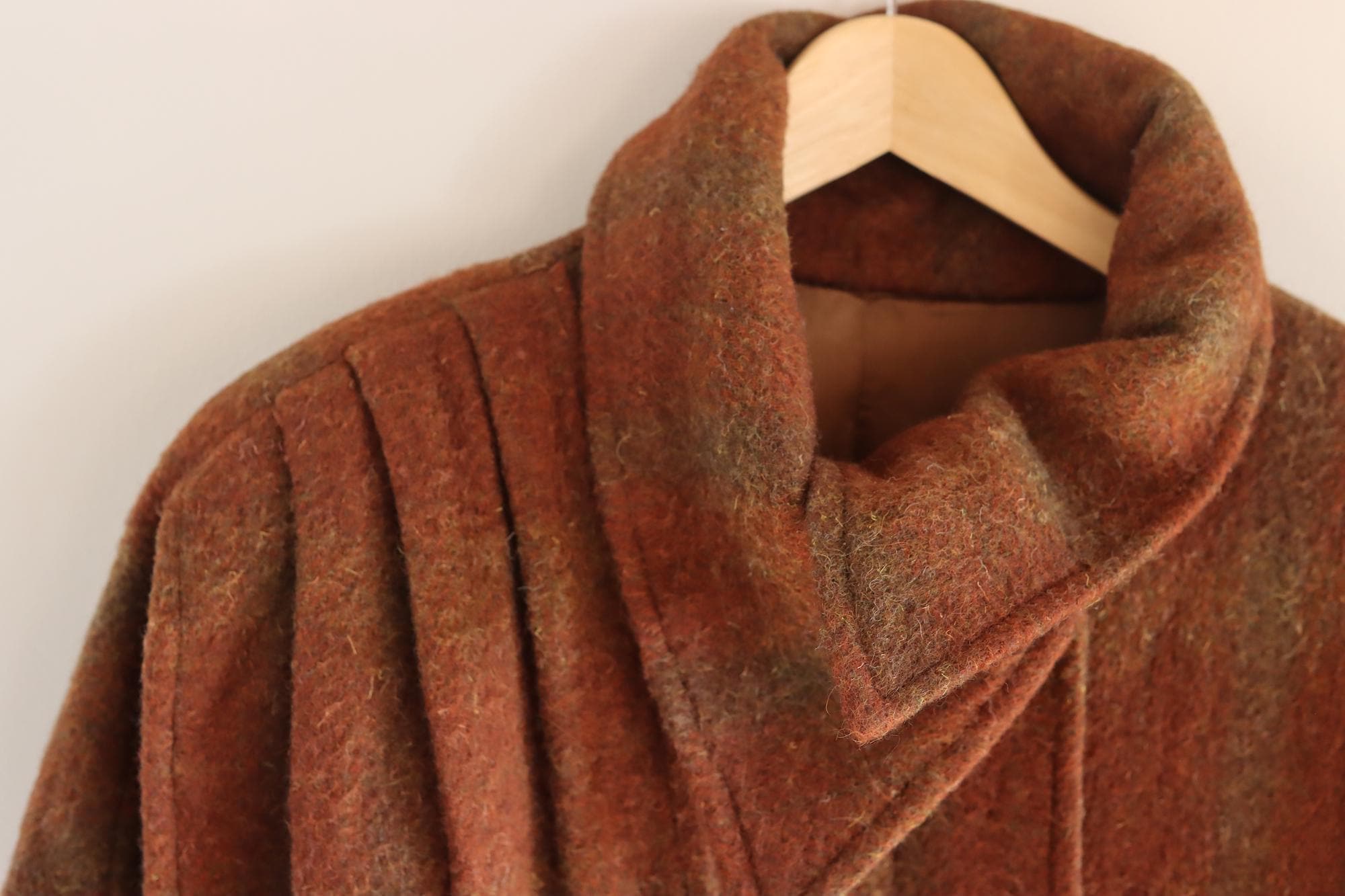 Vintage 80's wool blend coat with padding on the shoulders, a side scarf which is pleated from the shoulder and hangs down the right side, the cuffs are also pleated and there are two pockets and hidden front buttons. The lining is a rich brown colour and in good condition.