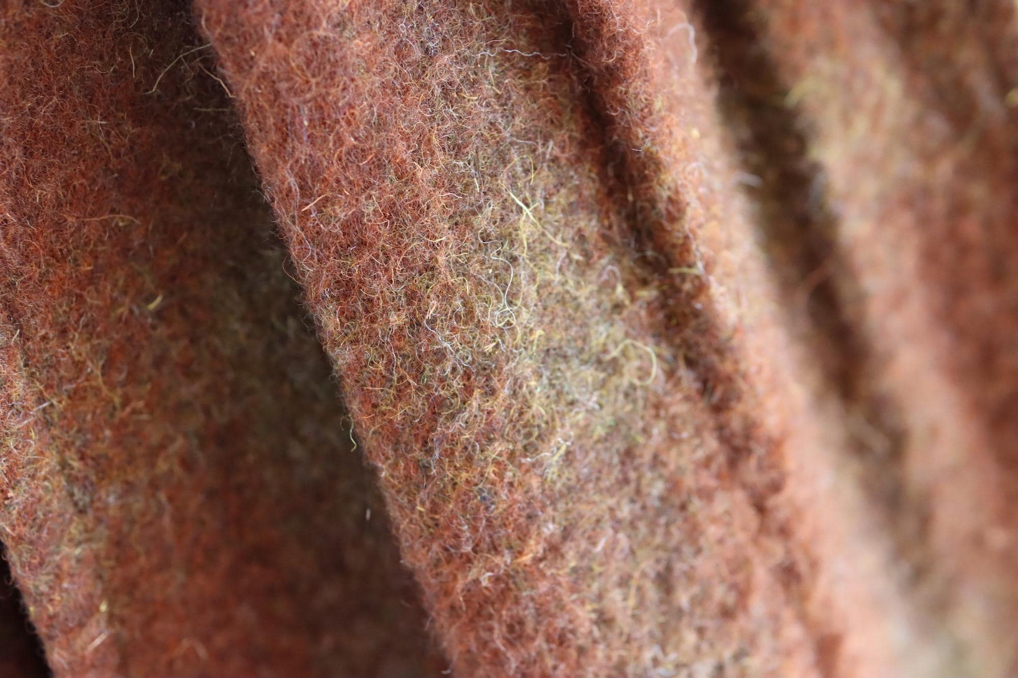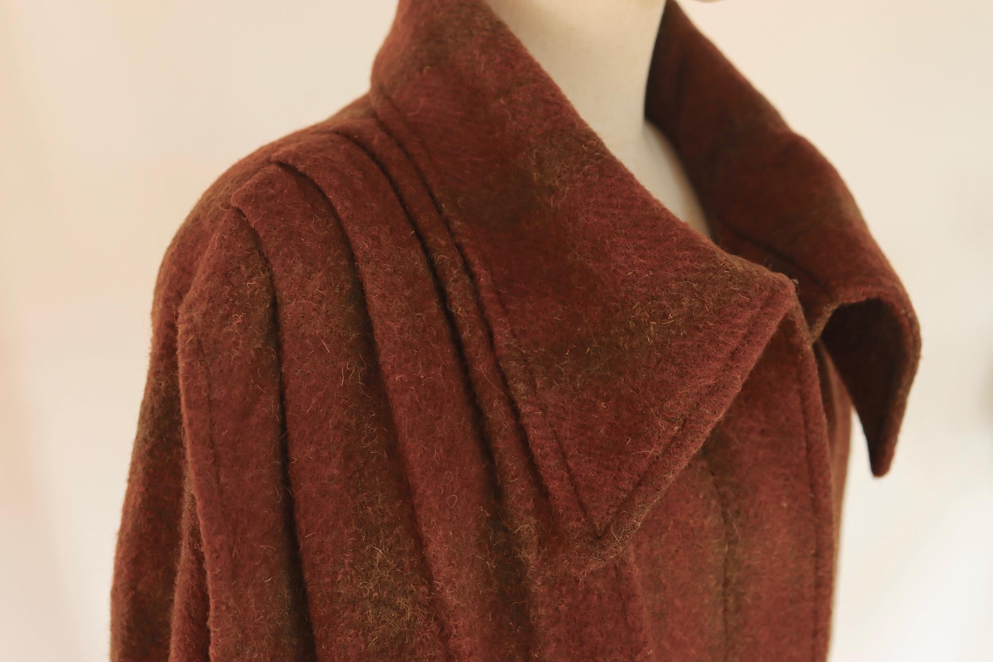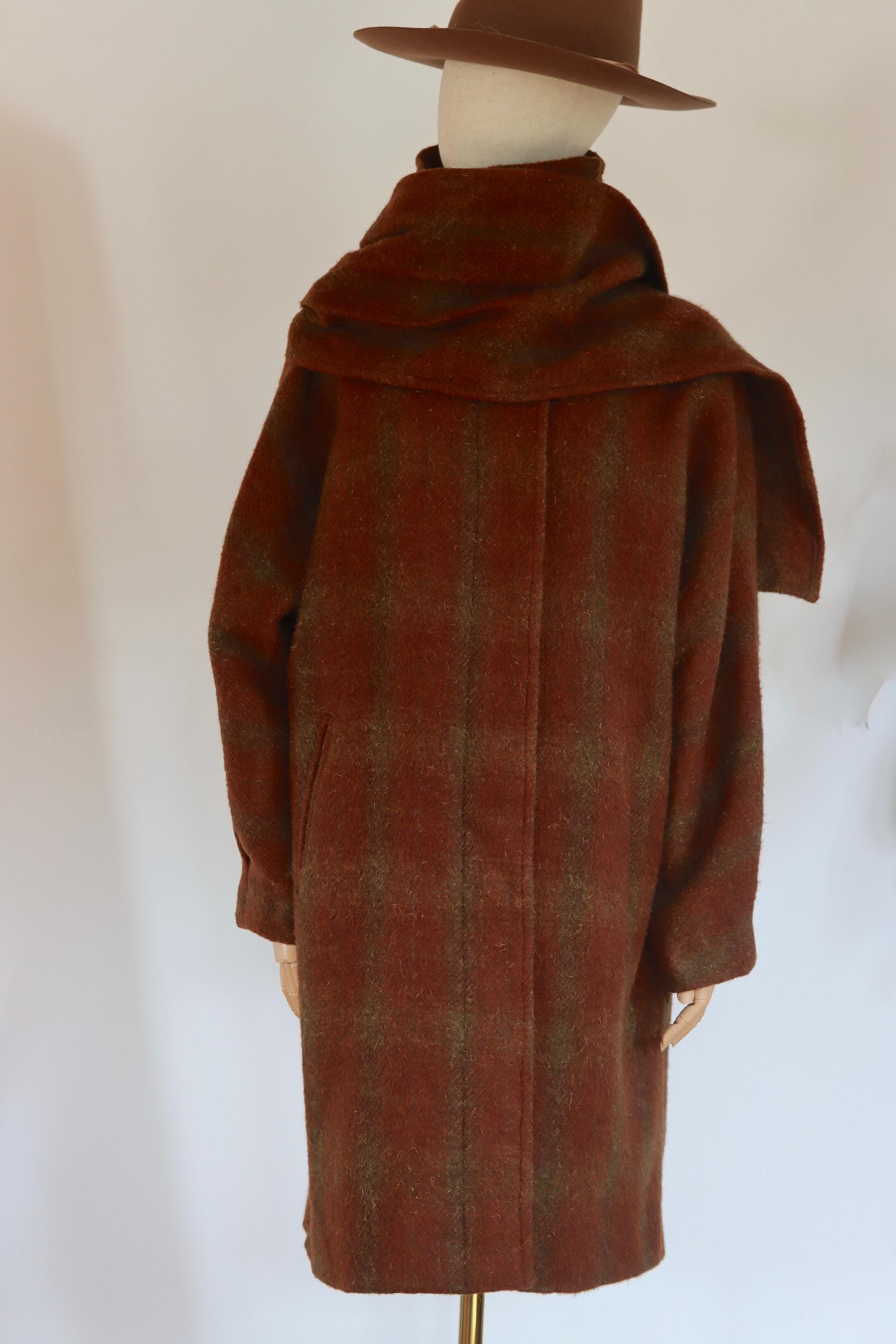 Vintage 80's wool blend coat with padding on the shoulders, a side scarf which is pleated from the shoulder and hangs down the right side, the cuffs are also pleated and there are two pockets and hidden front buttons. The lining is a rich brown colour and in good condition.