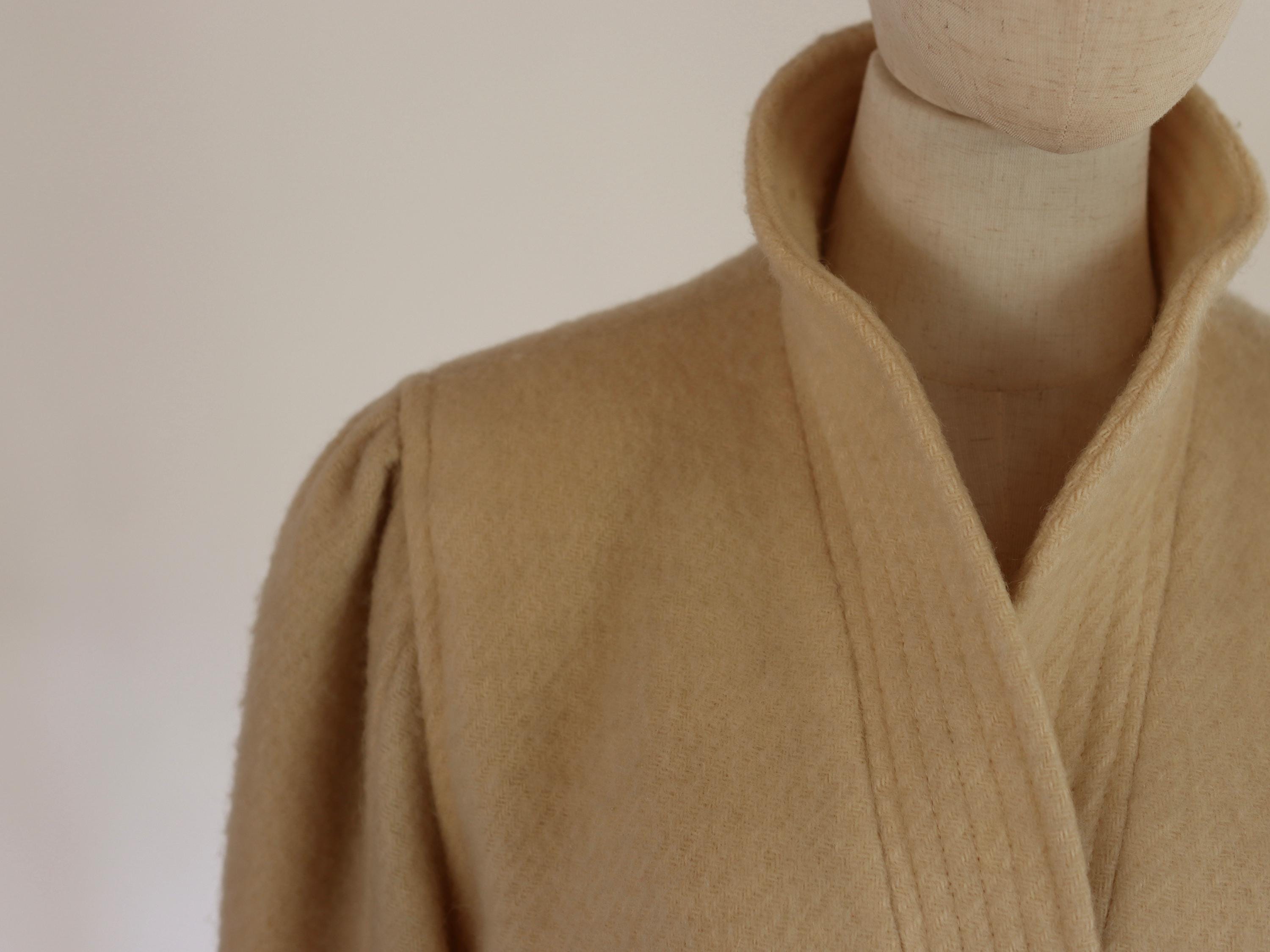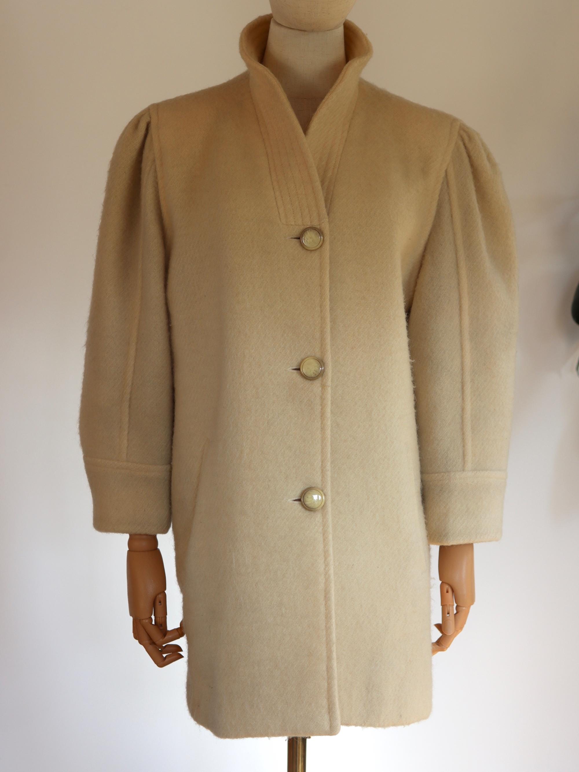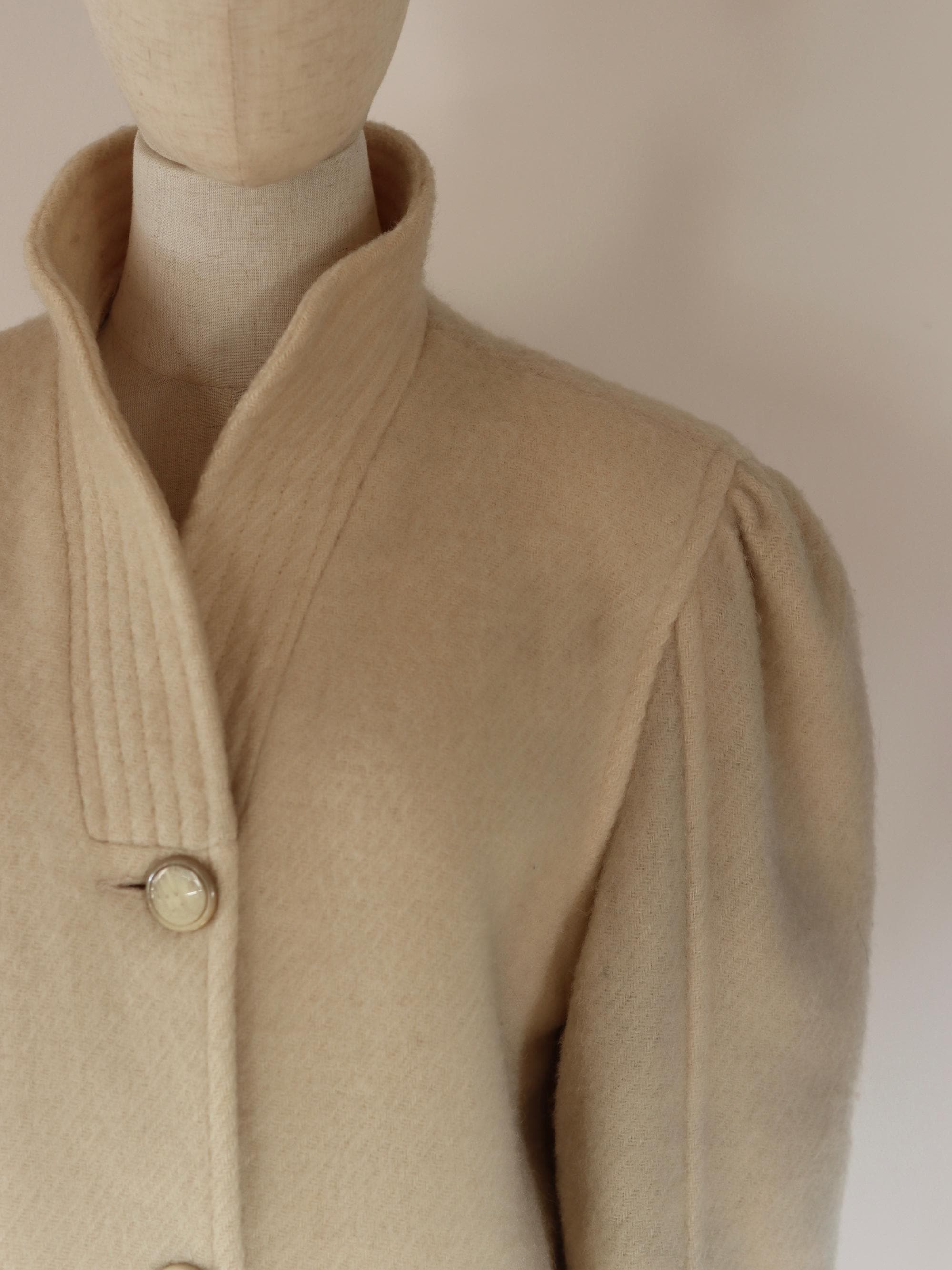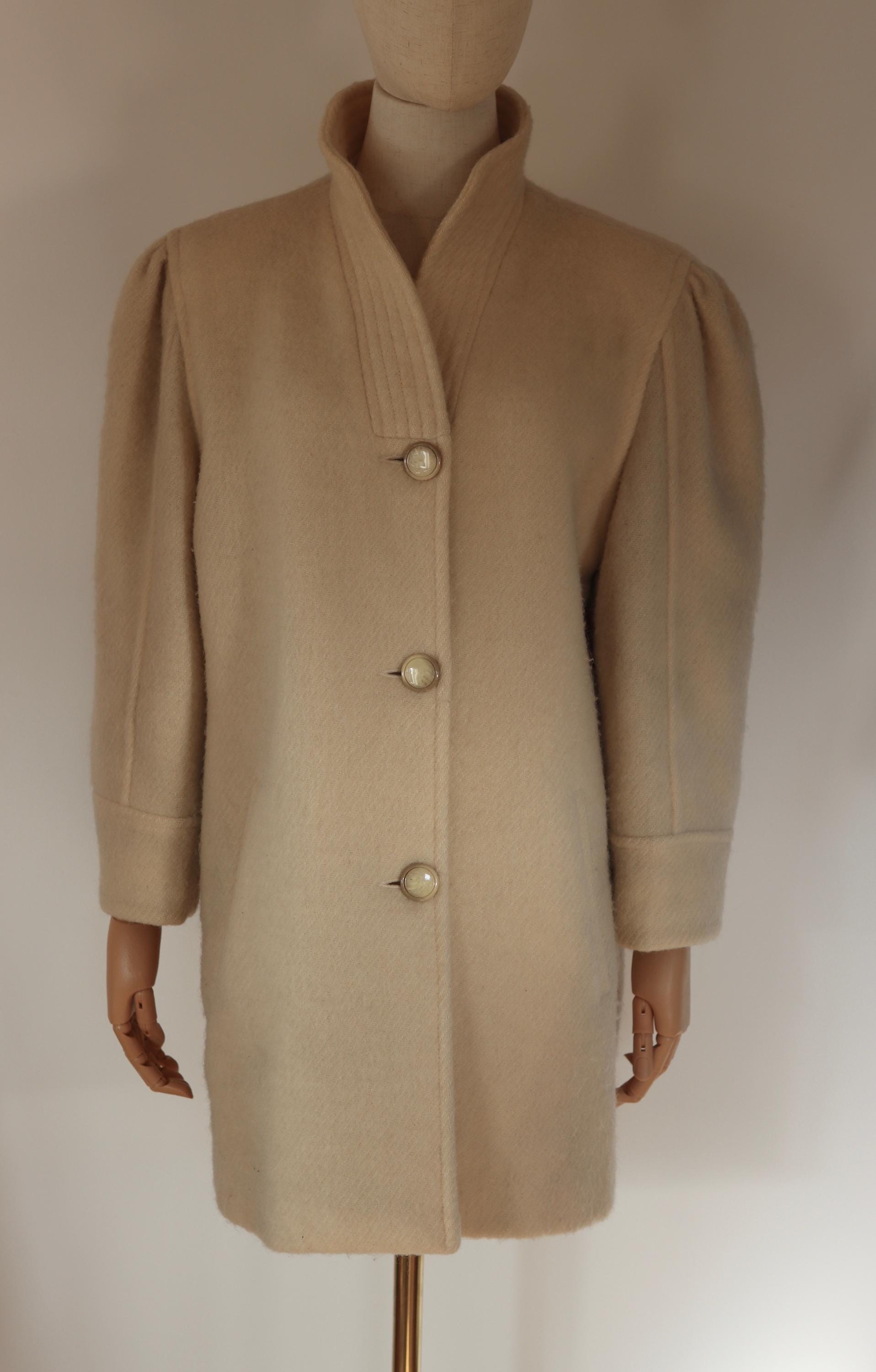 Cream pure wool mid-length coat with puff shoulders and a high collar, fully lined and with pockets.