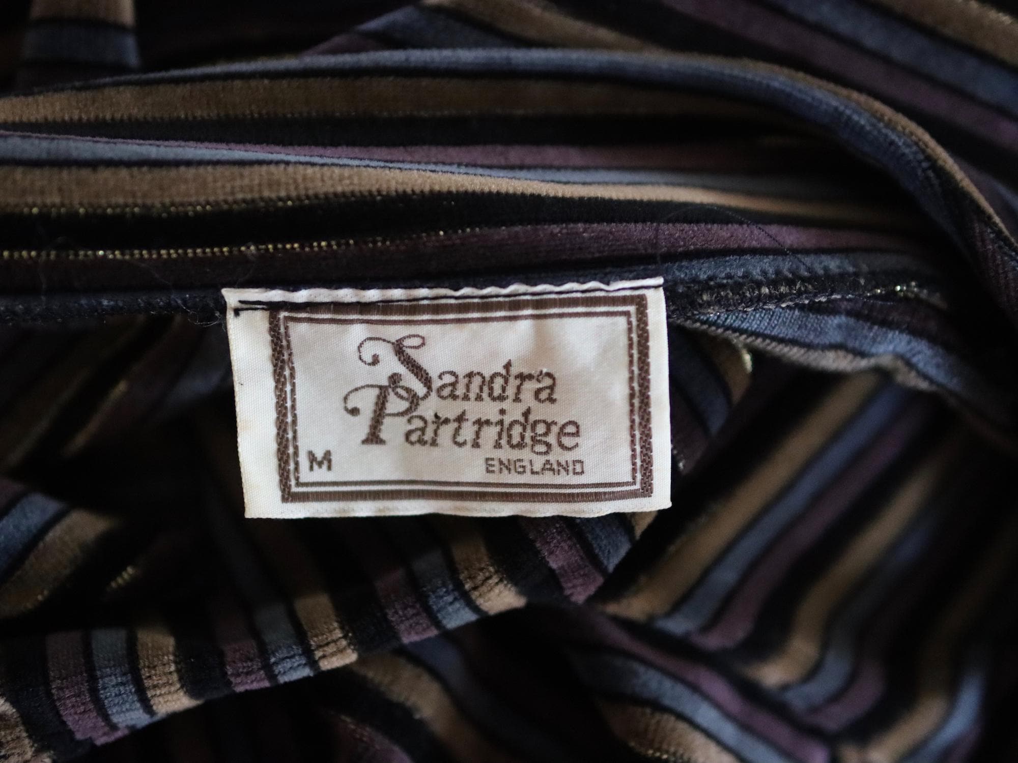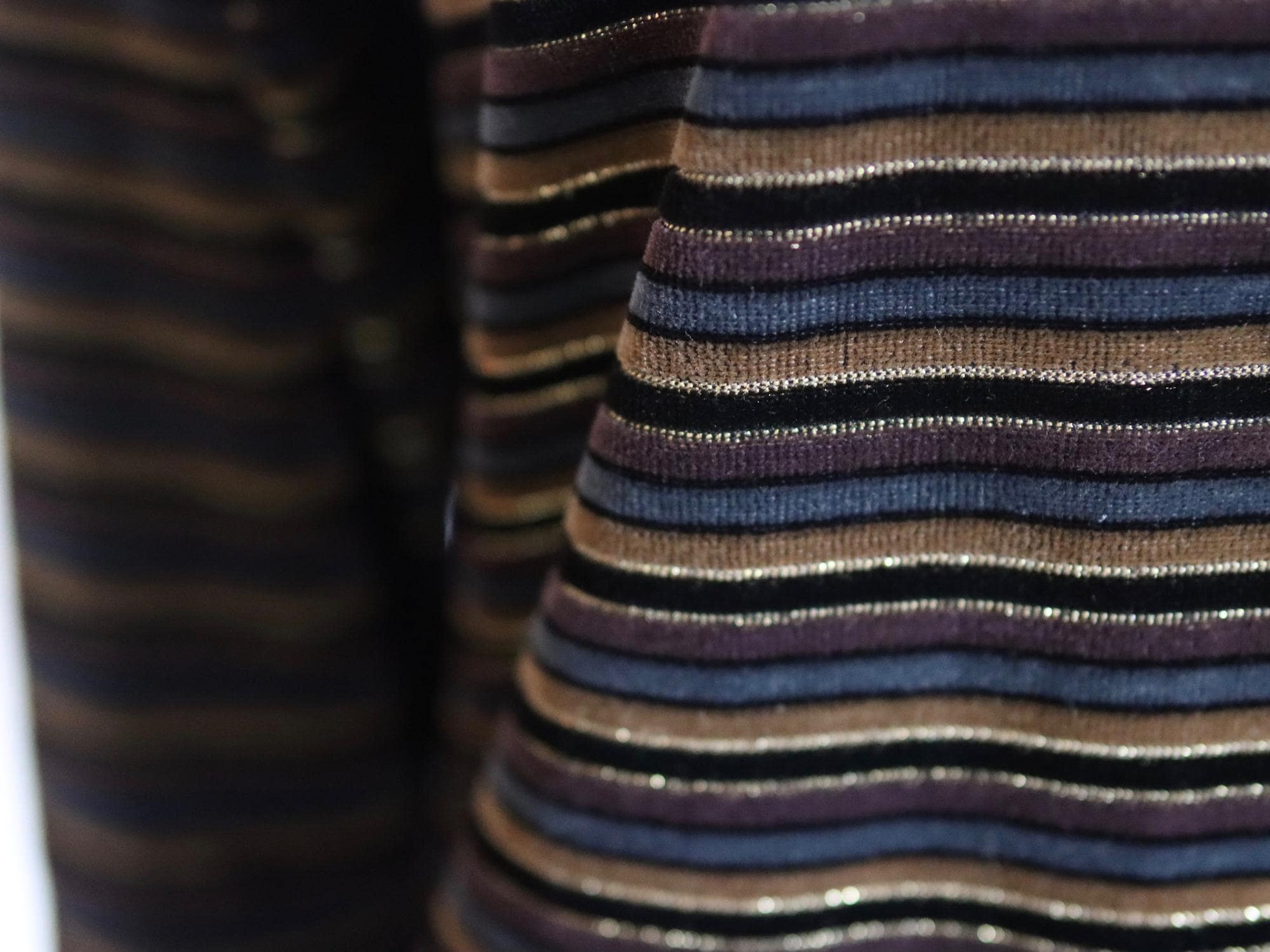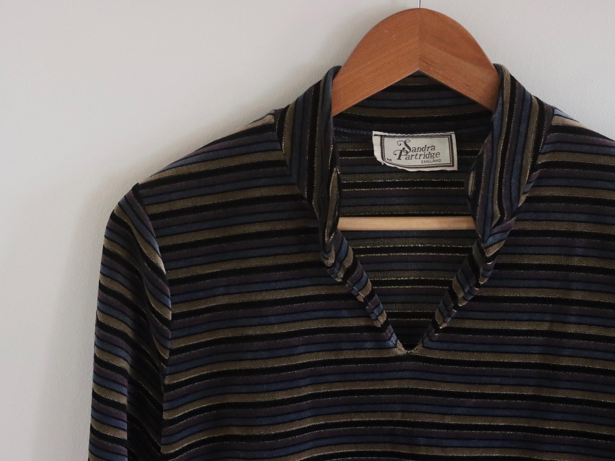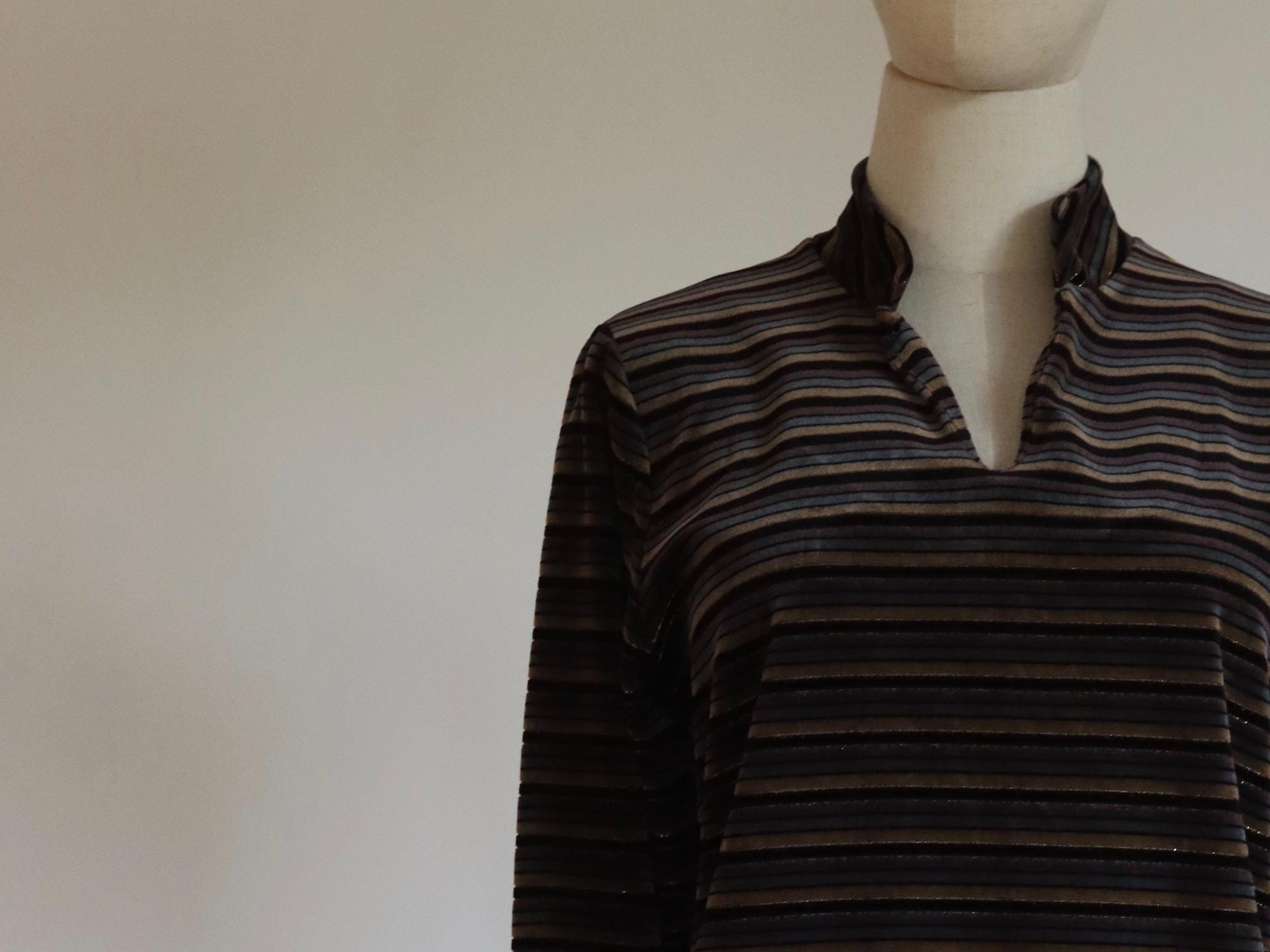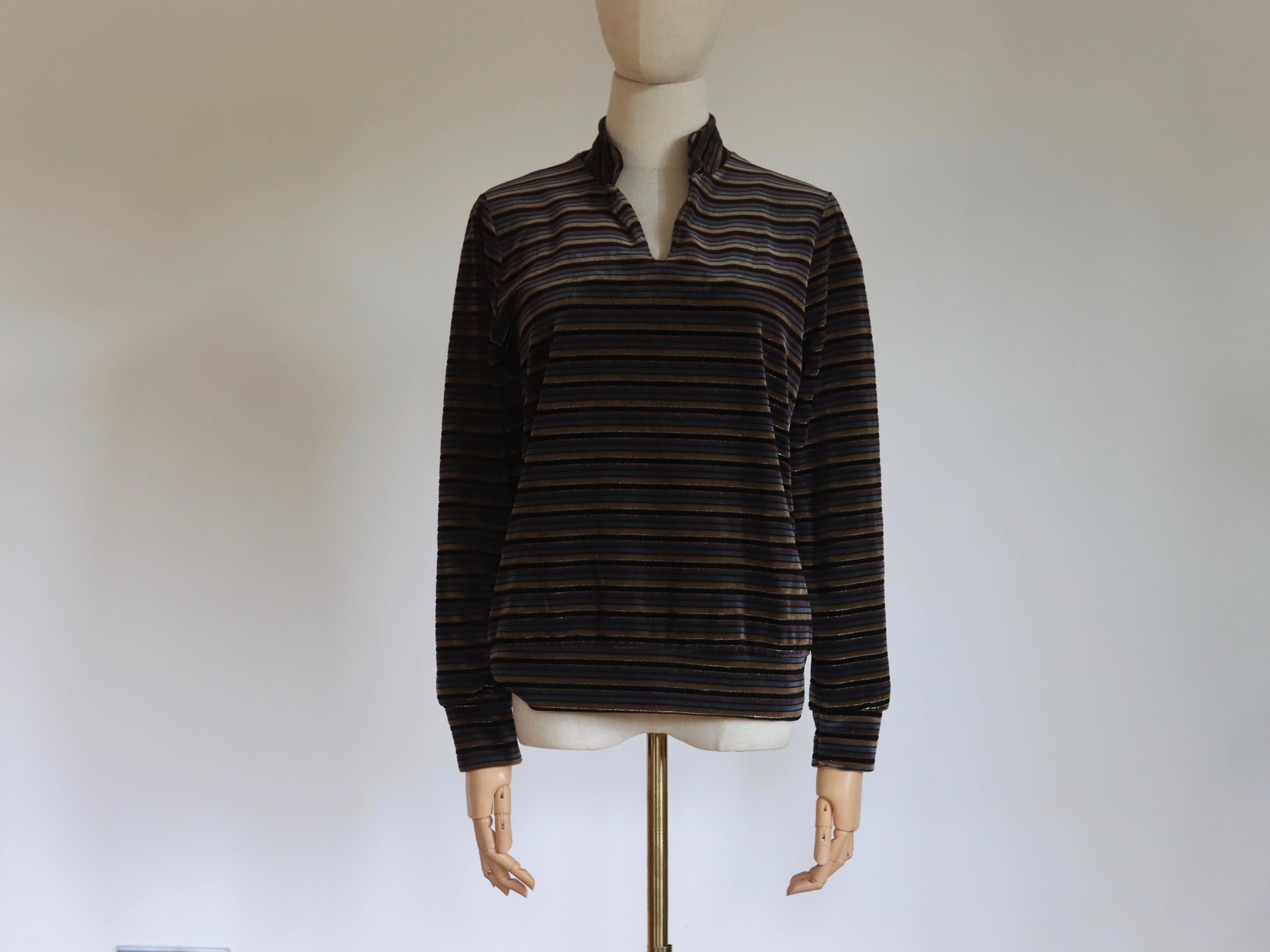 Long sleeve vintage velour stripe pullover top with a gold metallic thread running through the stripe.