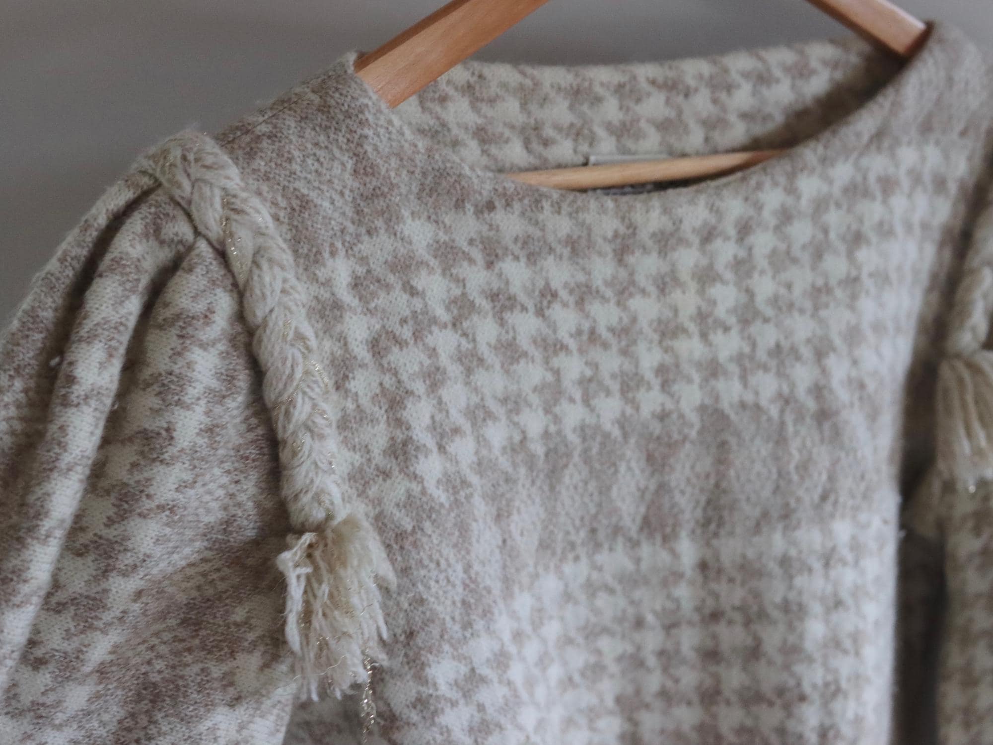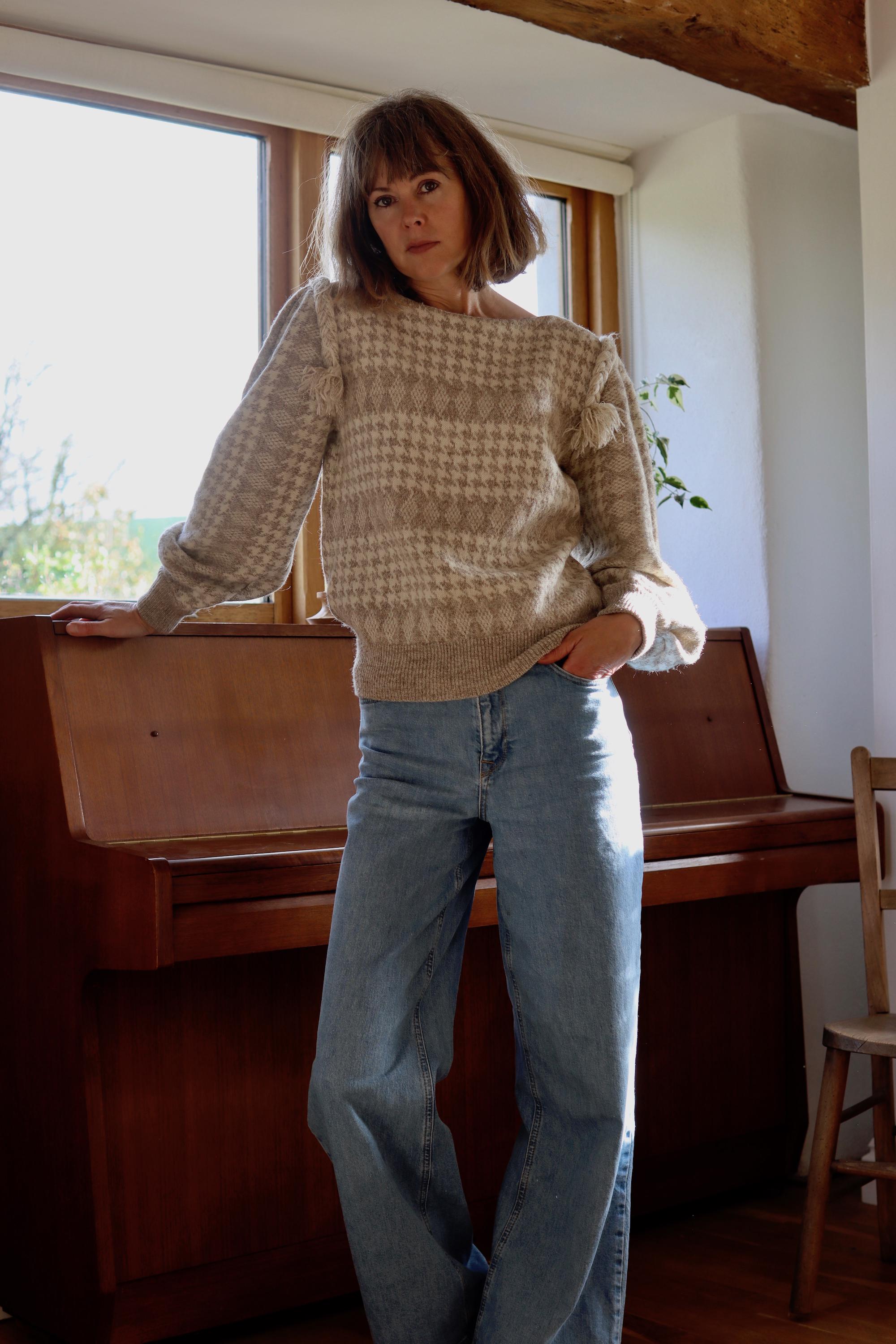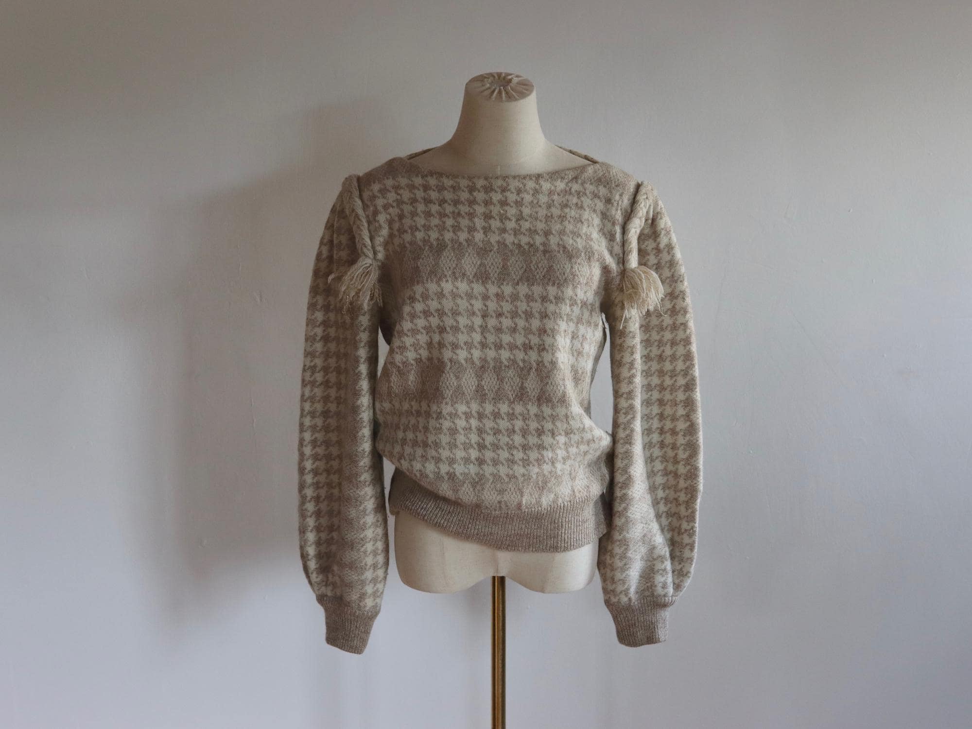 Dogtooth alpaca blend jumper with plait and tassel detail and ruched shoulders. Such a great original by 1980s Escada.