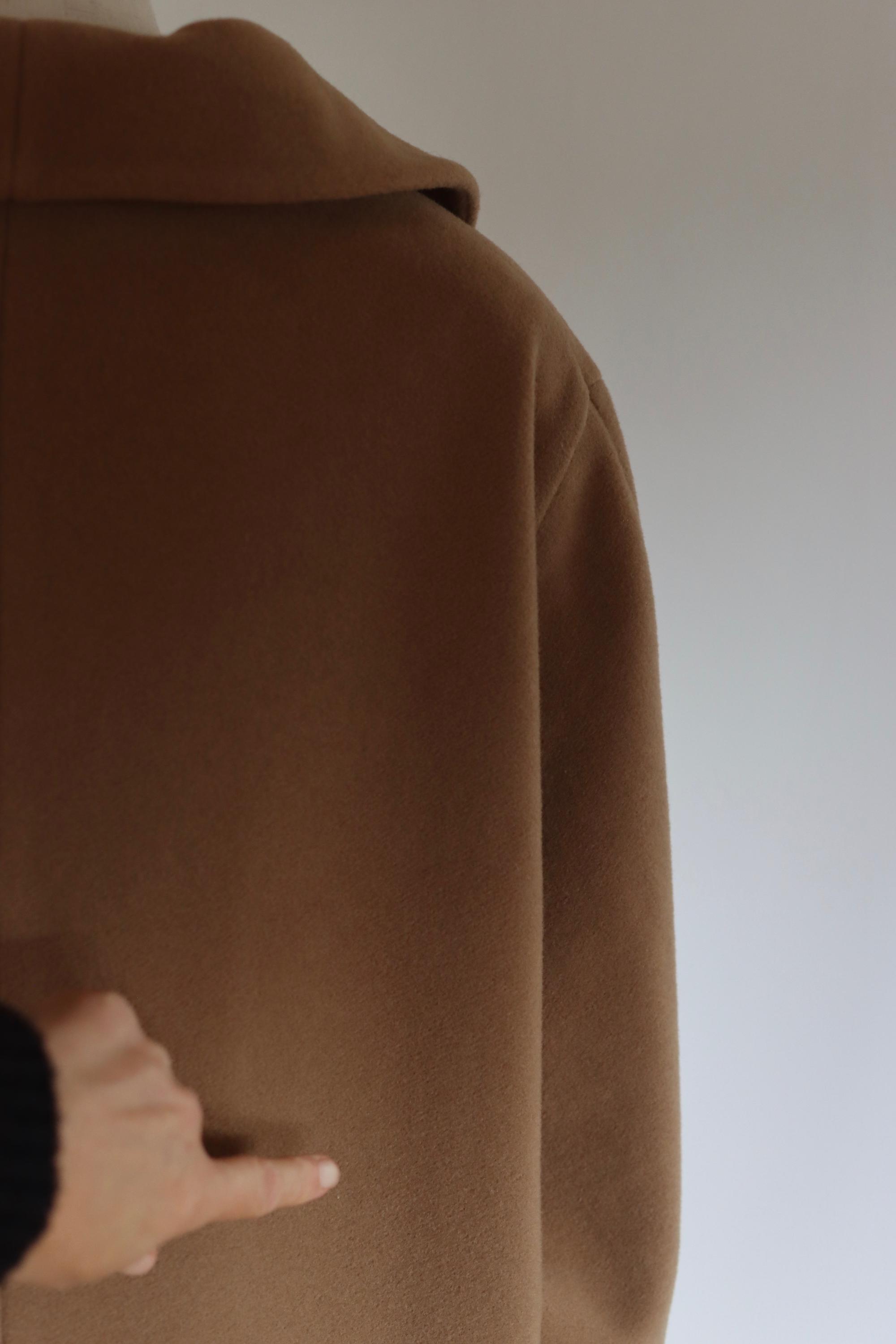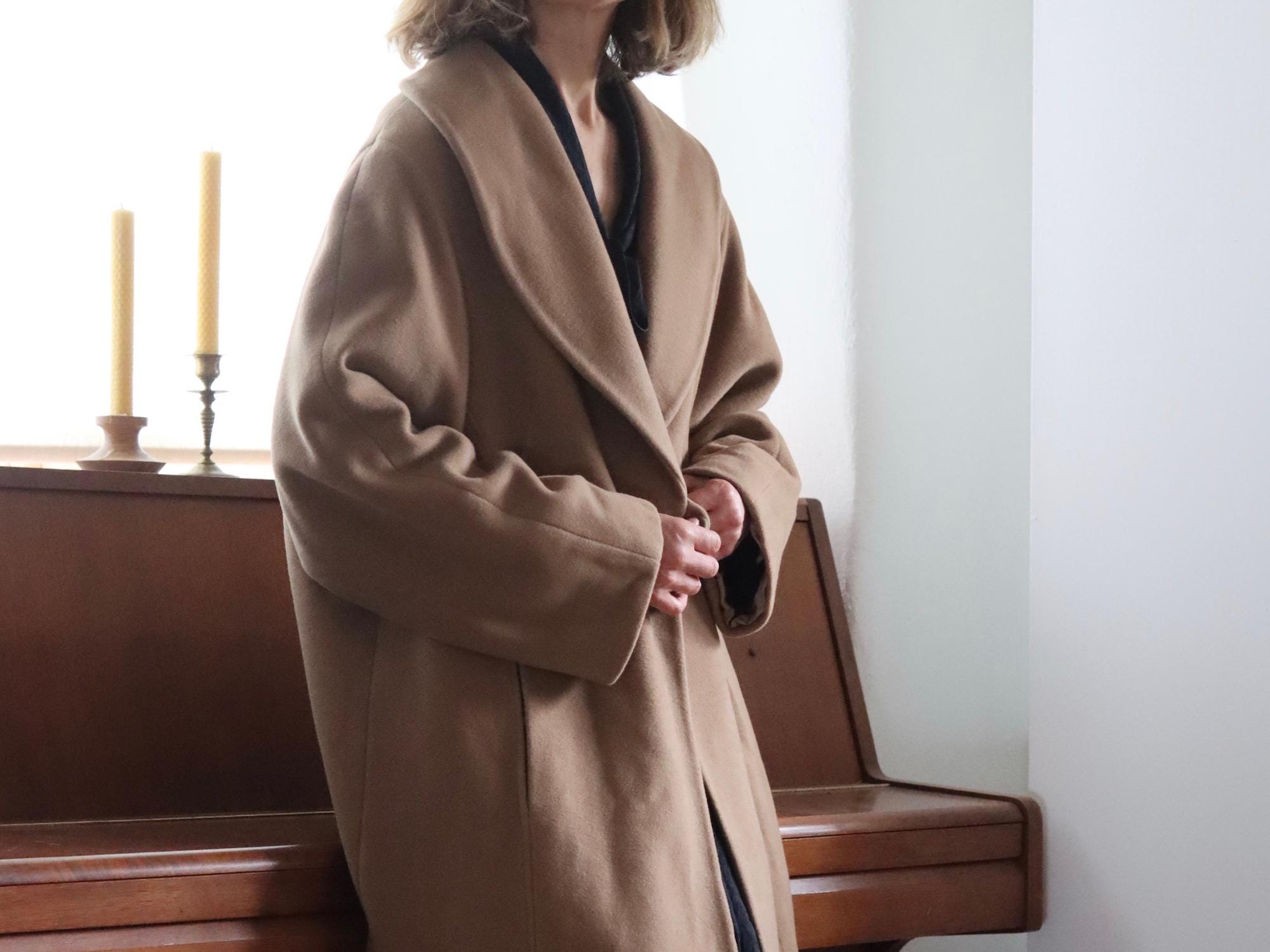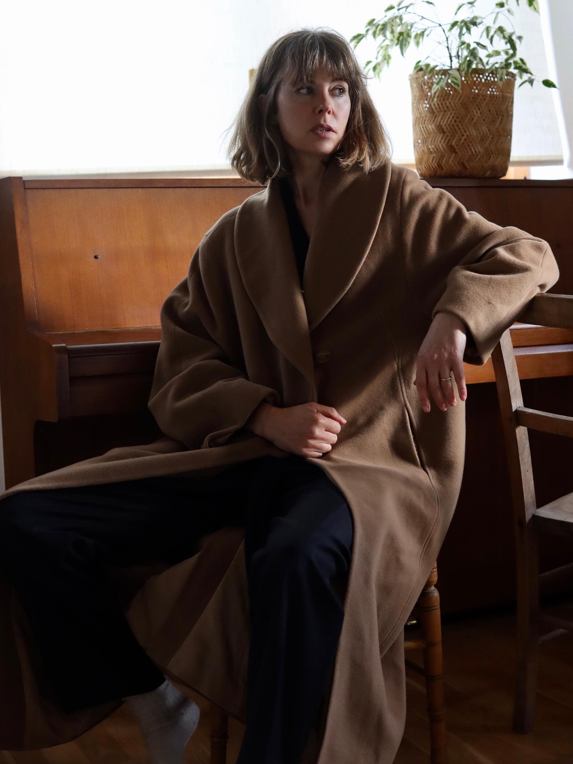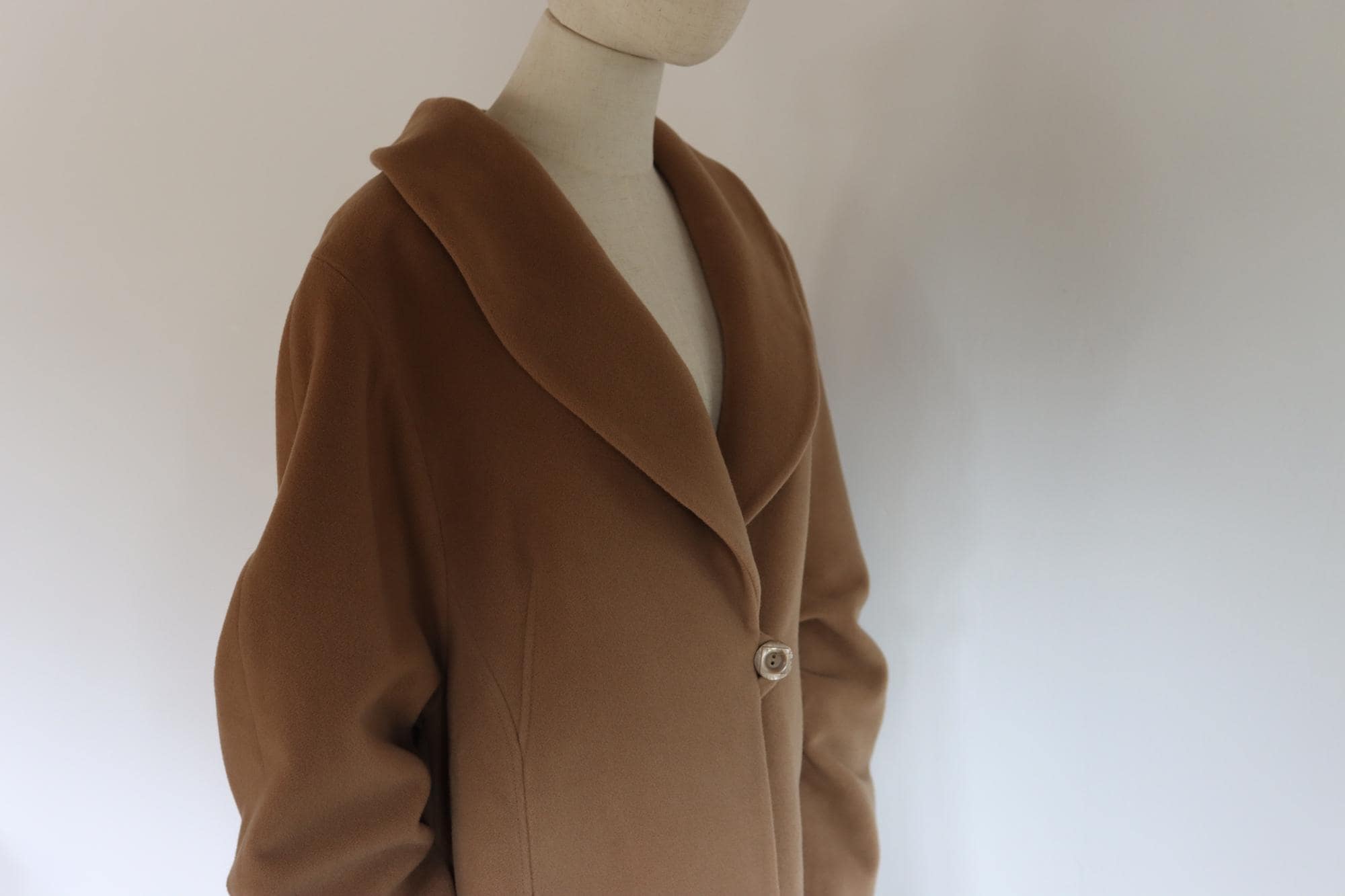 Luxury wool maxi coat with single button fastening and flat front pockets and large shawl collar.