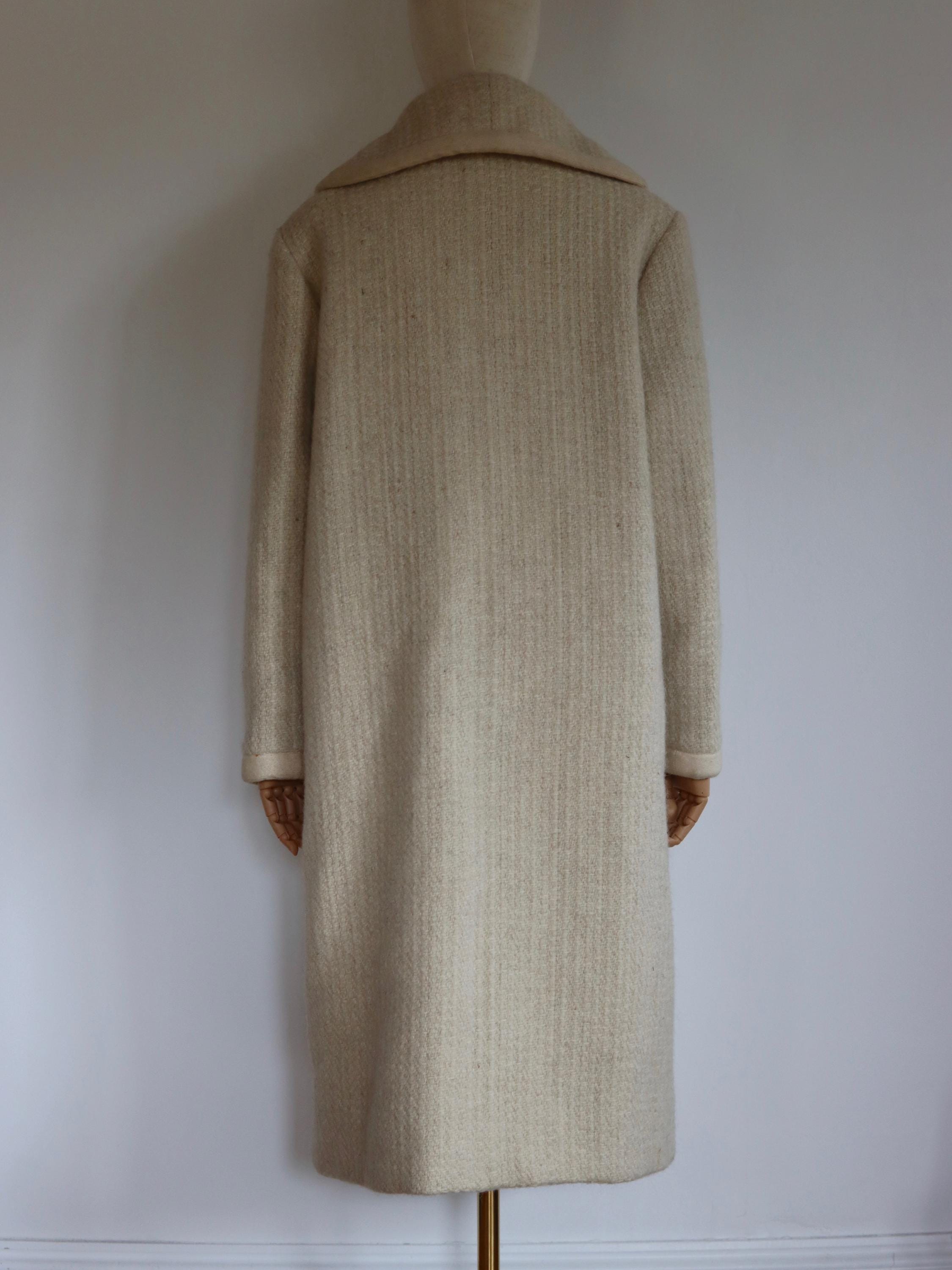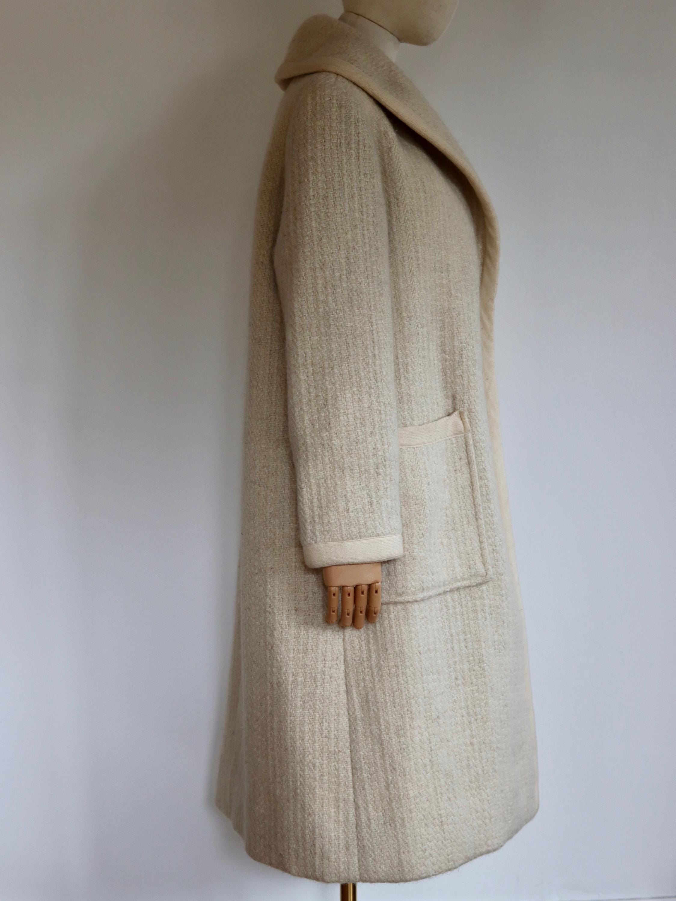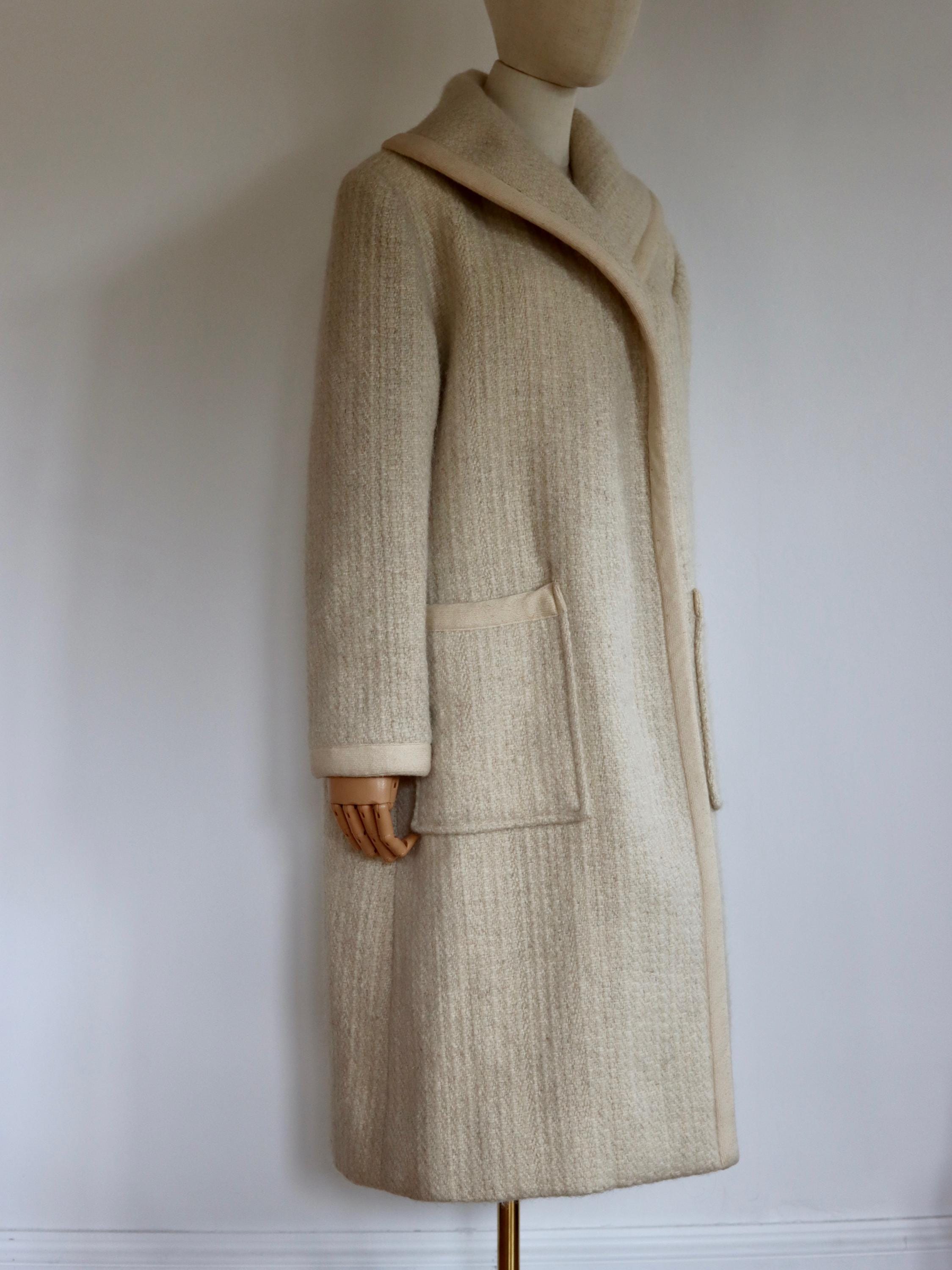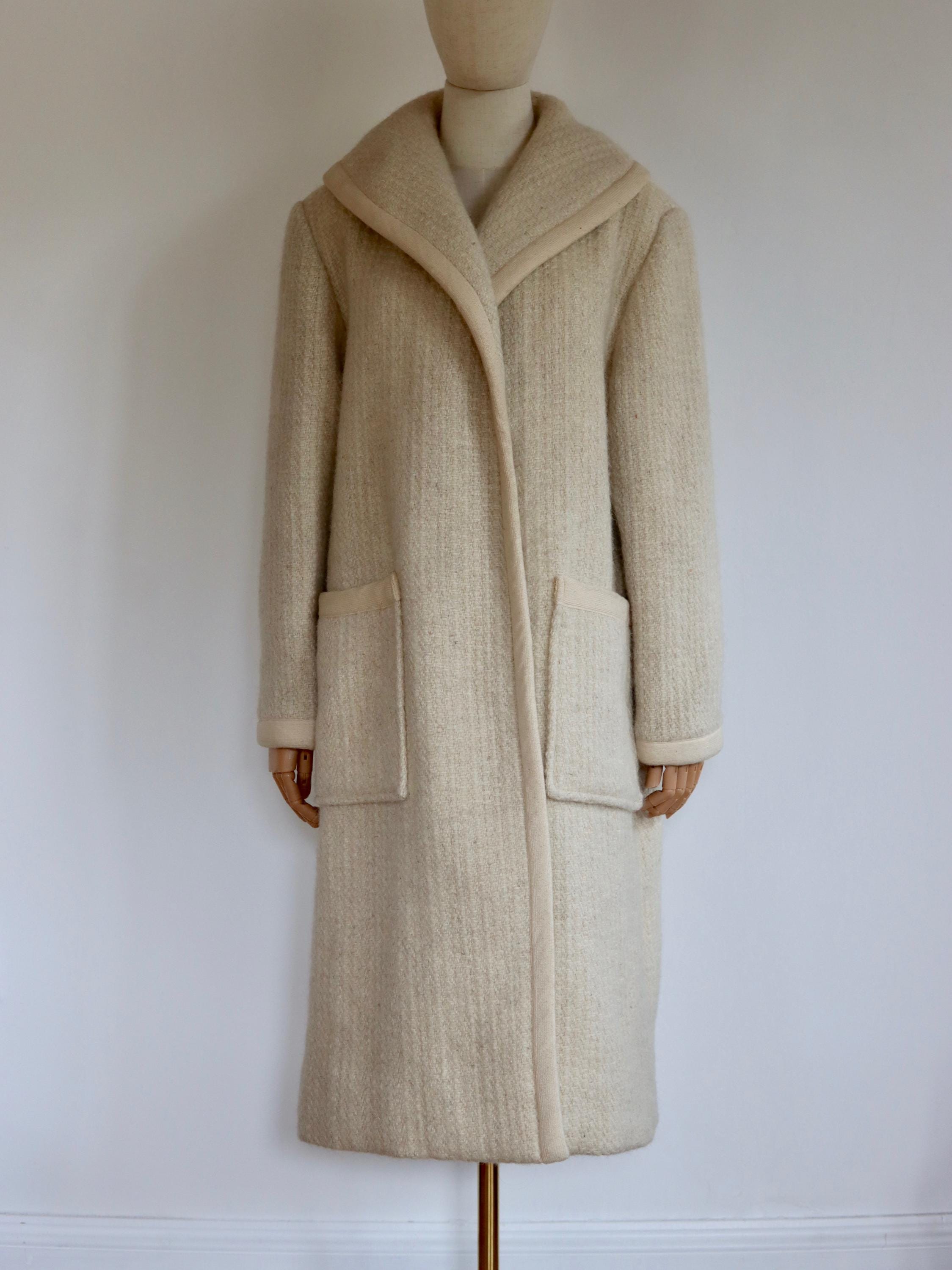 Pure wool heavy cream coat with shawl collar and deep pockets, fastens by a popper and a hidden tie closure inside the coat.  No labels attached  but its in great vintage condition with some natural colour imperfections in the pure wool.
