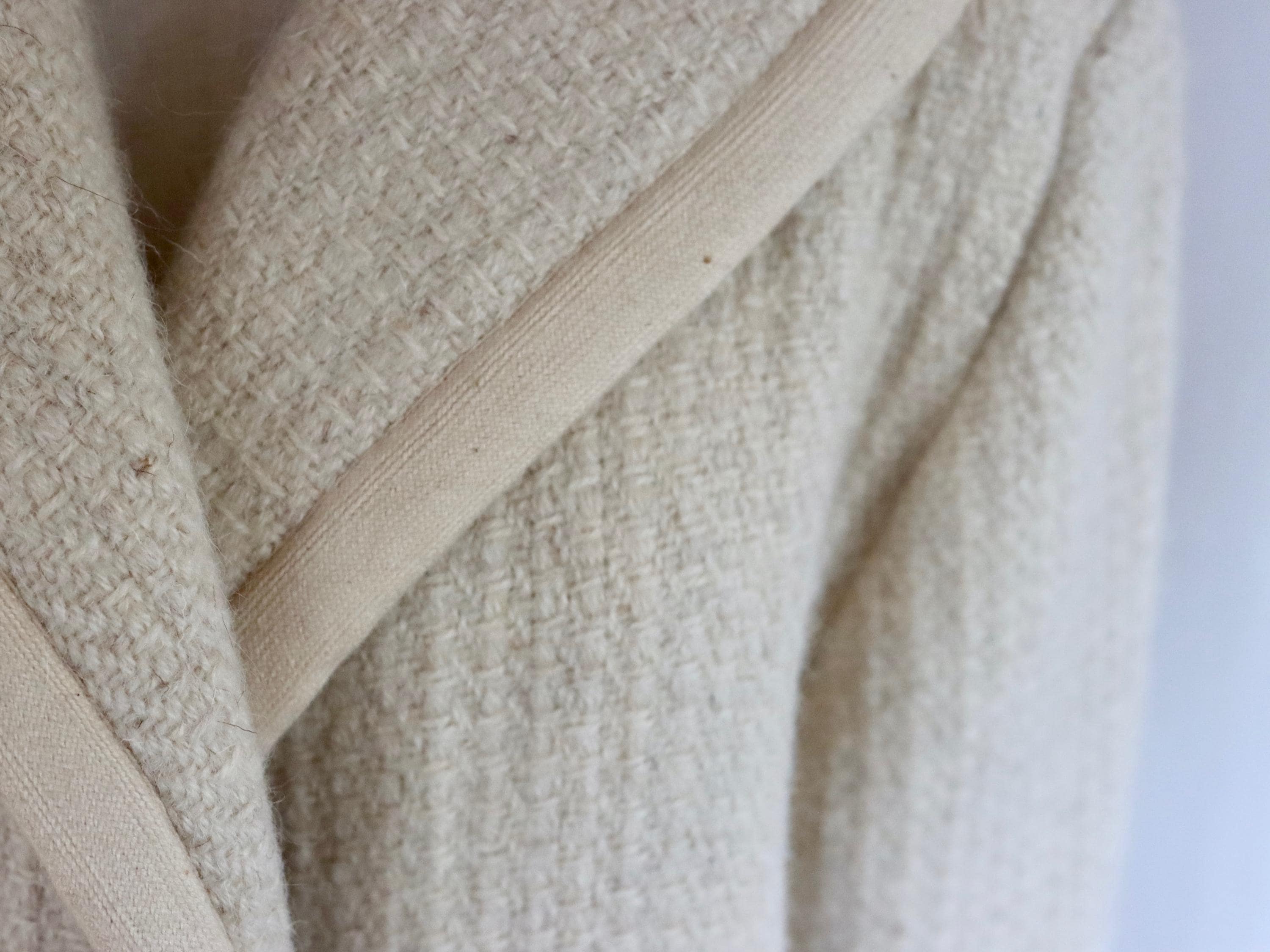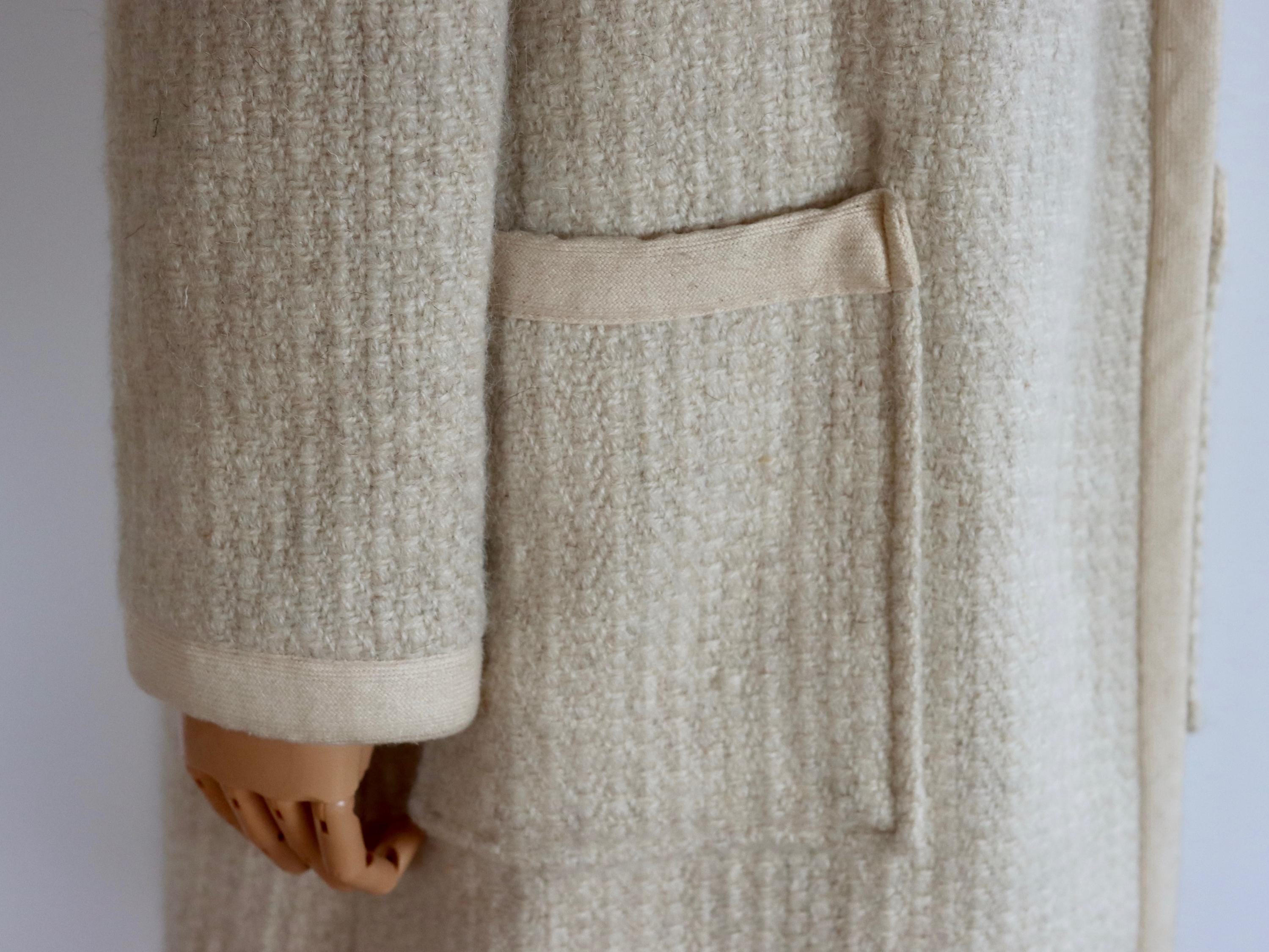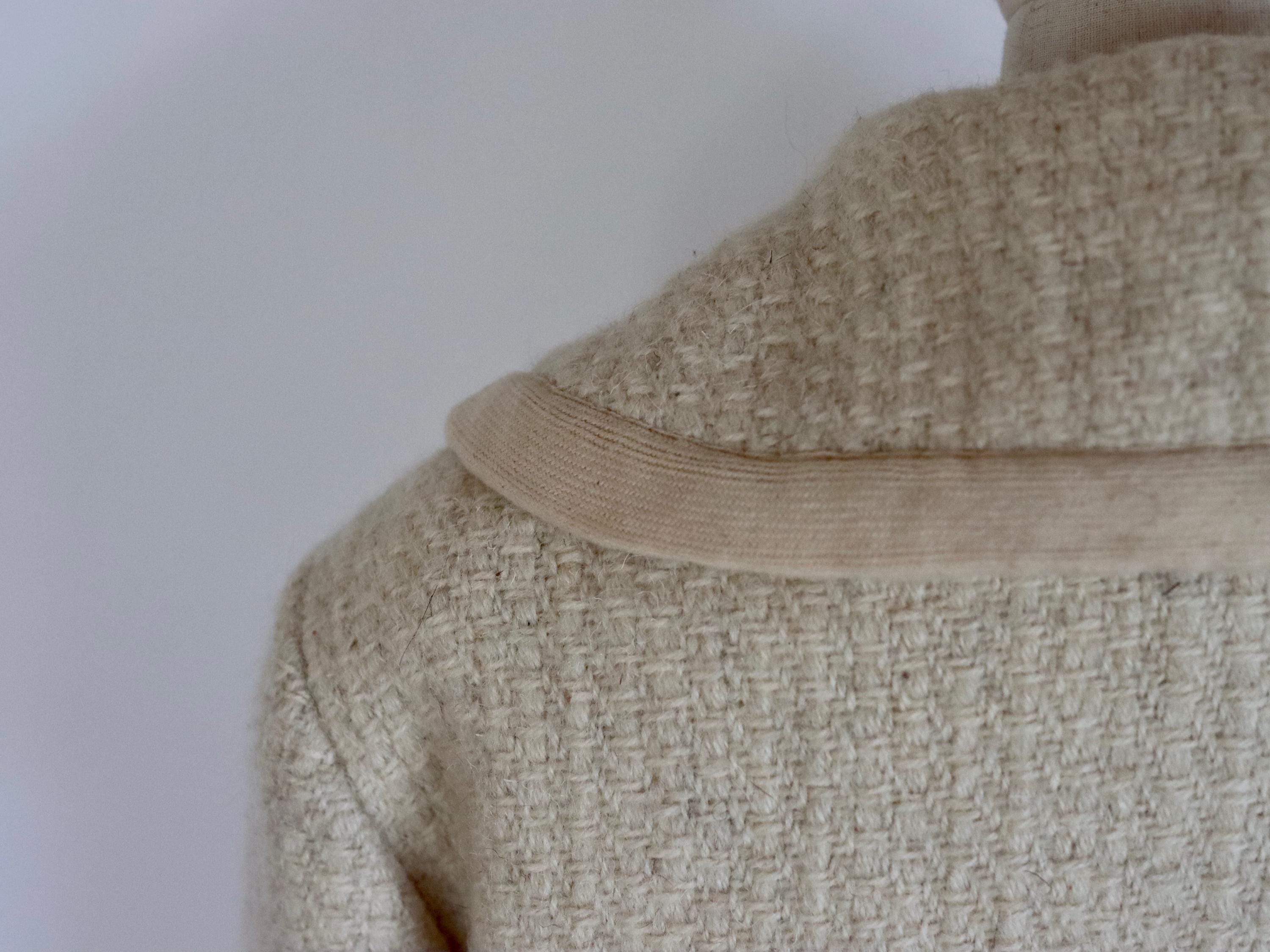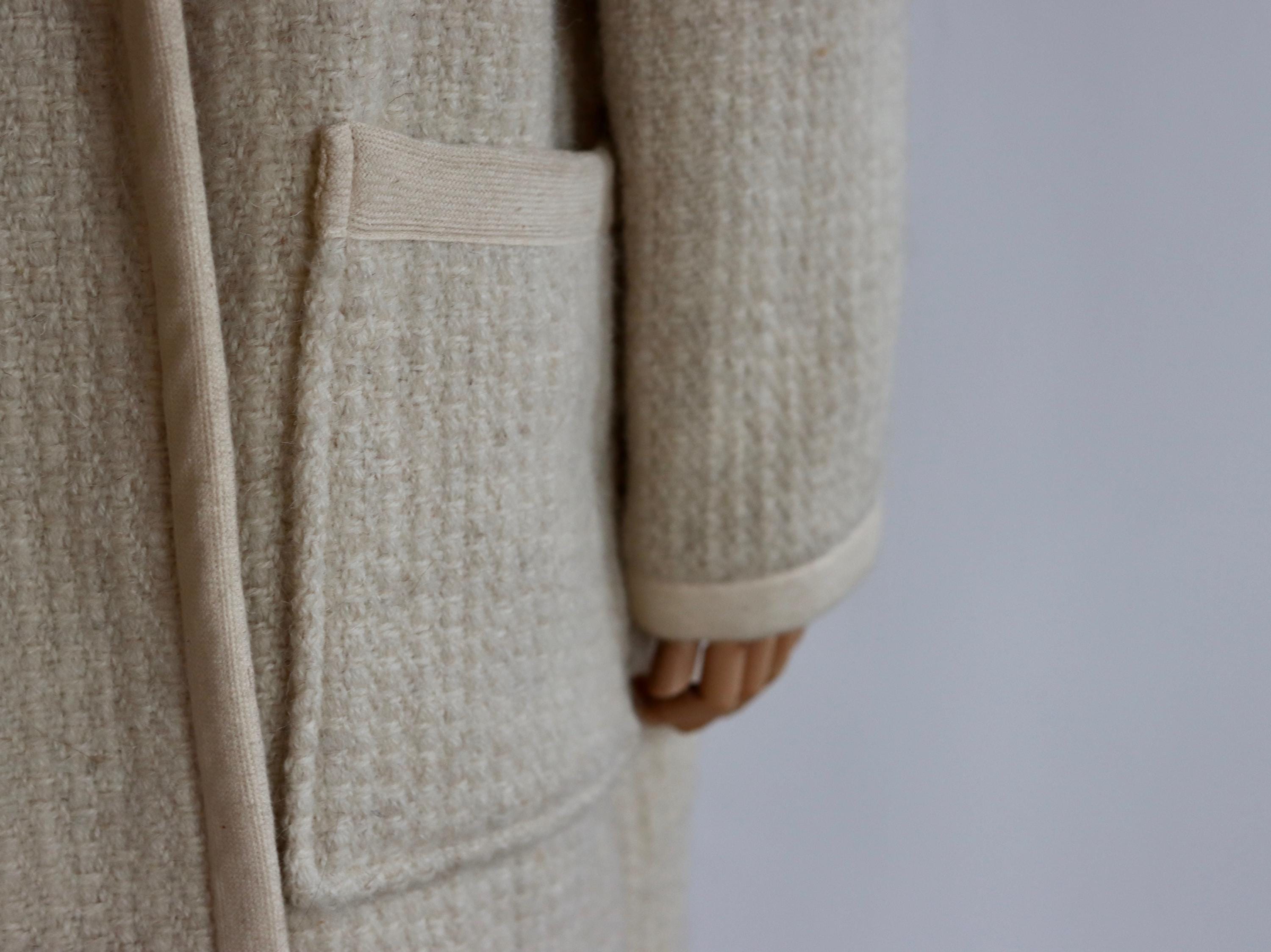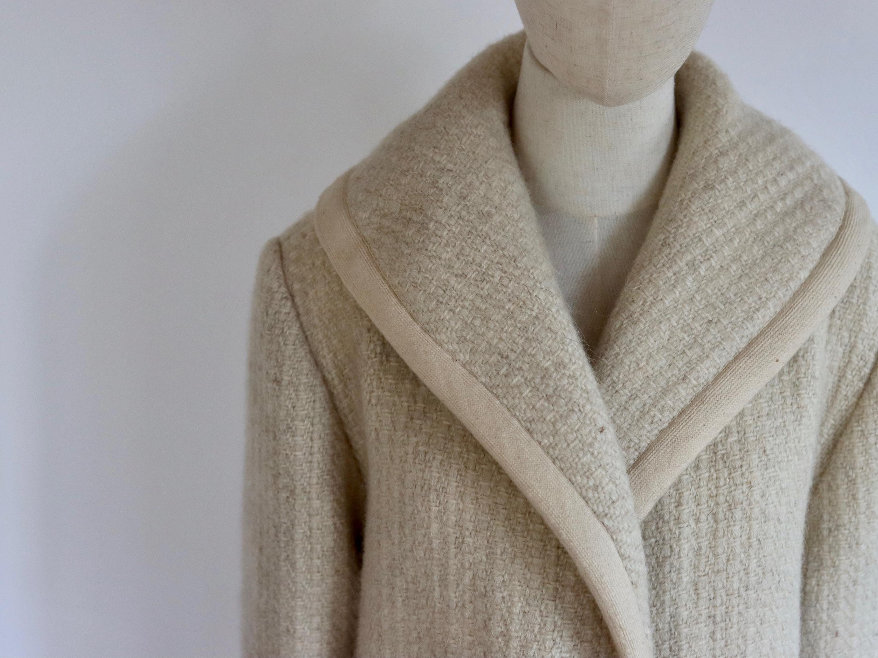 Pure wool heavy cream coat with shawl collar and deep pockets, fastens by a popper and a hidden tie closure inside the coat.  No labels attached  but its in great vintage condition with some natural colour imperfections in the pure wool.