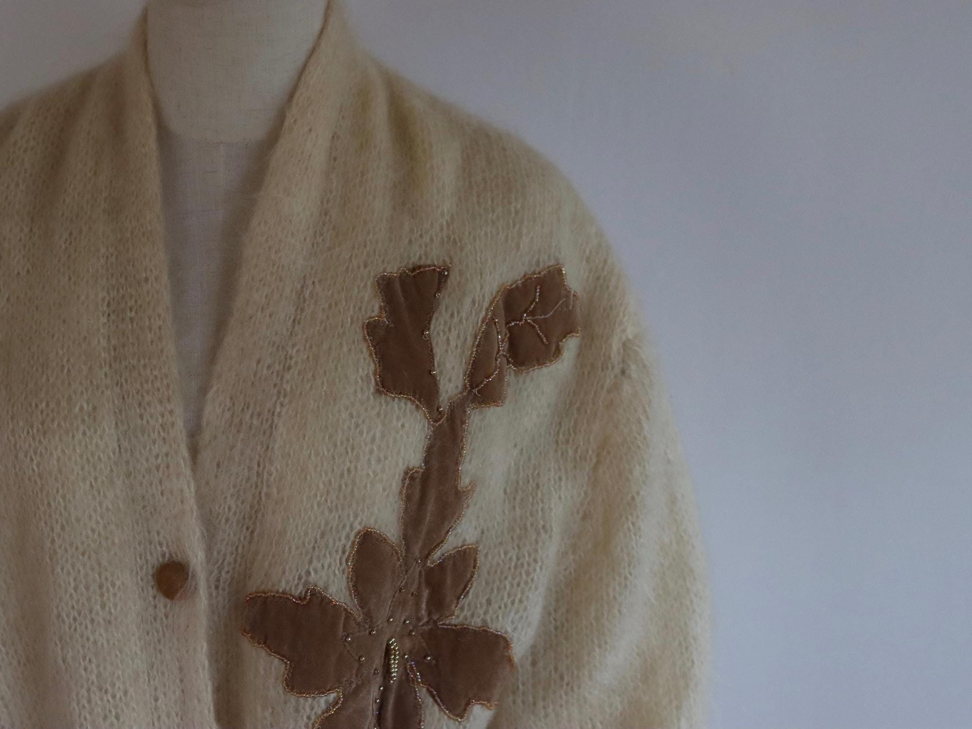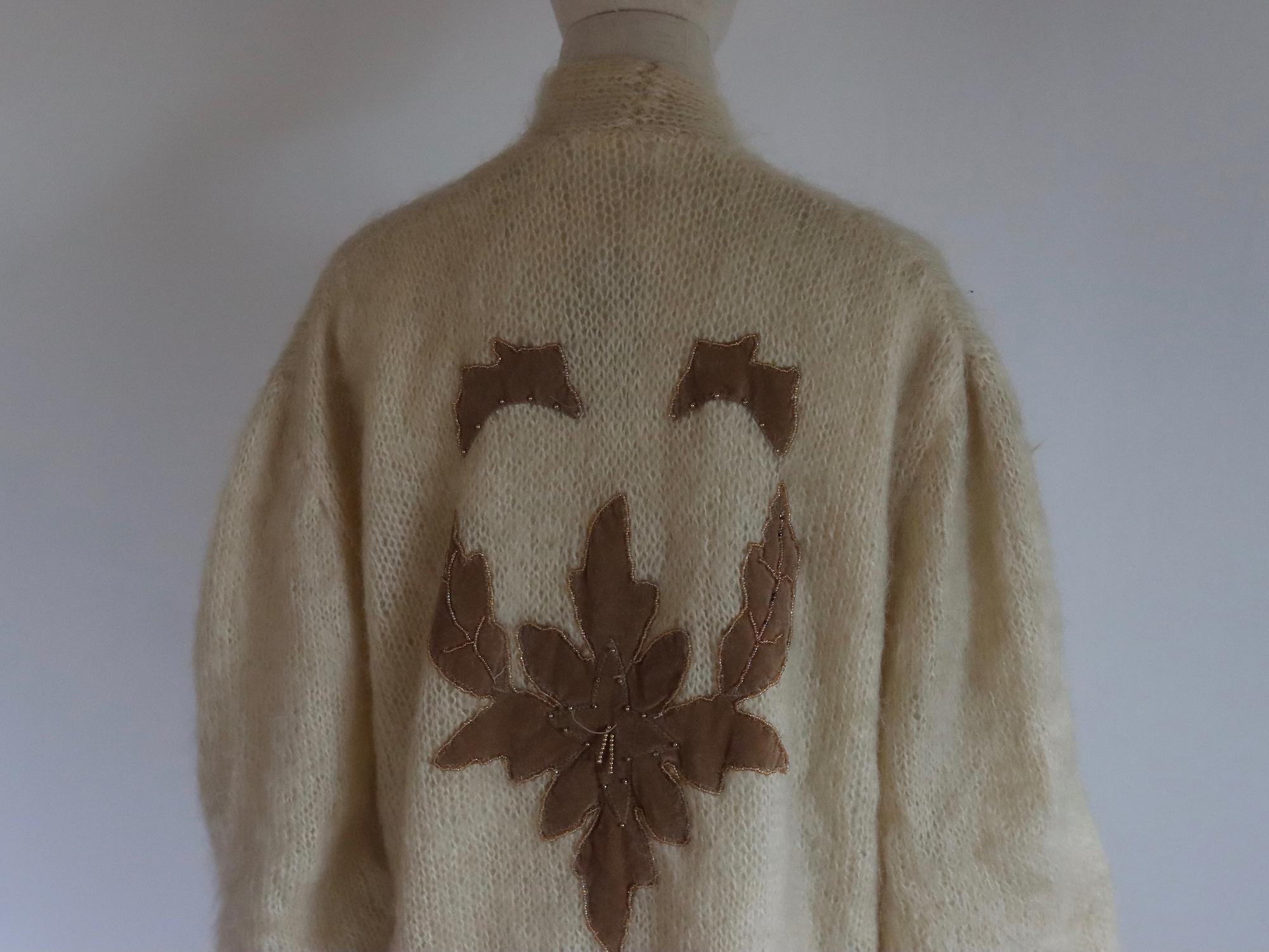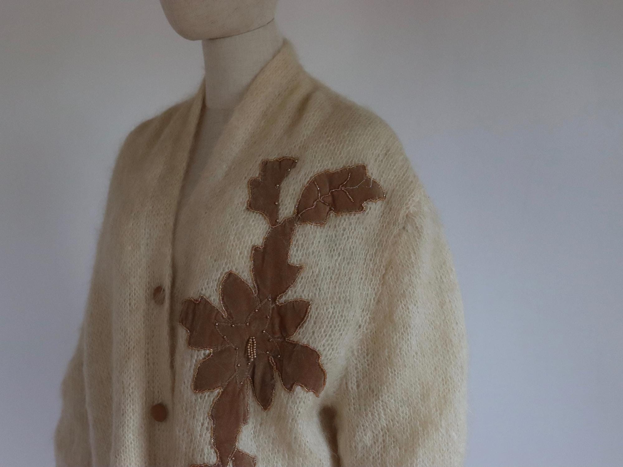 This cream cosy 1980s cream cardigan features a brown appliqué pattern on the back and front with button closure and is fully lined.