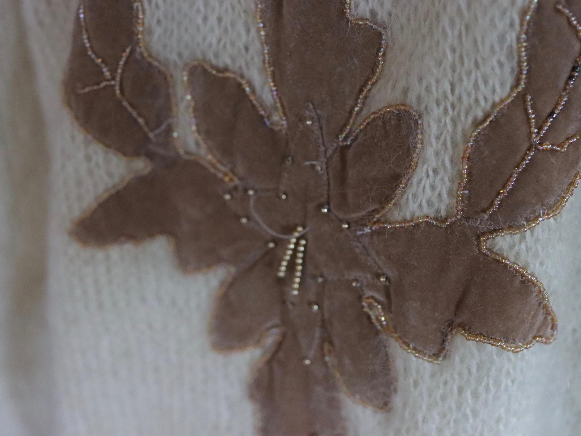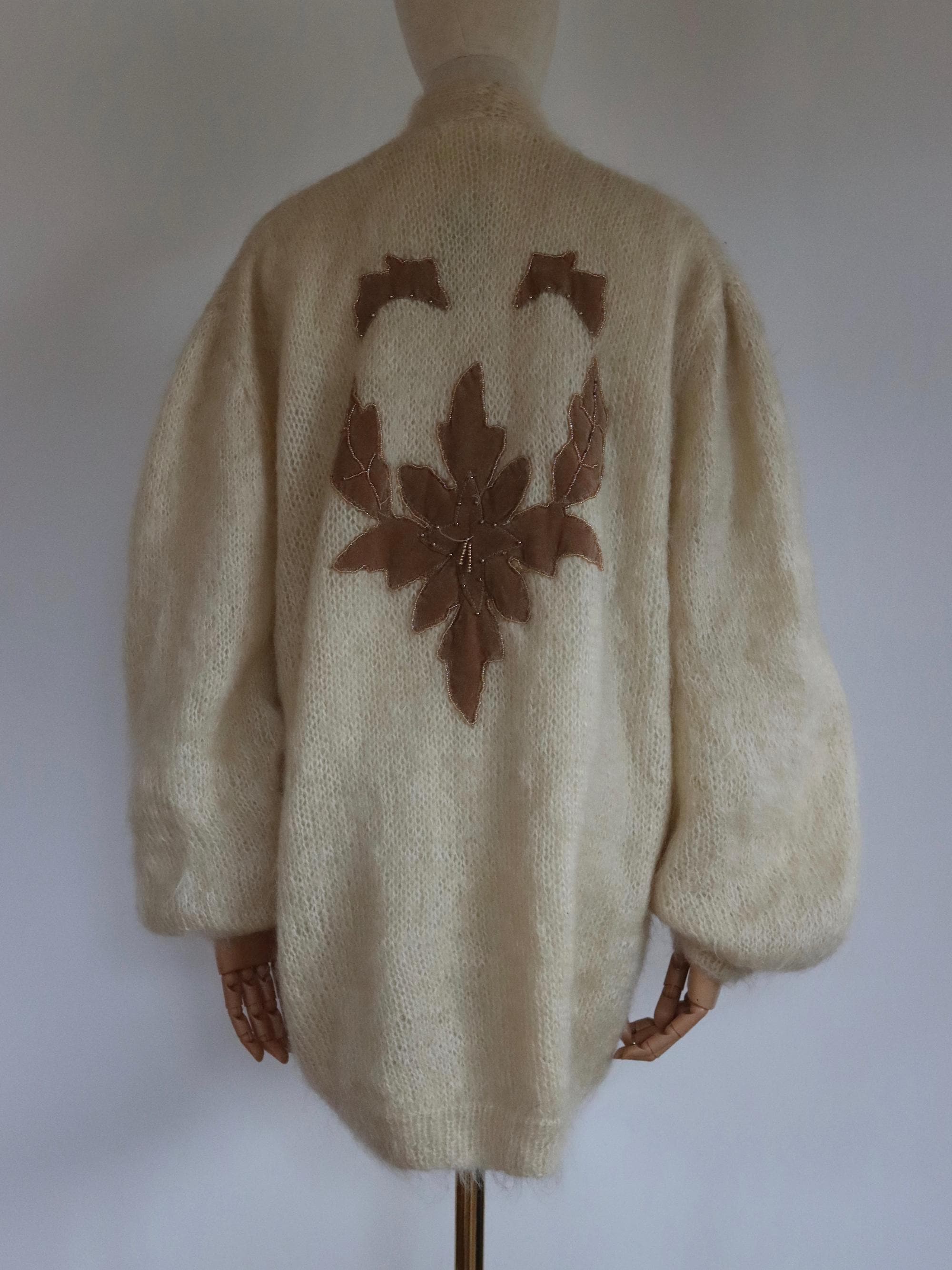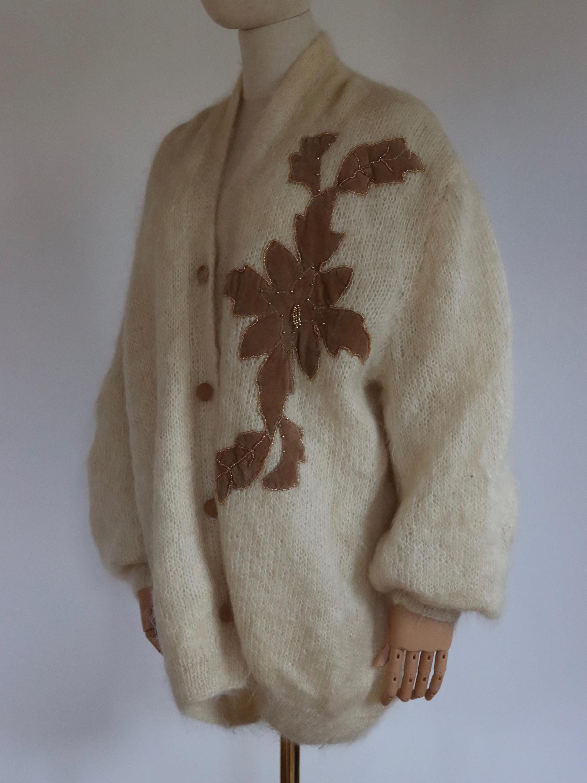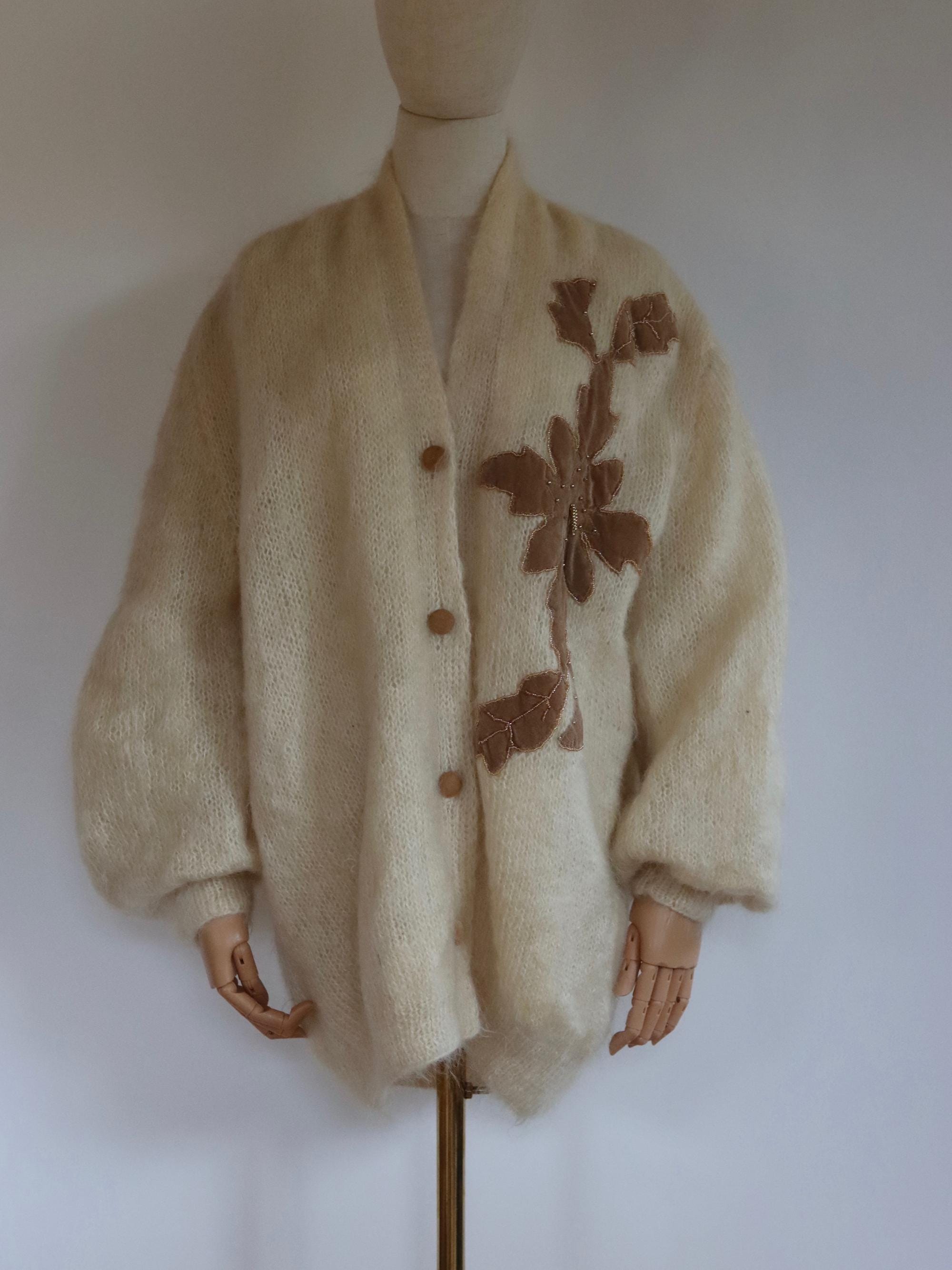 This cream cosy 1980s cream cardigan features a brown appliqué pattern on the back and front with button closure and is fully lined.