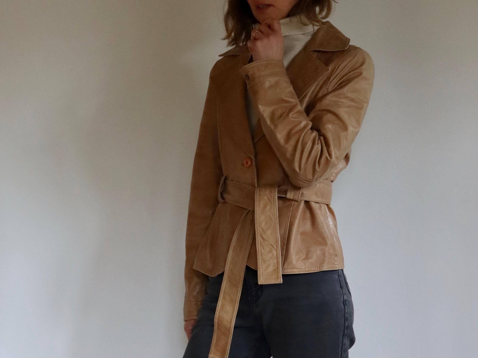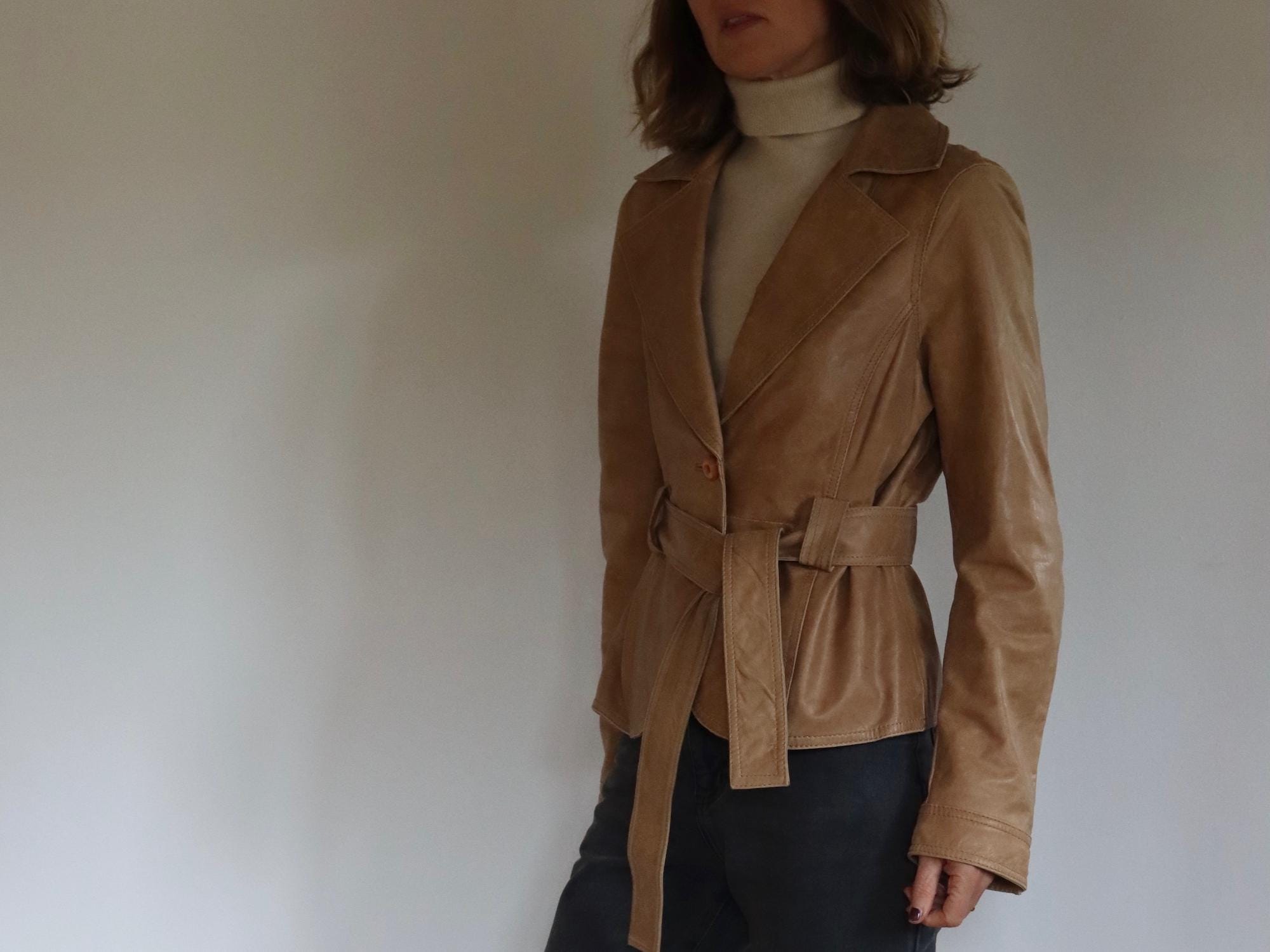 This super soft beige leather belted short jacket is a slim fit with a belted tie waistline, such a beautiful quality leather by Canadian label Soia & Kyo.