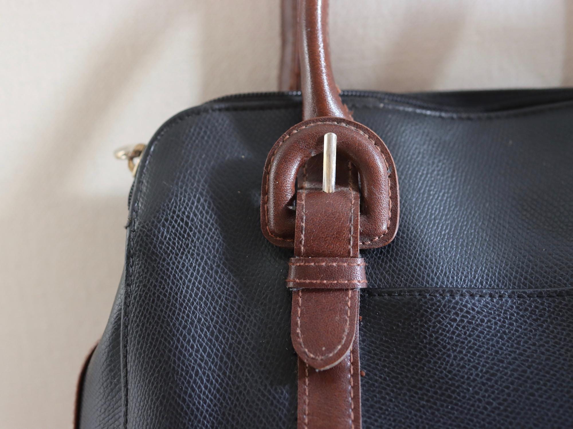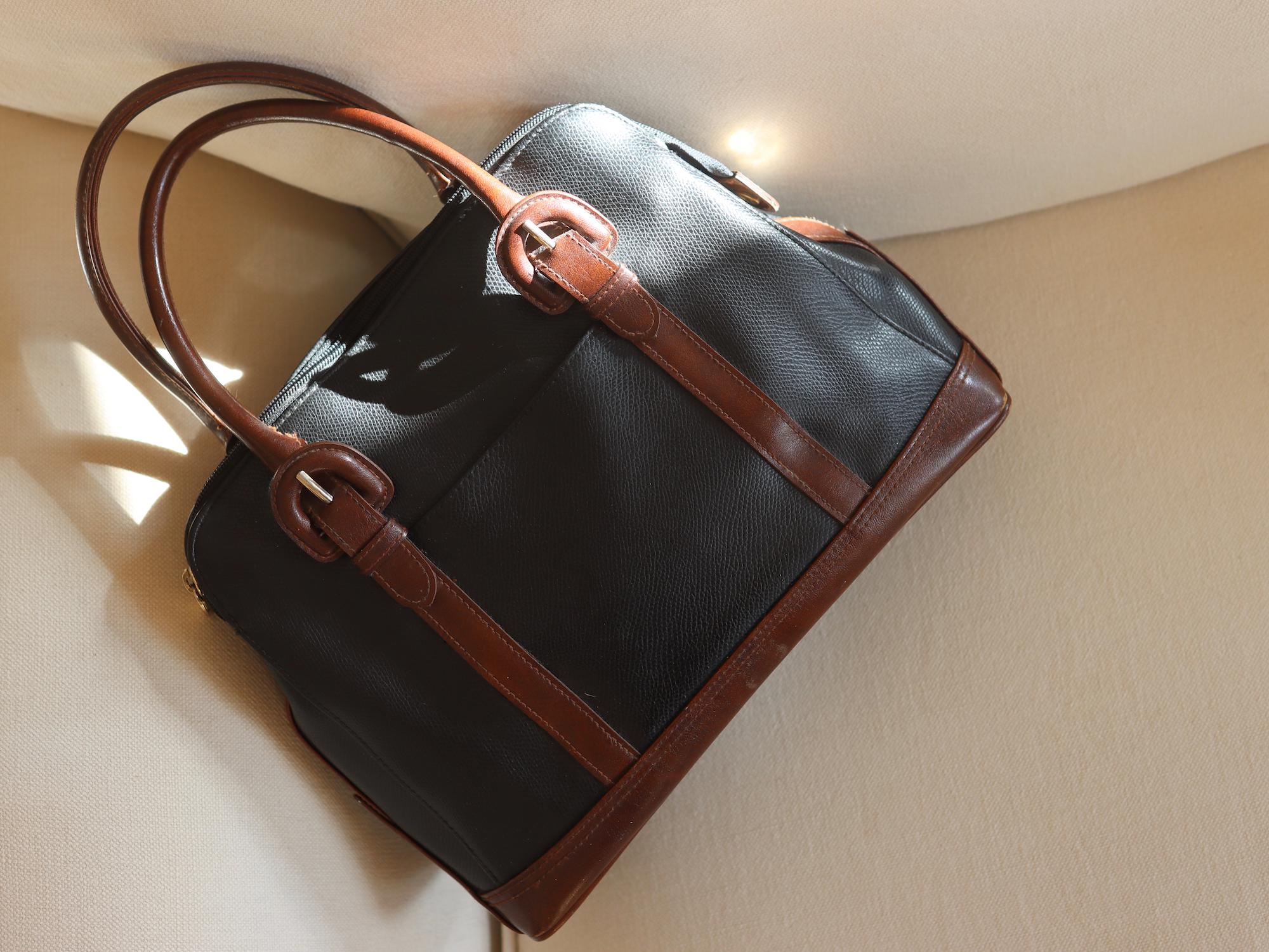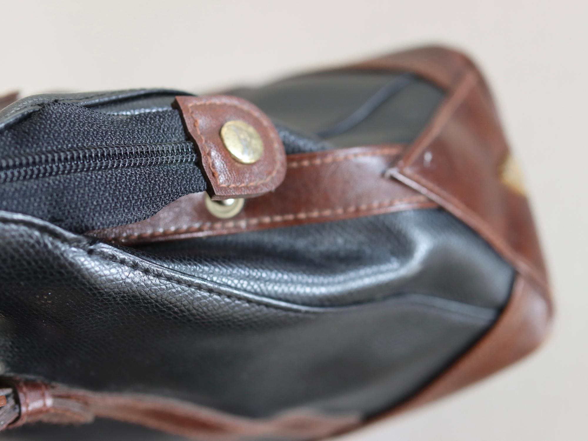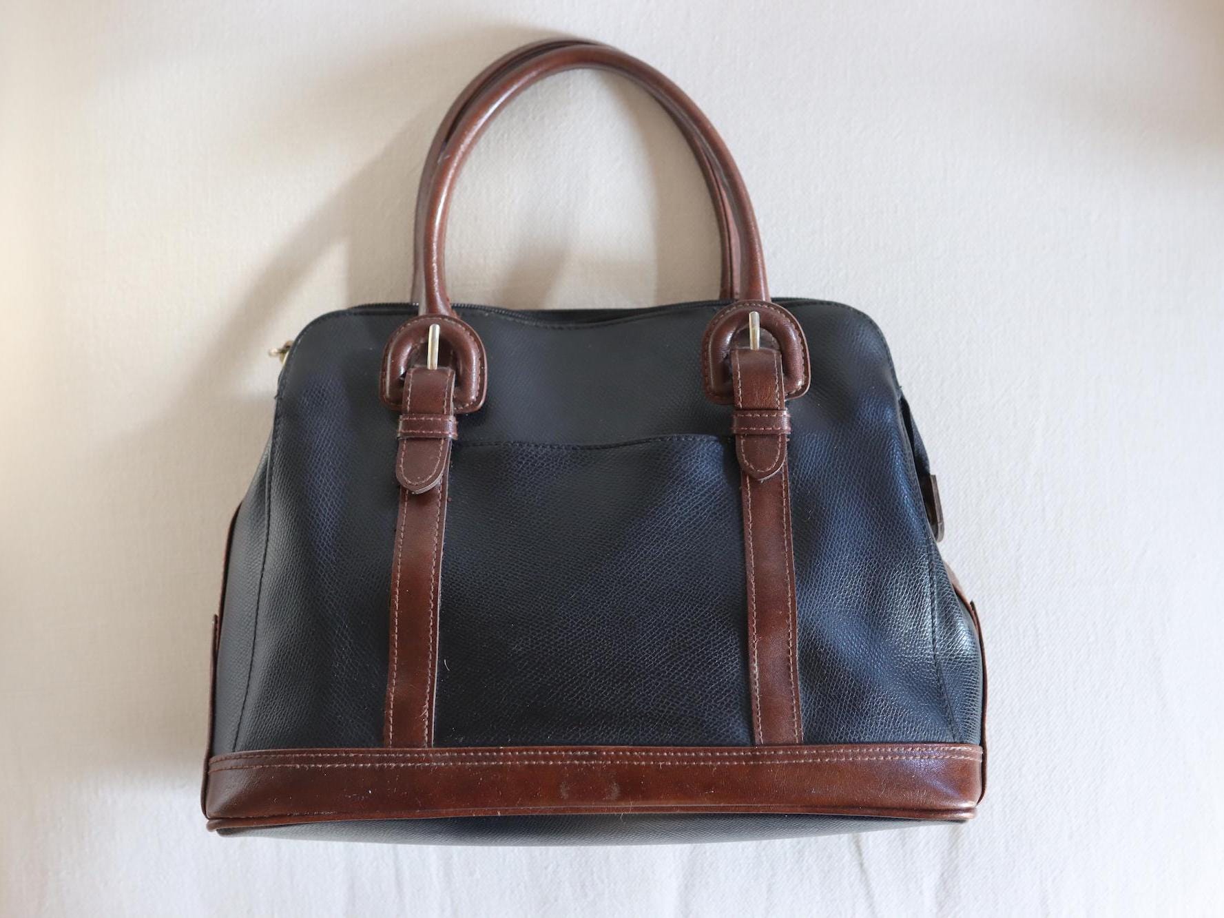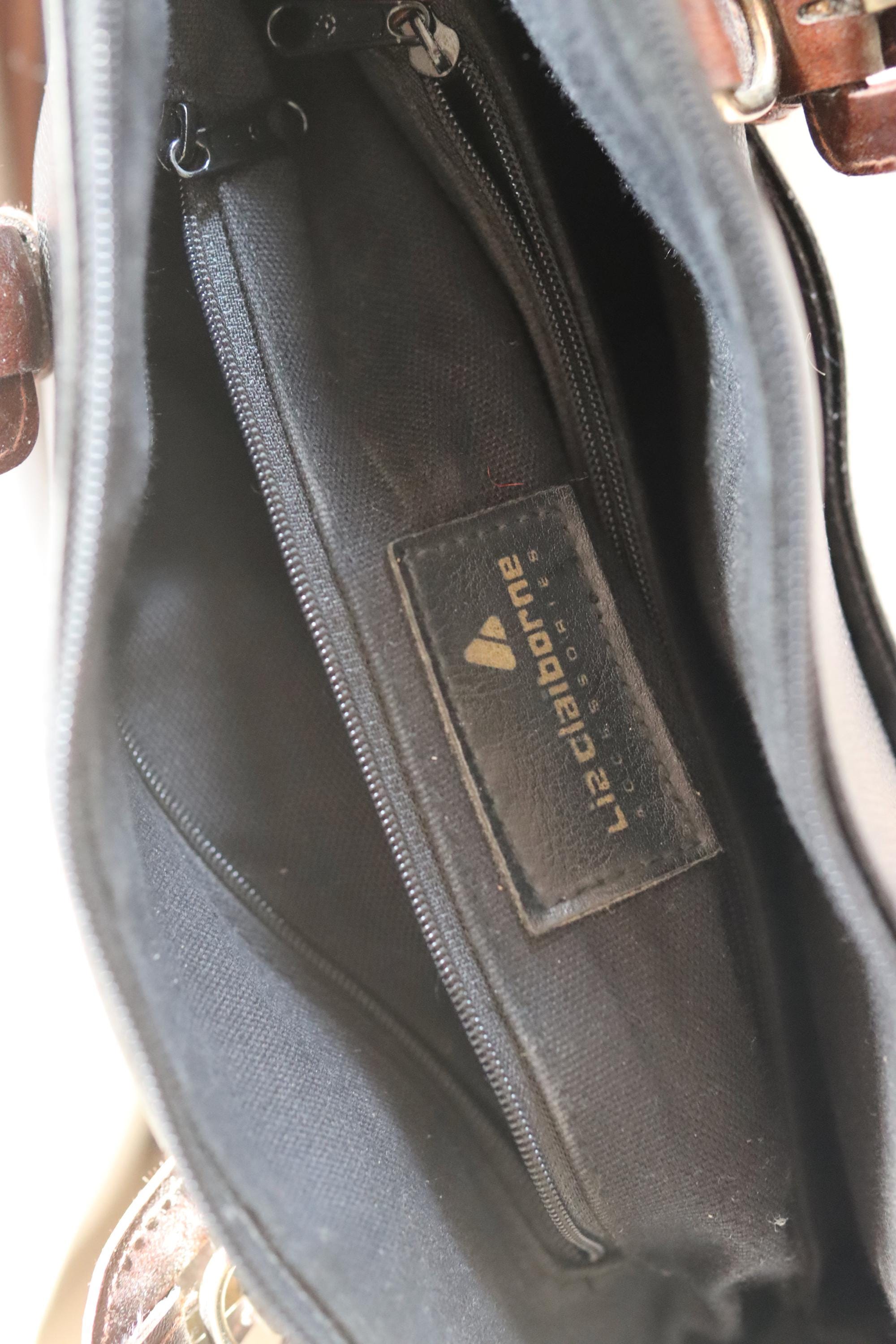 Liz Claiborne vintage bag in black grained leather with a brown trim, zip top closure, fabric lined interior with zippered wall pocket, exterior slip pocket and dual top handles.