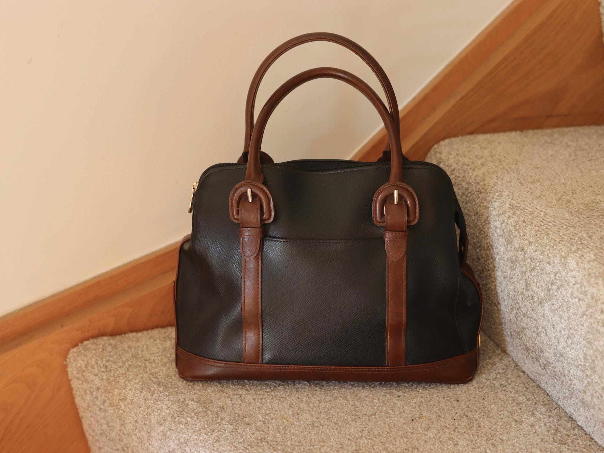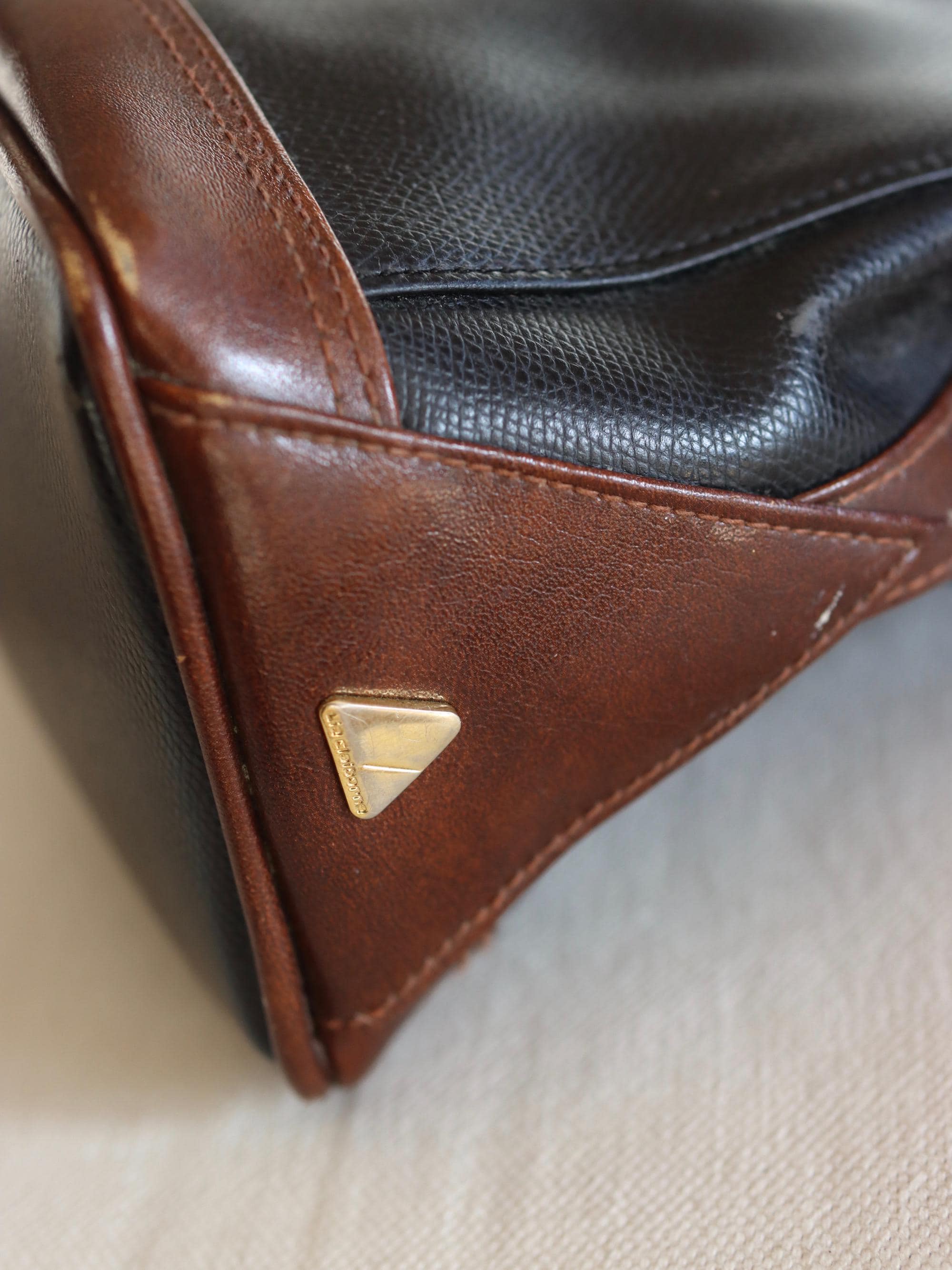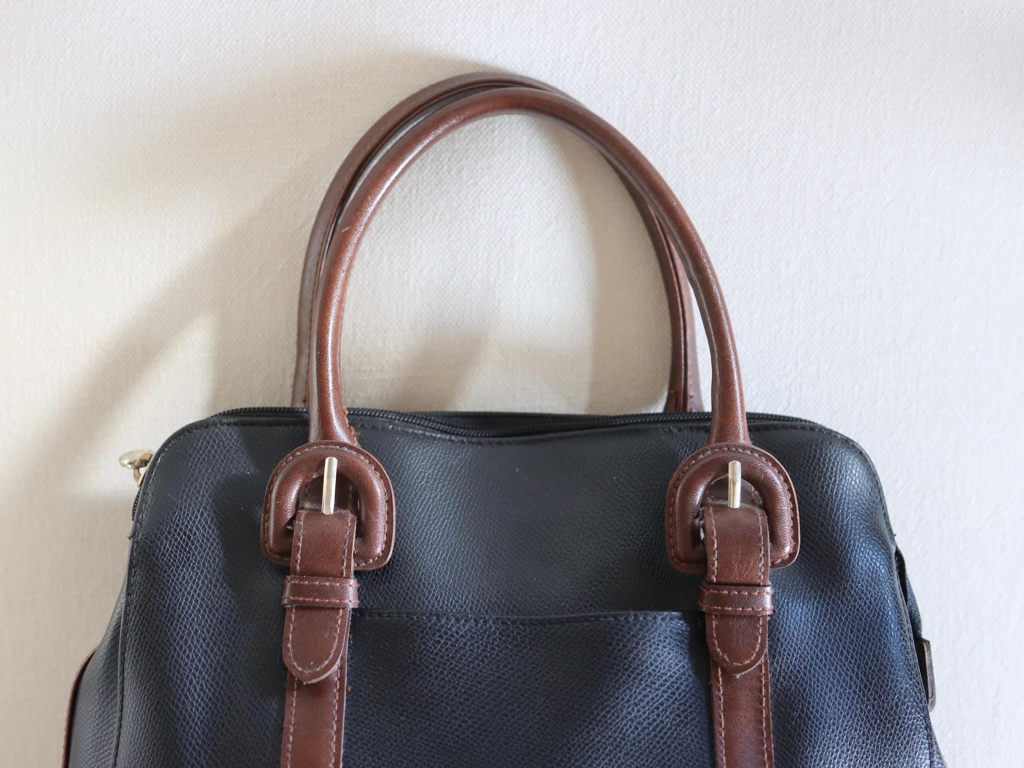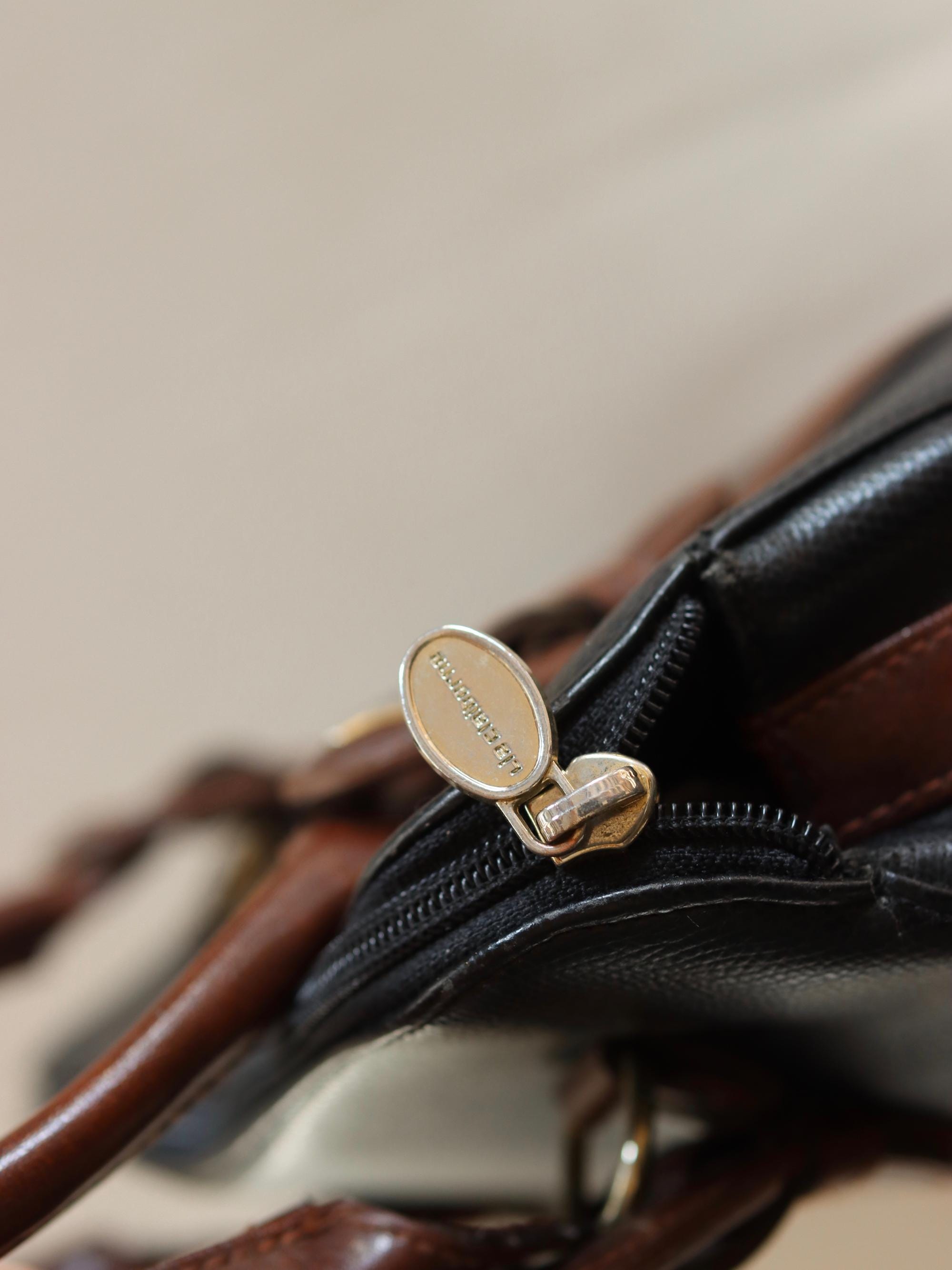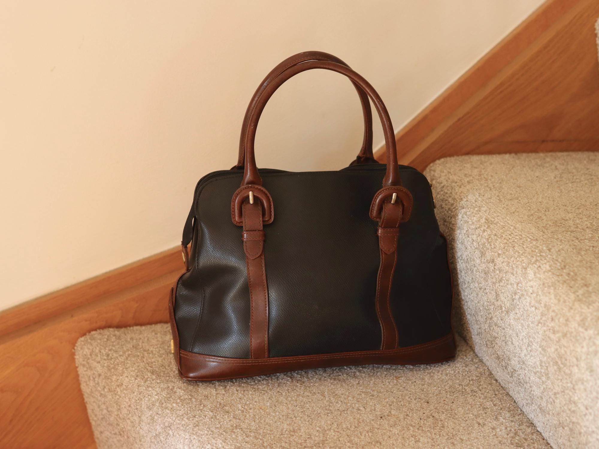 Liz Claiborne vintage bag in black grained leather with a brown trim, zip top closure, fabric lined interior with zippered wall pocket, exterior slip pocket and dual top handles.