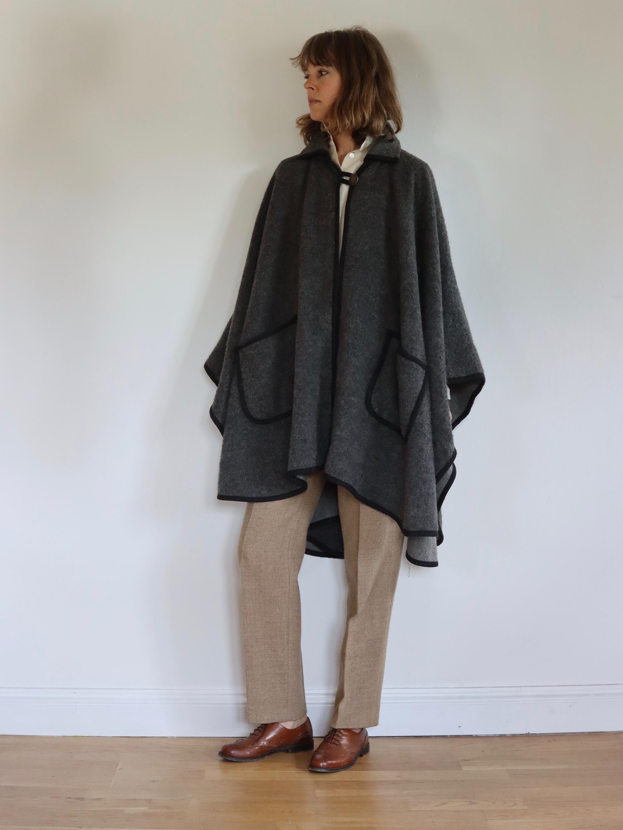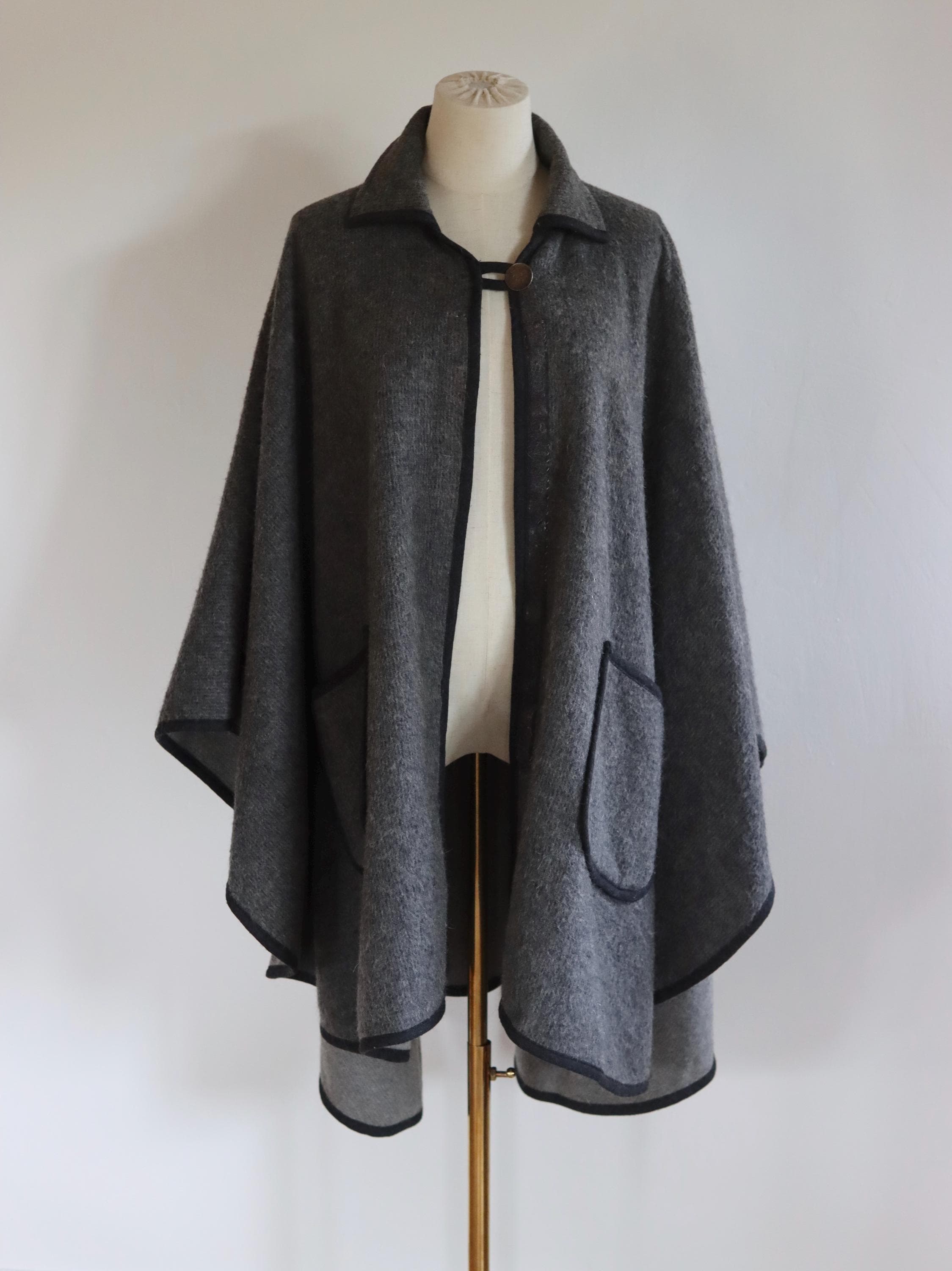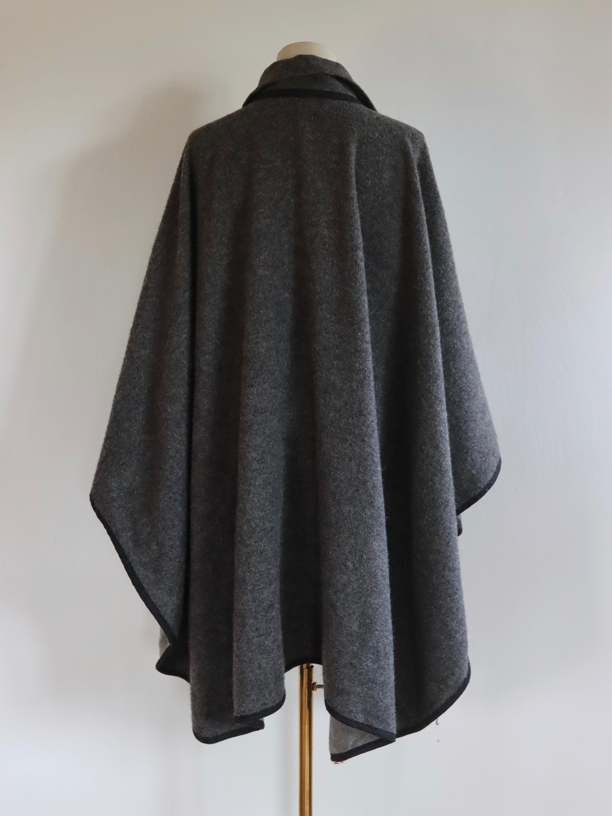A cosy grey Berwin & Wolff cape with black trim deep pockets, and a one button fastening, Makes a nice layer over coats or big jumpers.