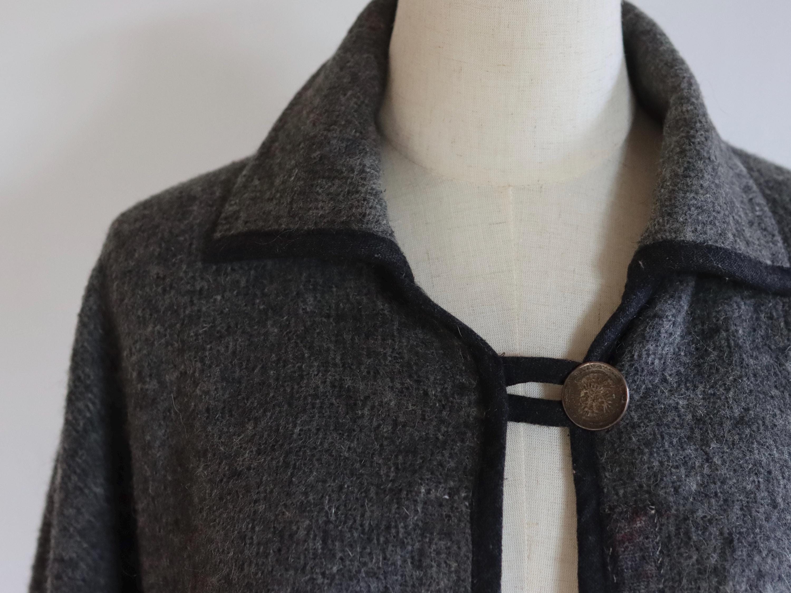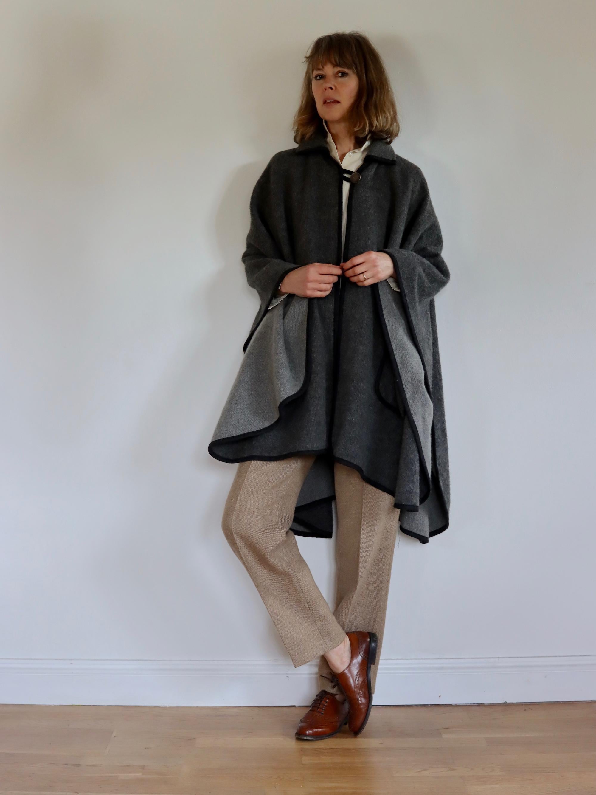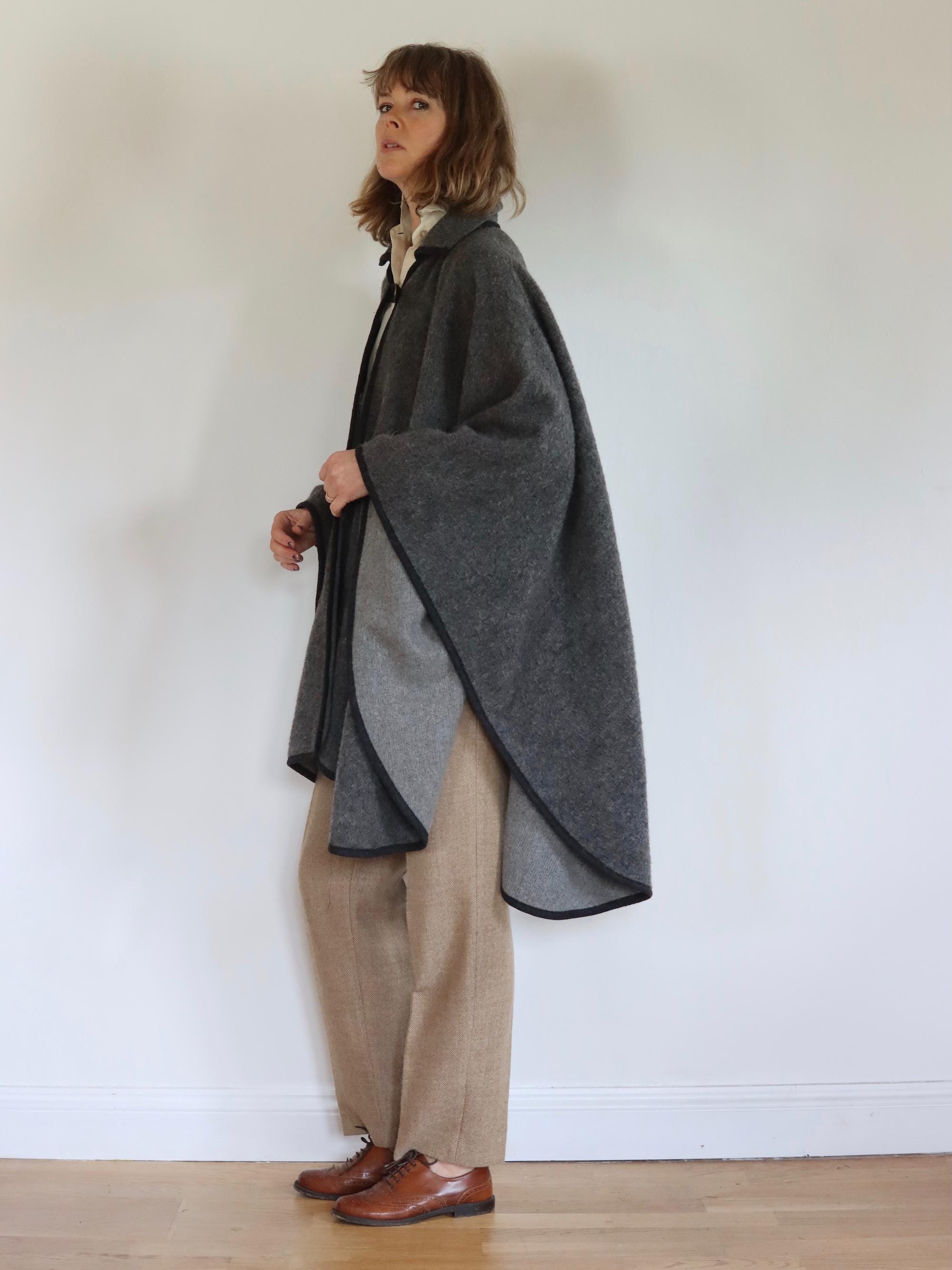 A cosy grey Berwin & Wolff cape with black trim deep pockets, and a one button fastening, Makes a nice layer over coats or big jumpers.