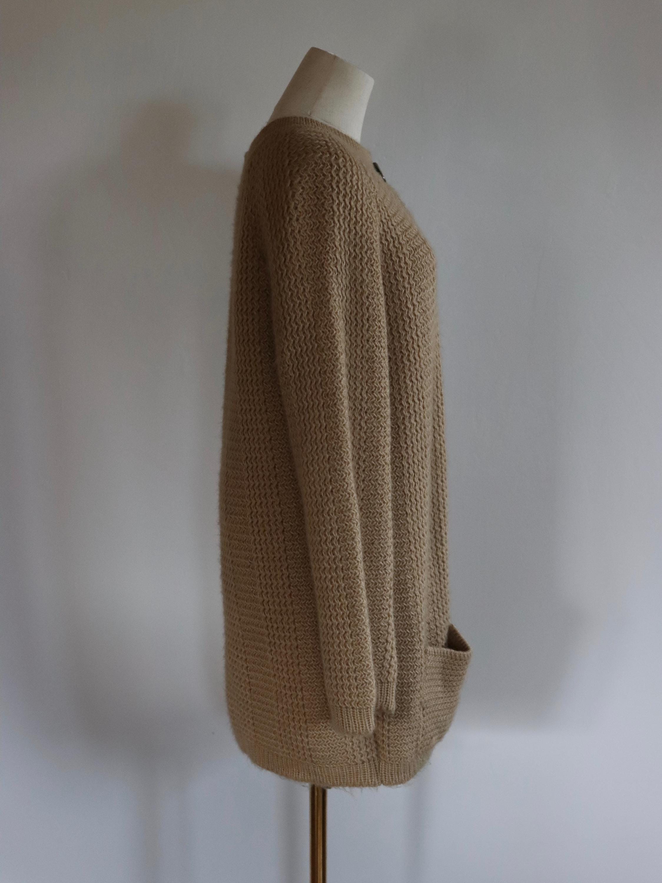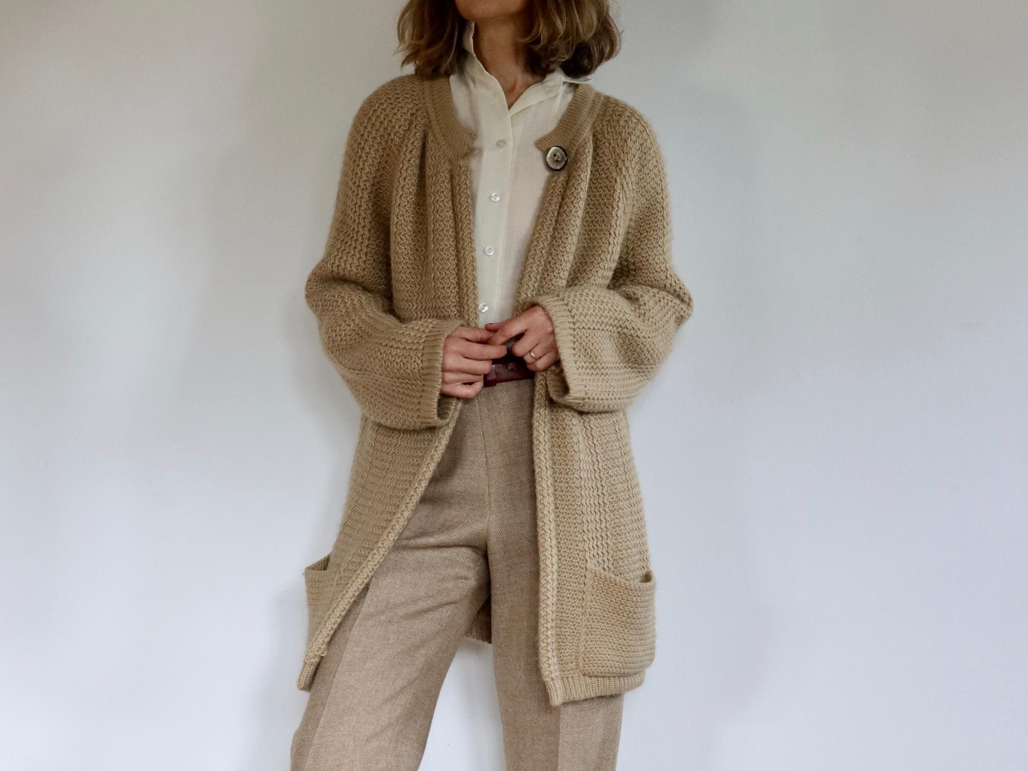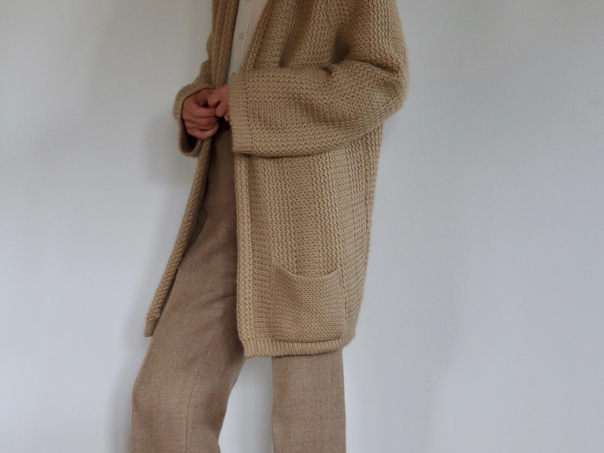 Oversized Long Open Weave Knit Handmade Cardigan With One Button Fastening and Pockets.