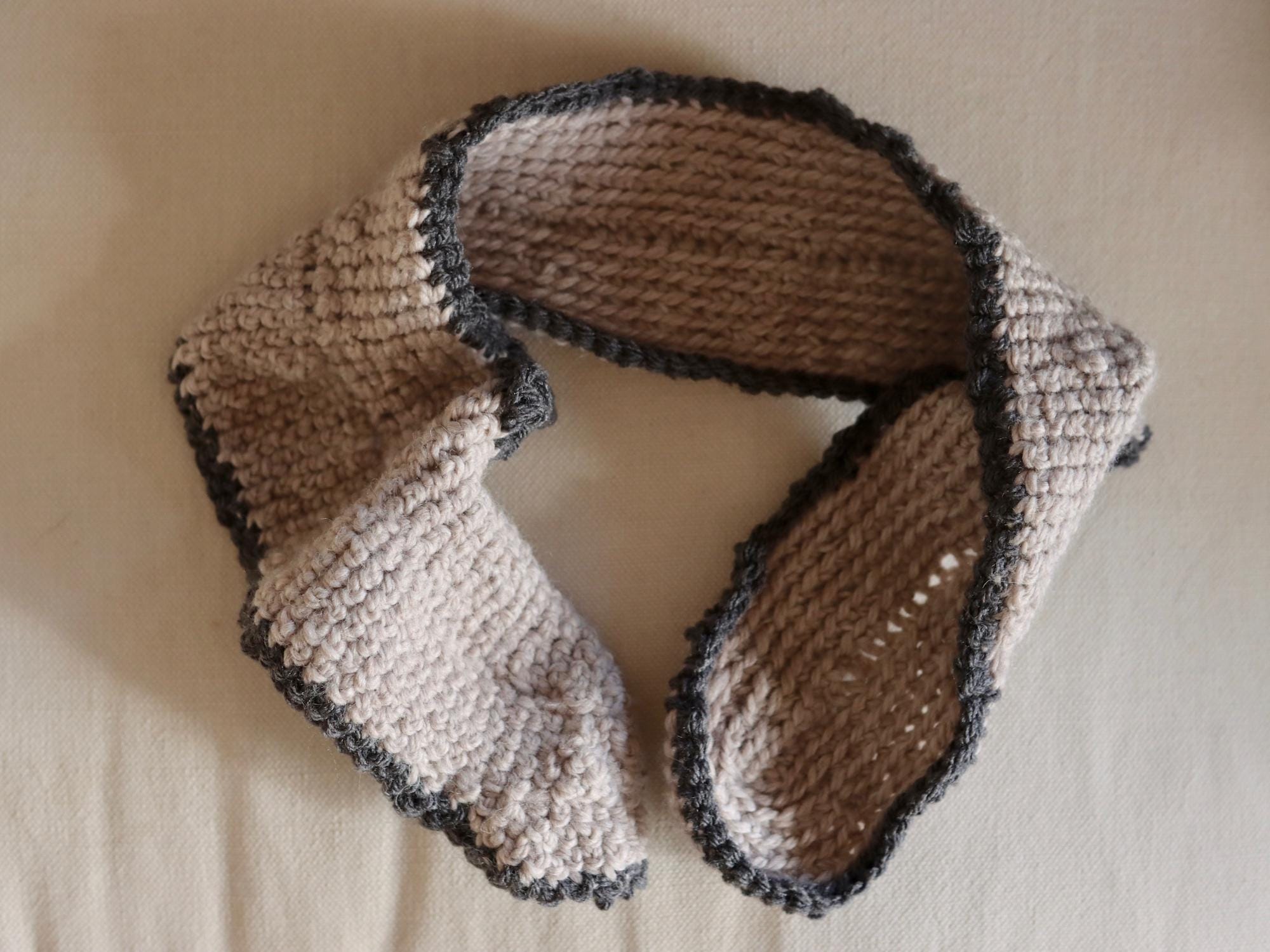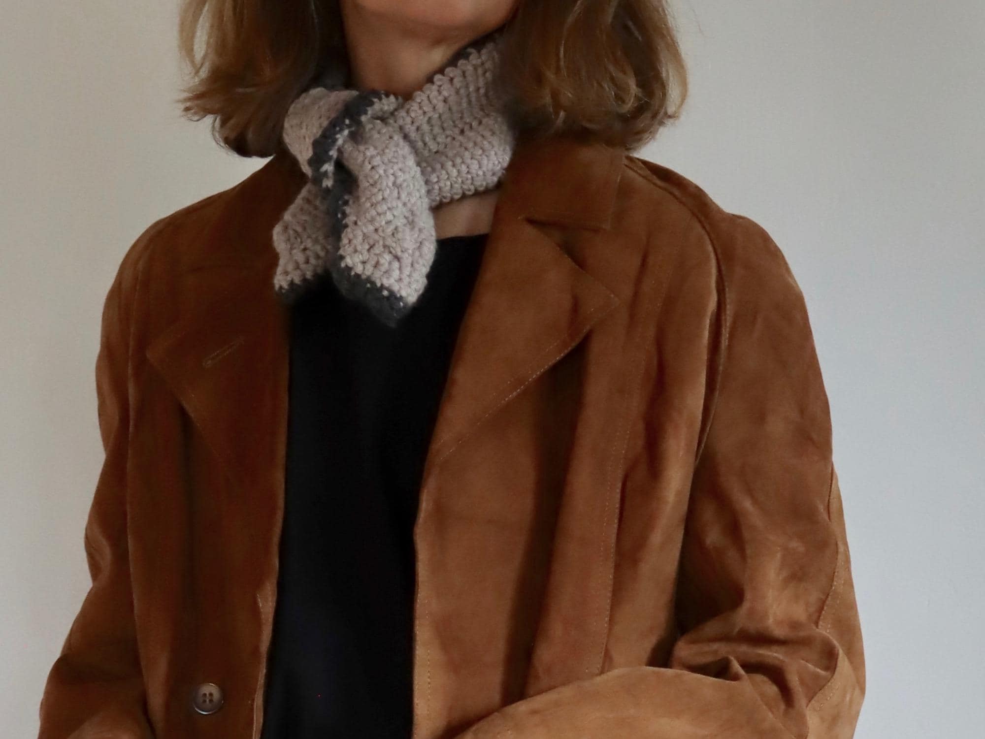 Handmade by my mum who recently broke her hip so she's taken to being creative and I really love these scarves so offered to sell them for her. This one is a taupe grey with a dark grey trim. All the wool she uses are either vintage or offcuts so she's saving the planet at the same time.