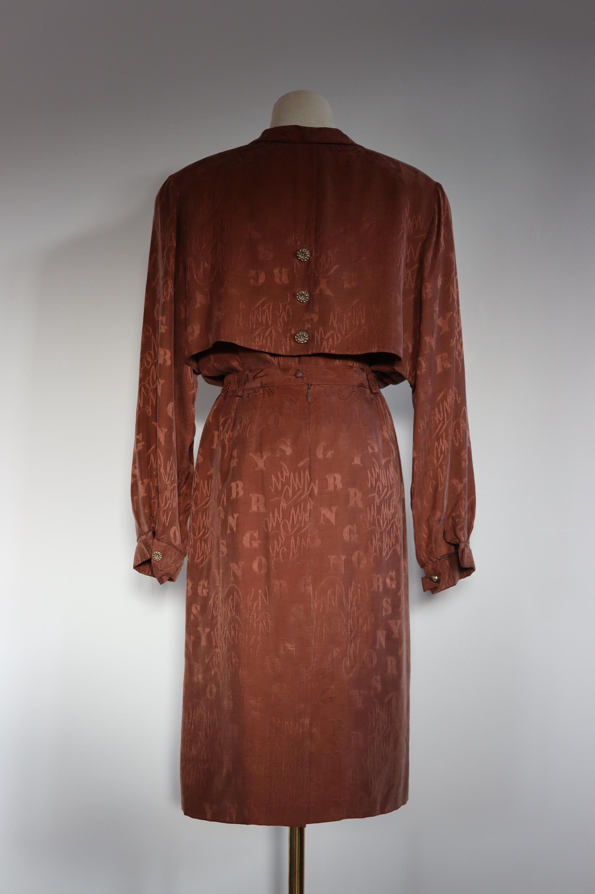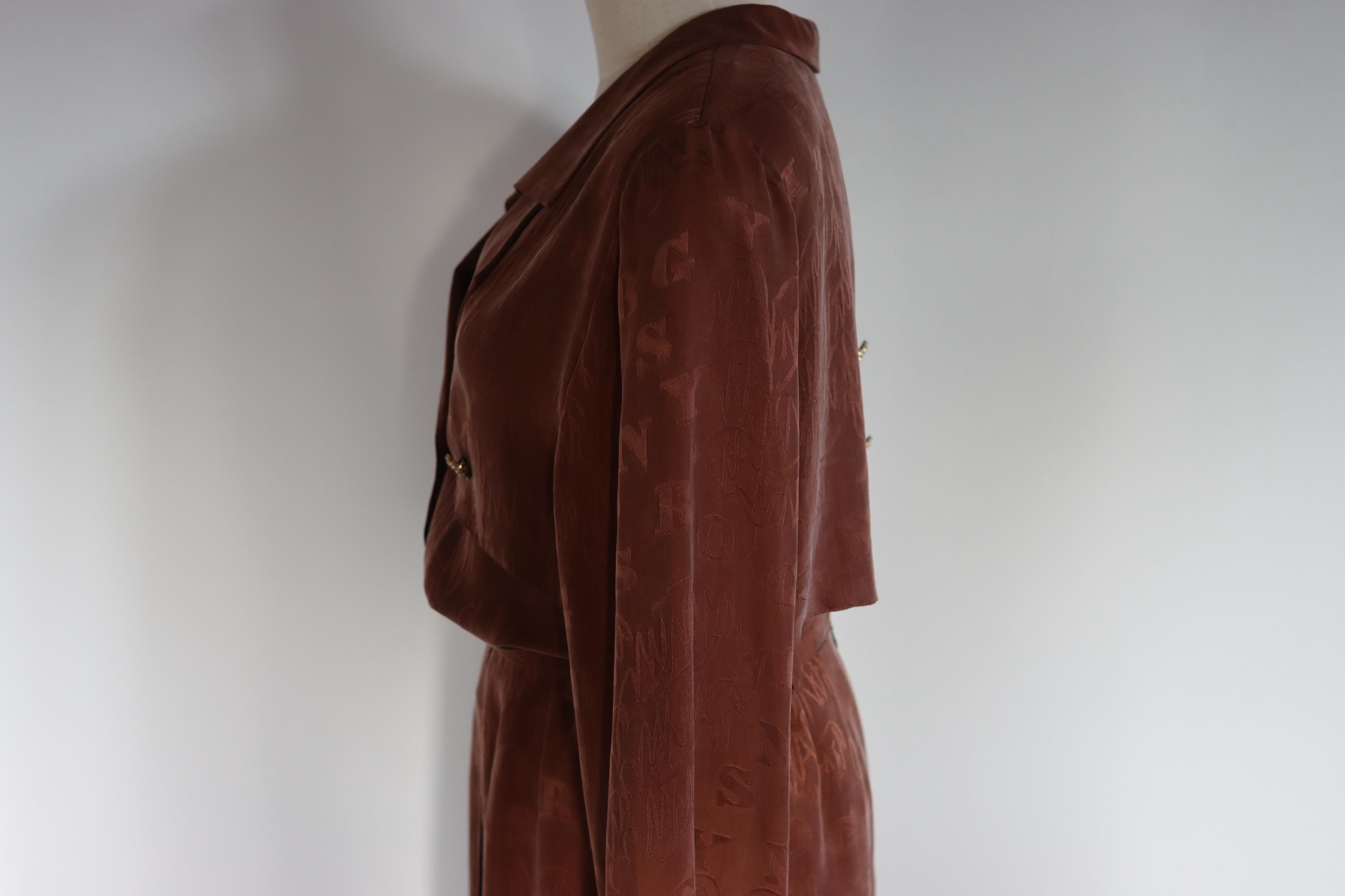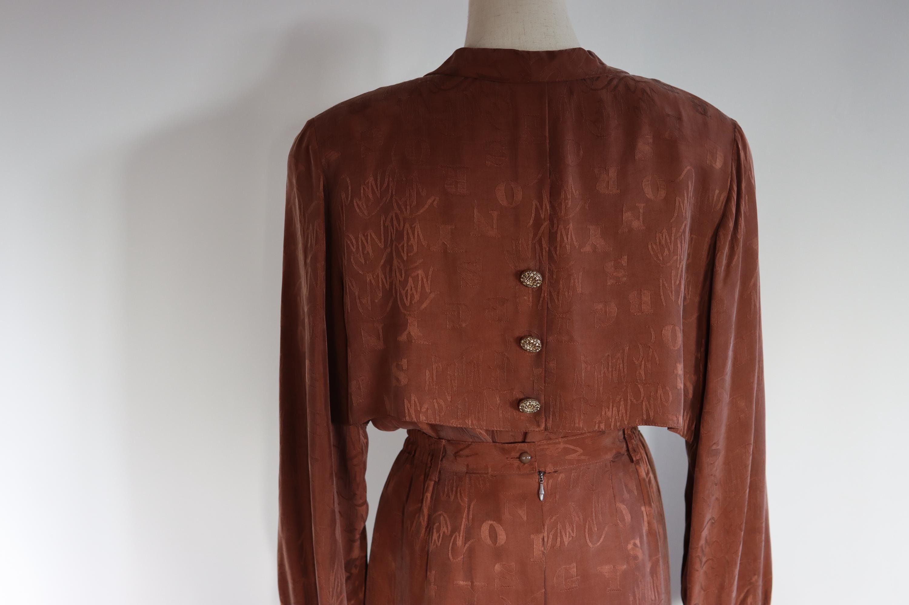 An evening skirt suit with monogram print in a silky cupro fabric. The long blouse has shoulder pads and a cape back with gold buttons so it hangs really beautifully when tucked into the knee length skirt which features side elastic for extra comfort. Lots of lovely details.