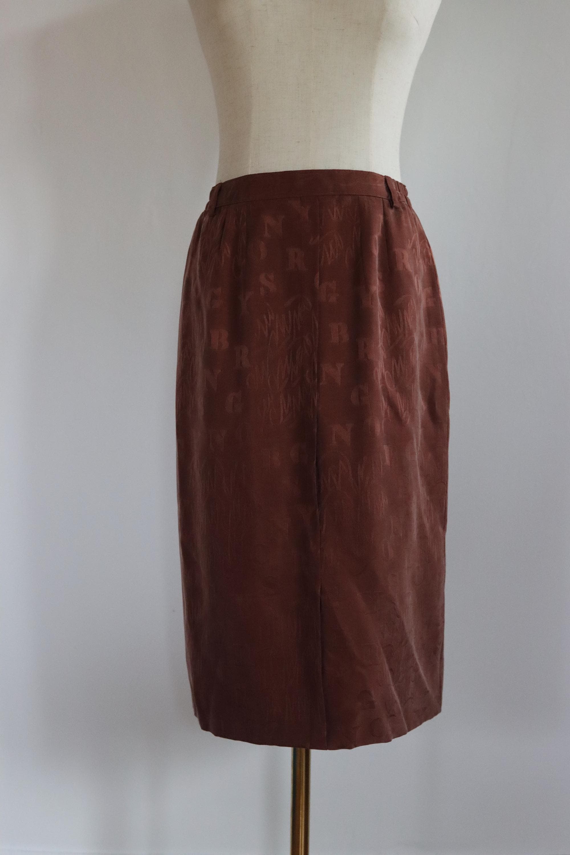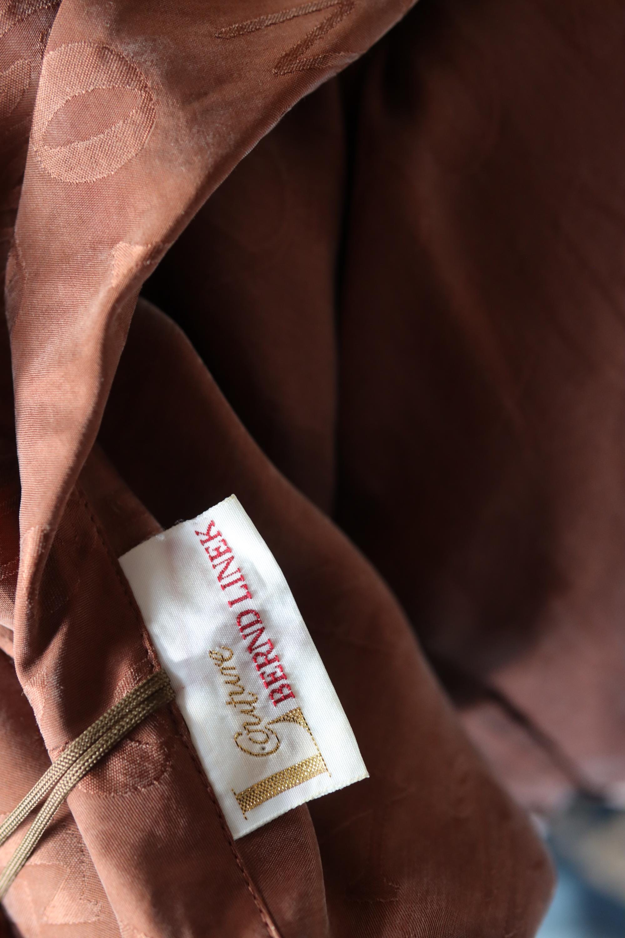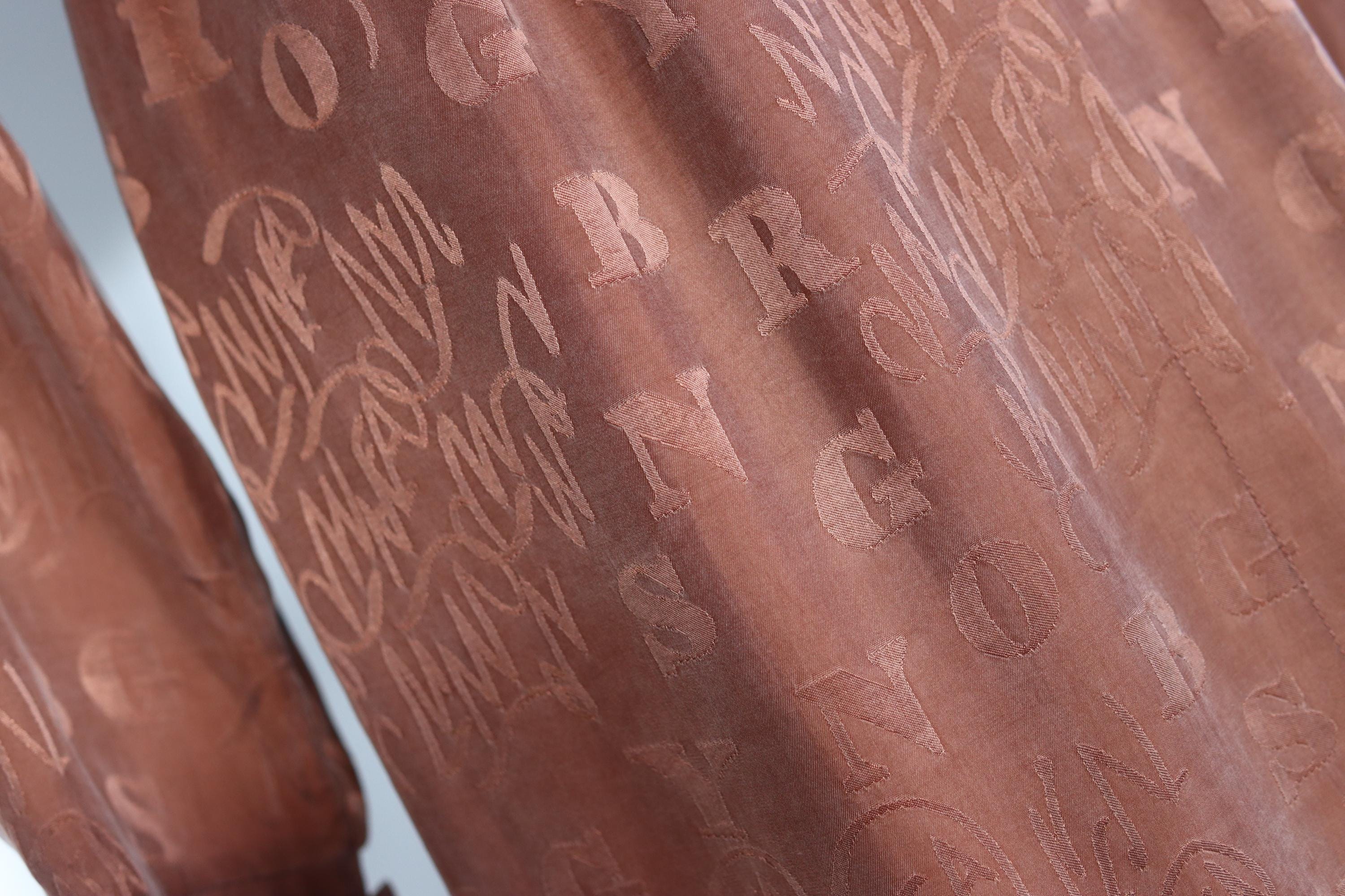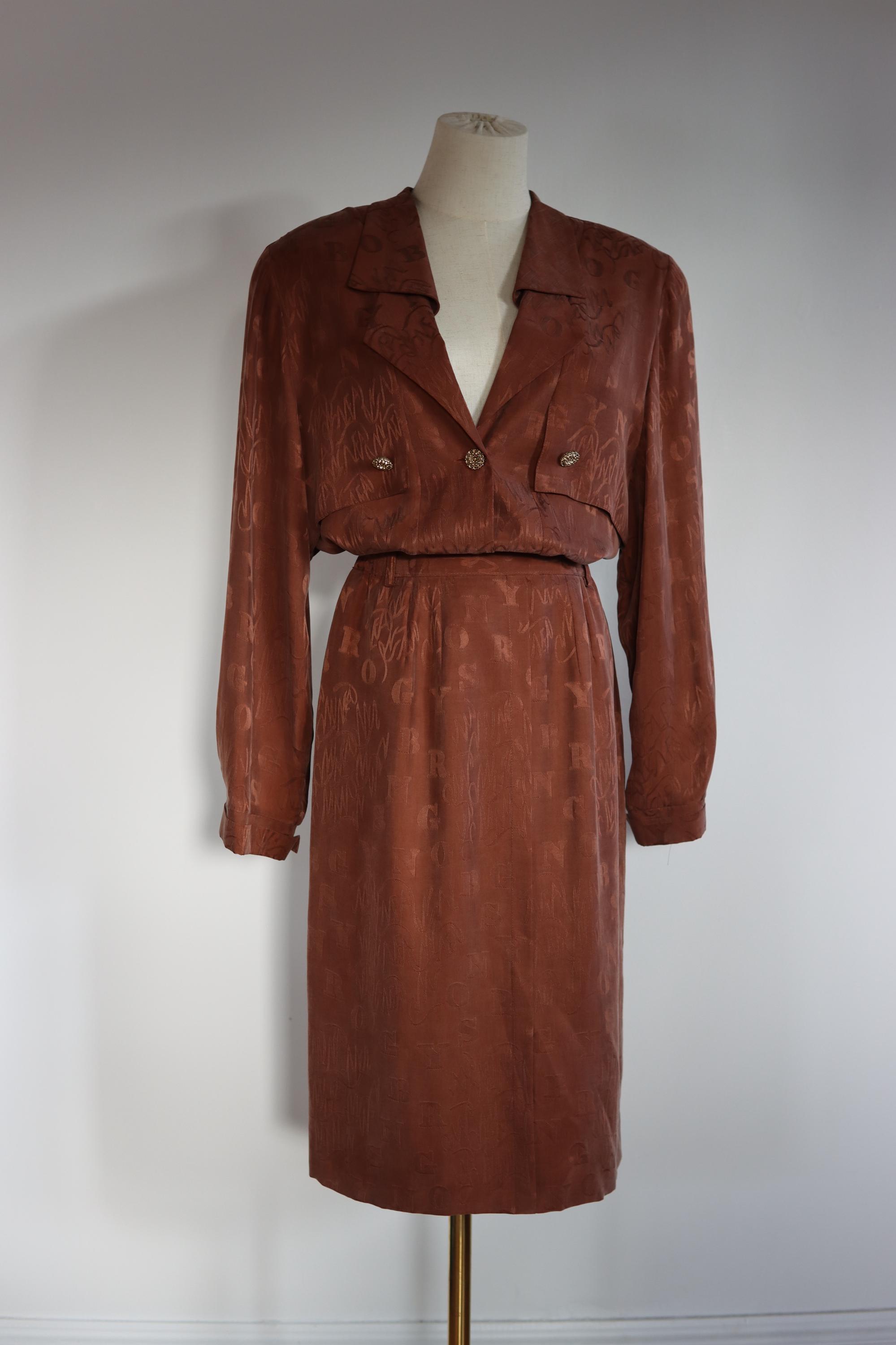 An evening skirt suit with monogram print in a silky cupro fabric. The long blouse has shoulder pads and a cape back with gold buttons so it hangs really beautifully when tucked into the knee length skirt which features side elastic for extra comfort. Lots of lovely details.