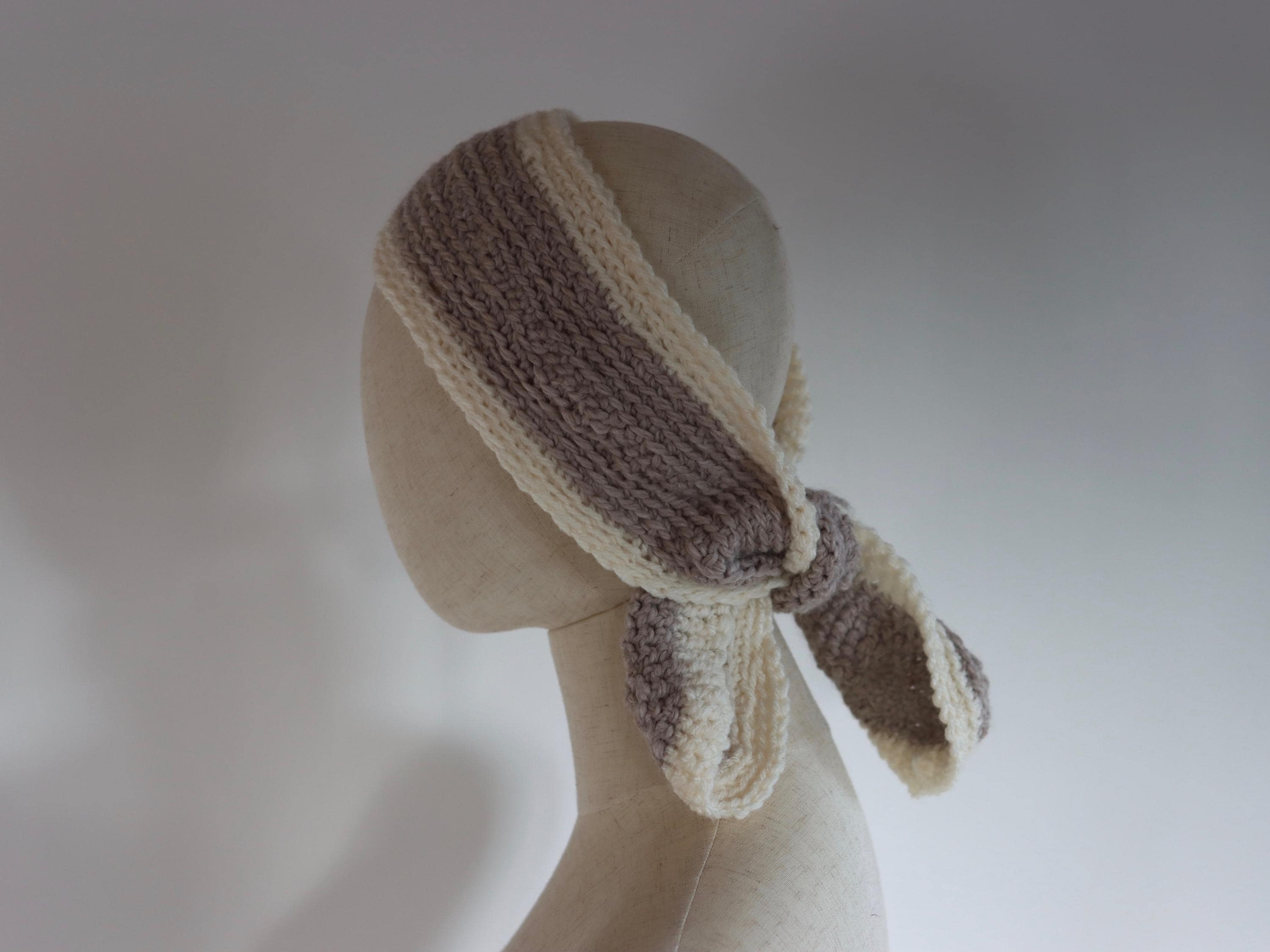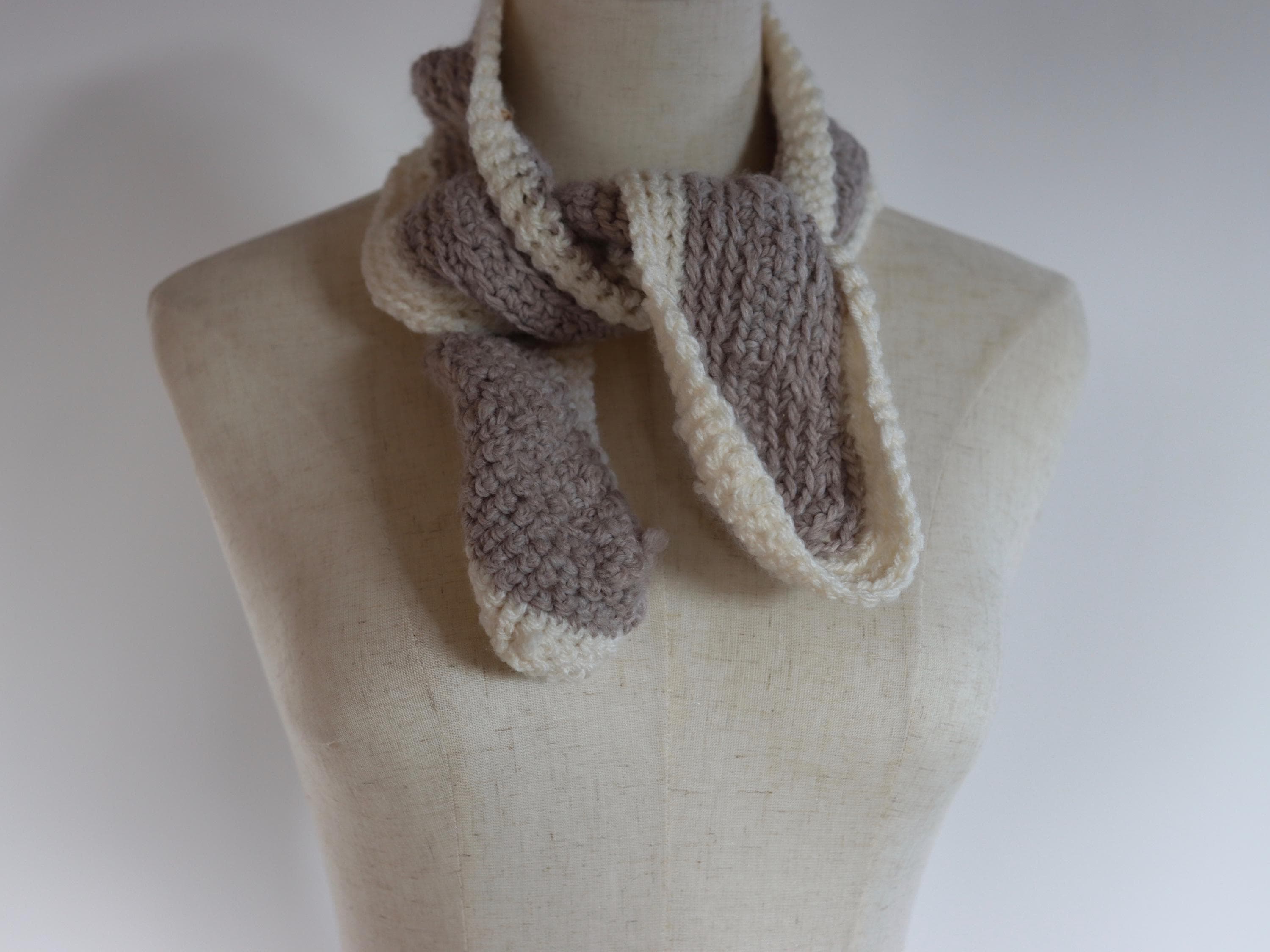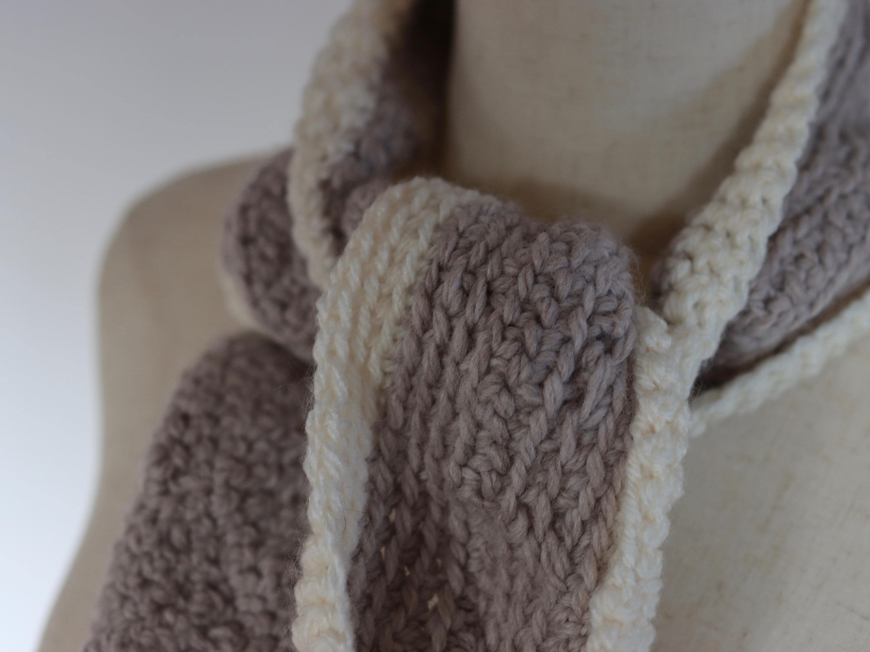 Handmade by my mum who recently broke her hip so she's taken to being creative and I really love these scarves so offered to sell them for her. This one is a taupe grey with a cream trim. All the wool mum uses are either vintage or offcuts so she's saving the planet at the same time.