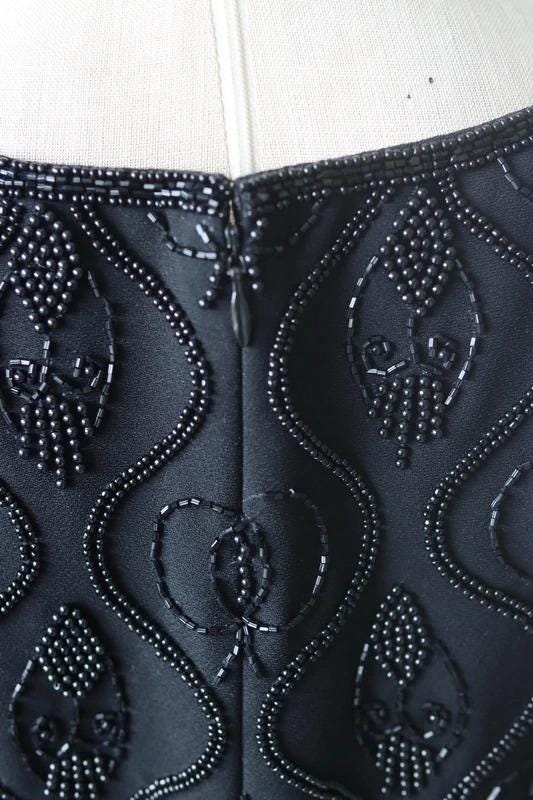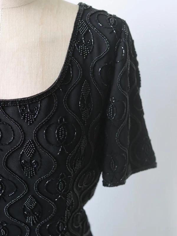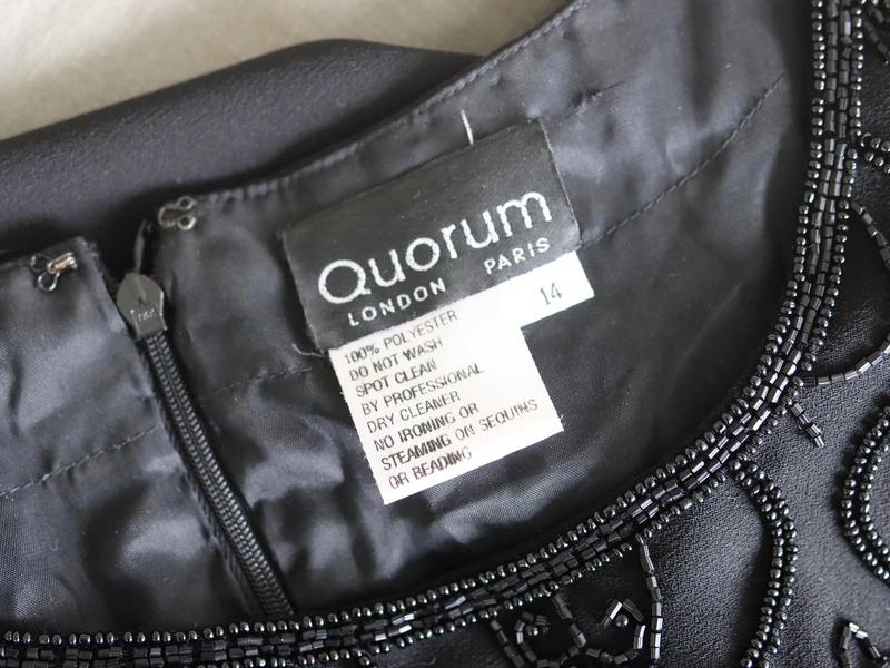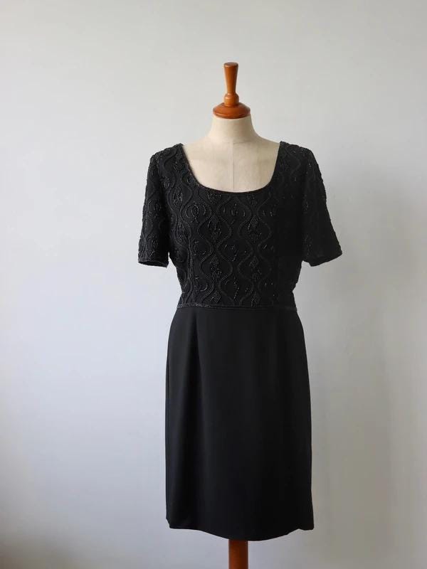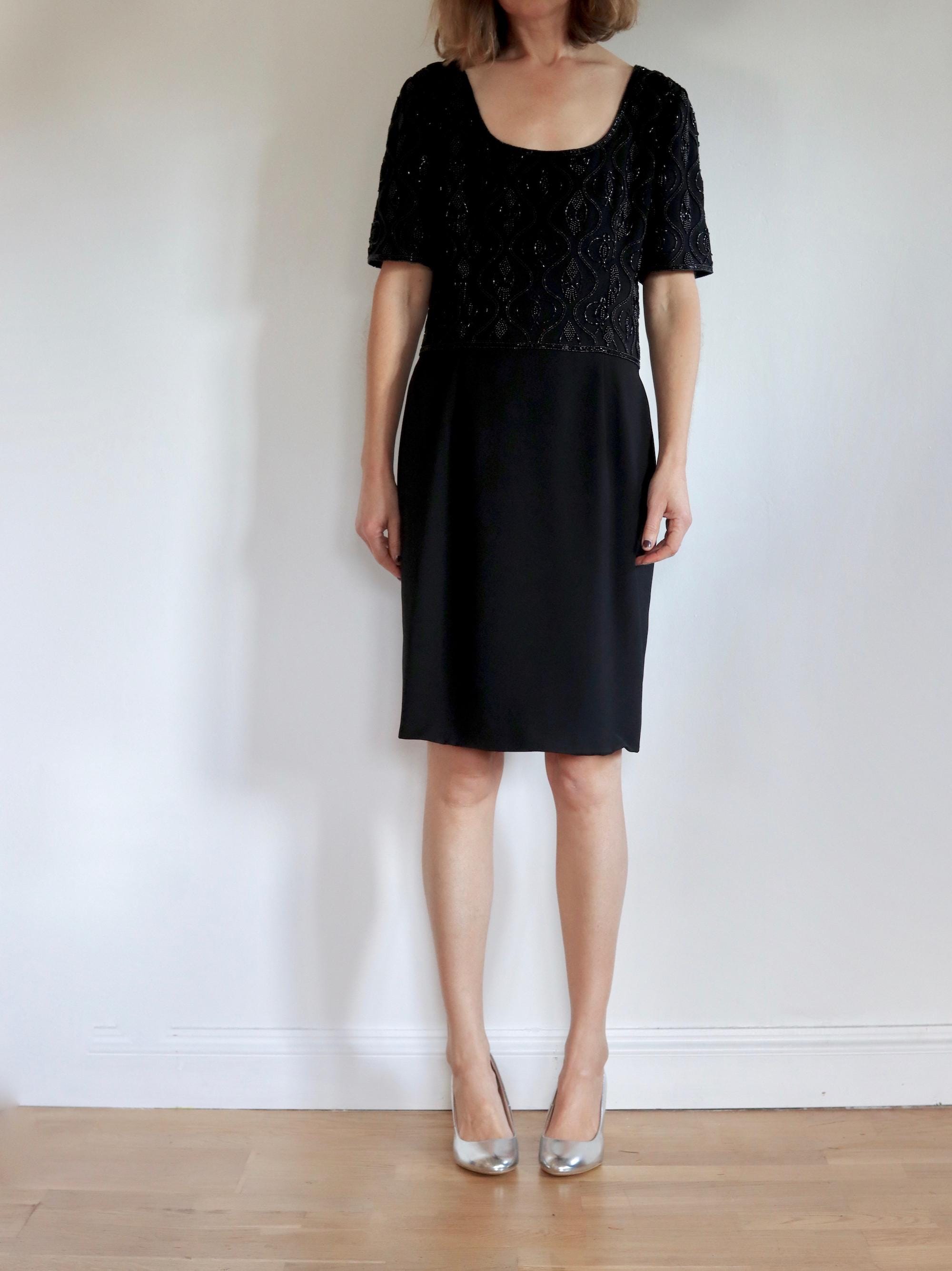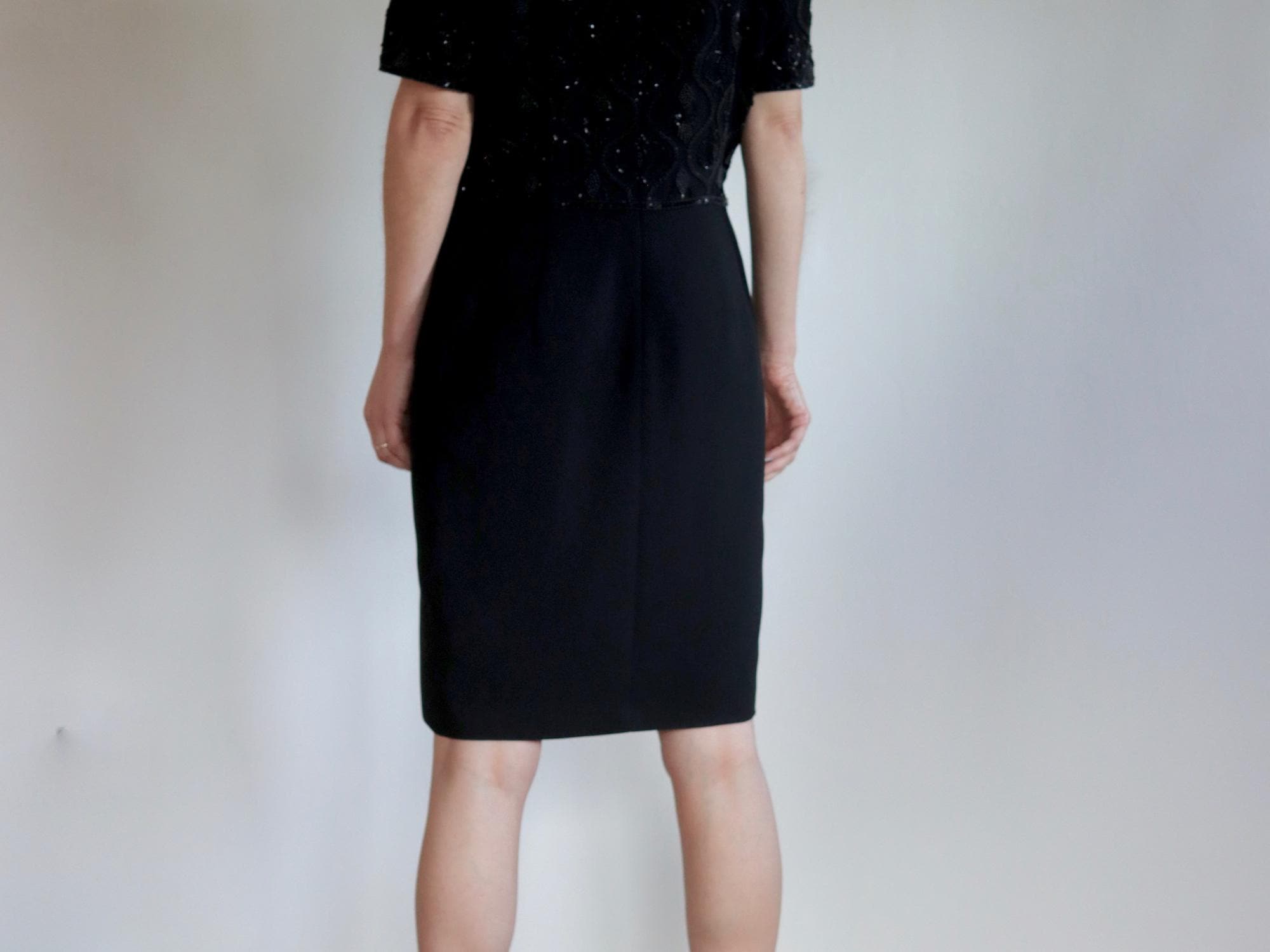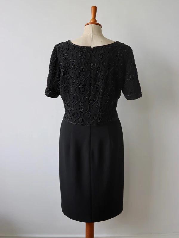 A perfect little black dress by Quorum for the party season with short sleeves, scoop neckline, back zip fastening, and a beaded top half and plain black skirt, fully lined.
