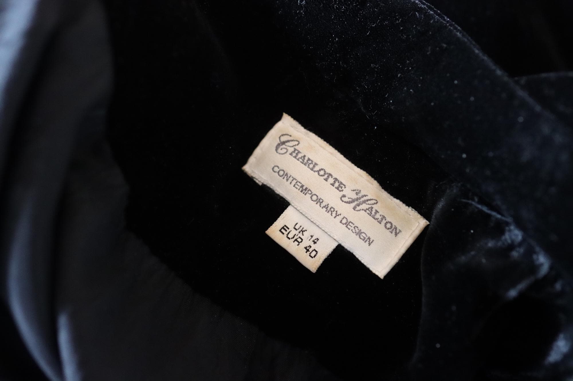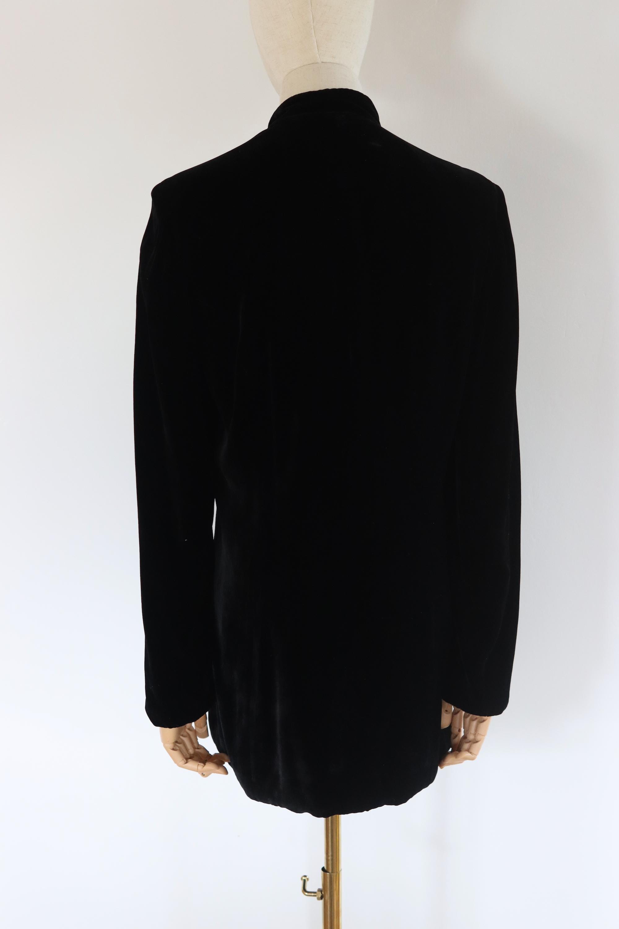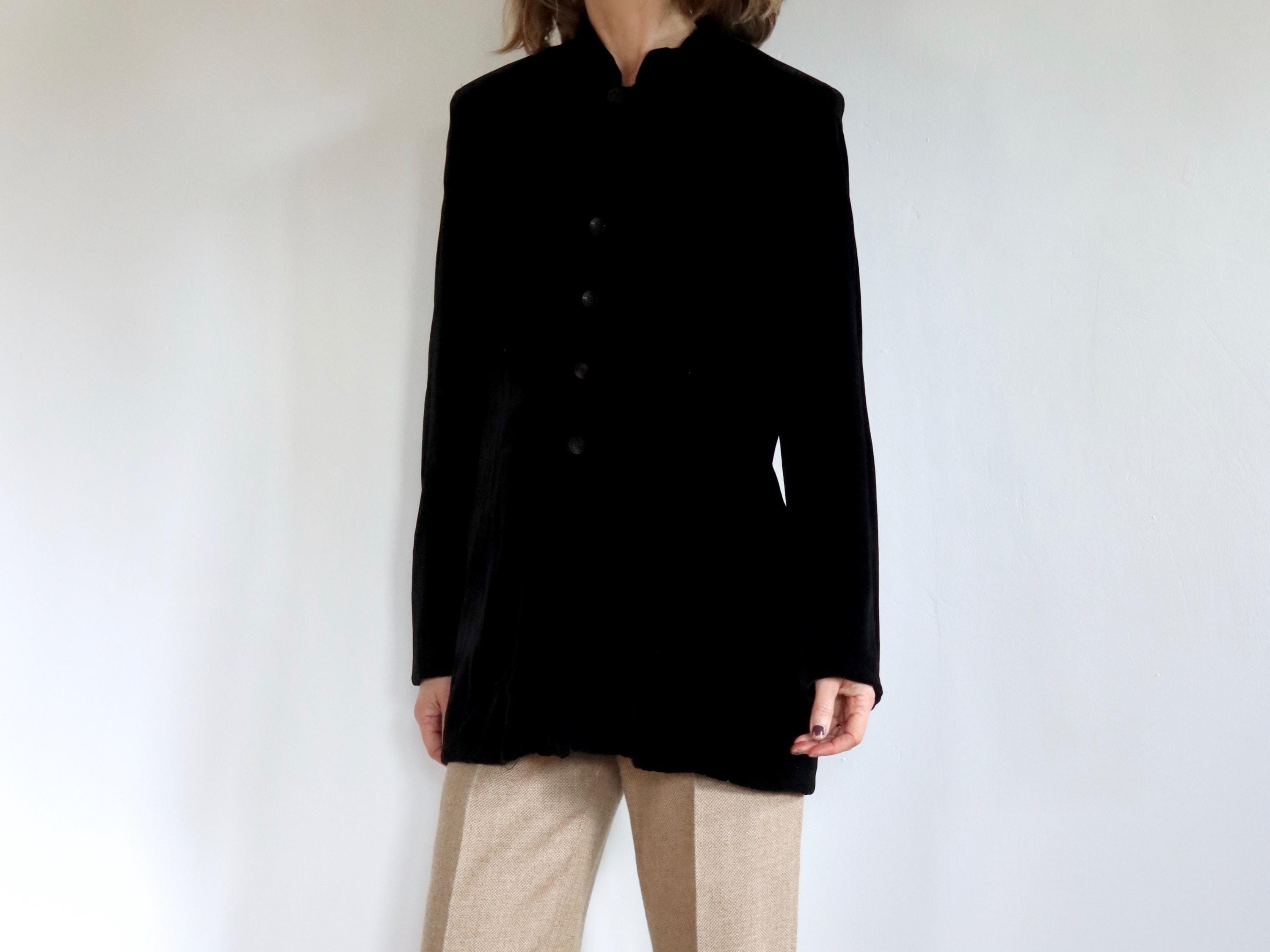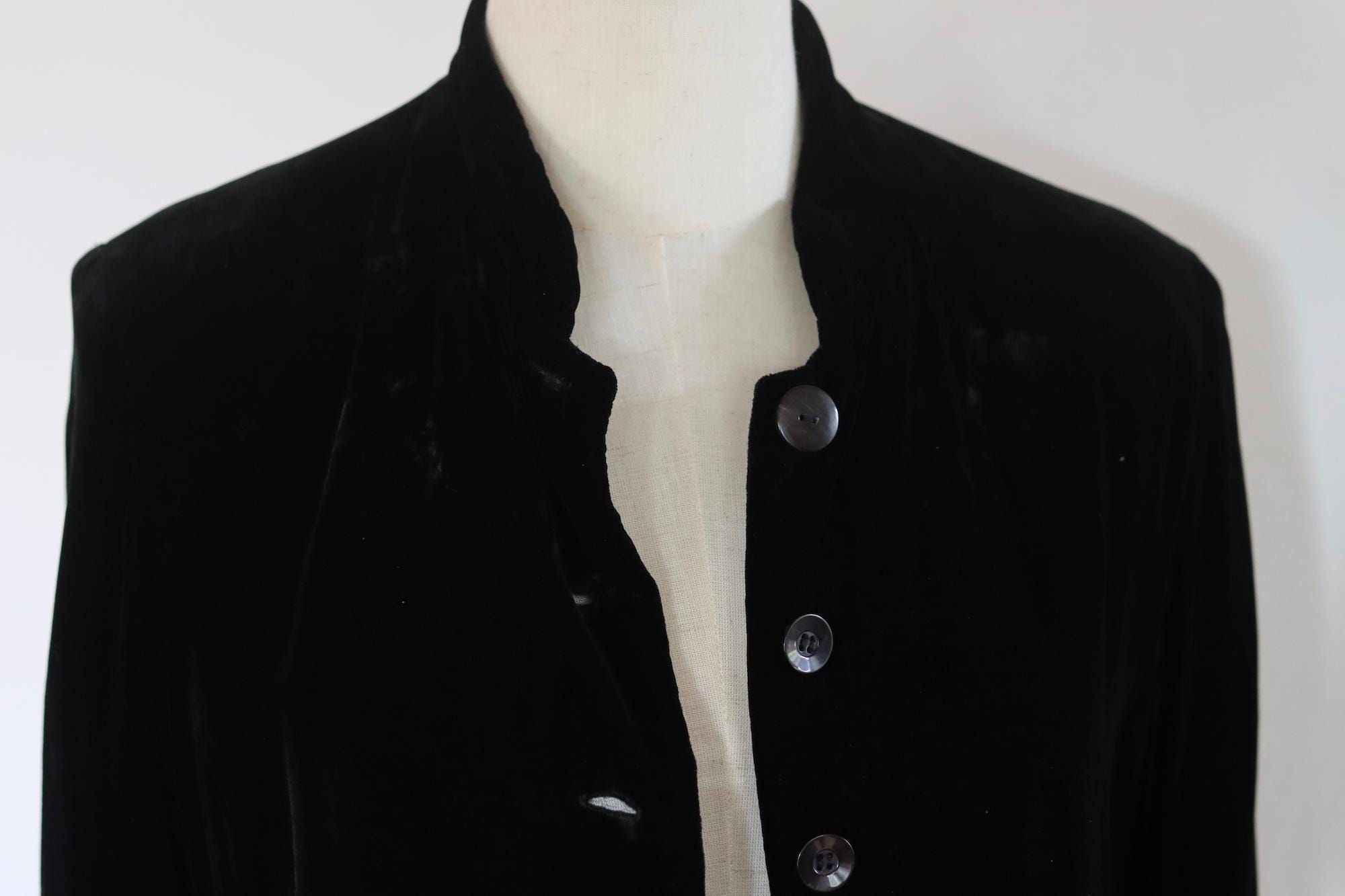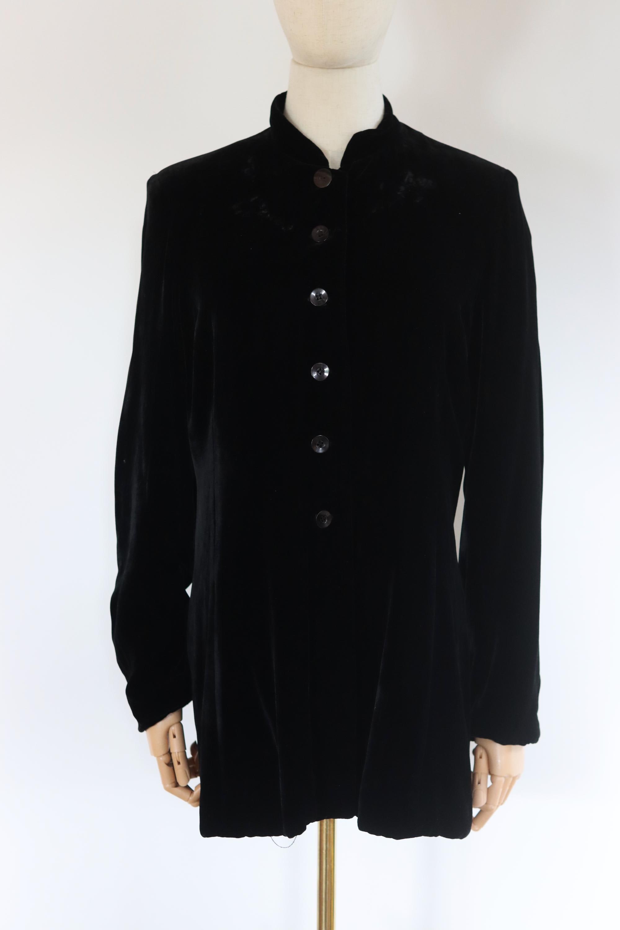 Lovely soft and lightweight black velvet blazer with mandarin collar and button front fastening.