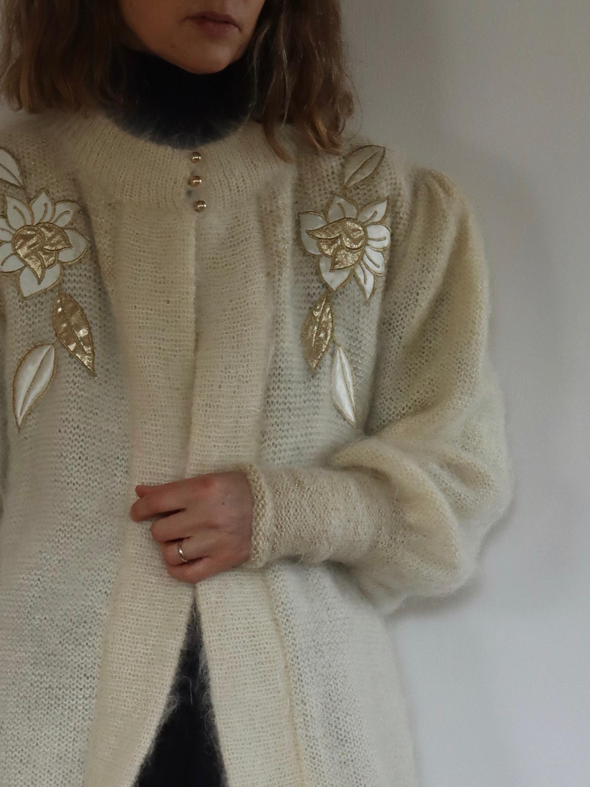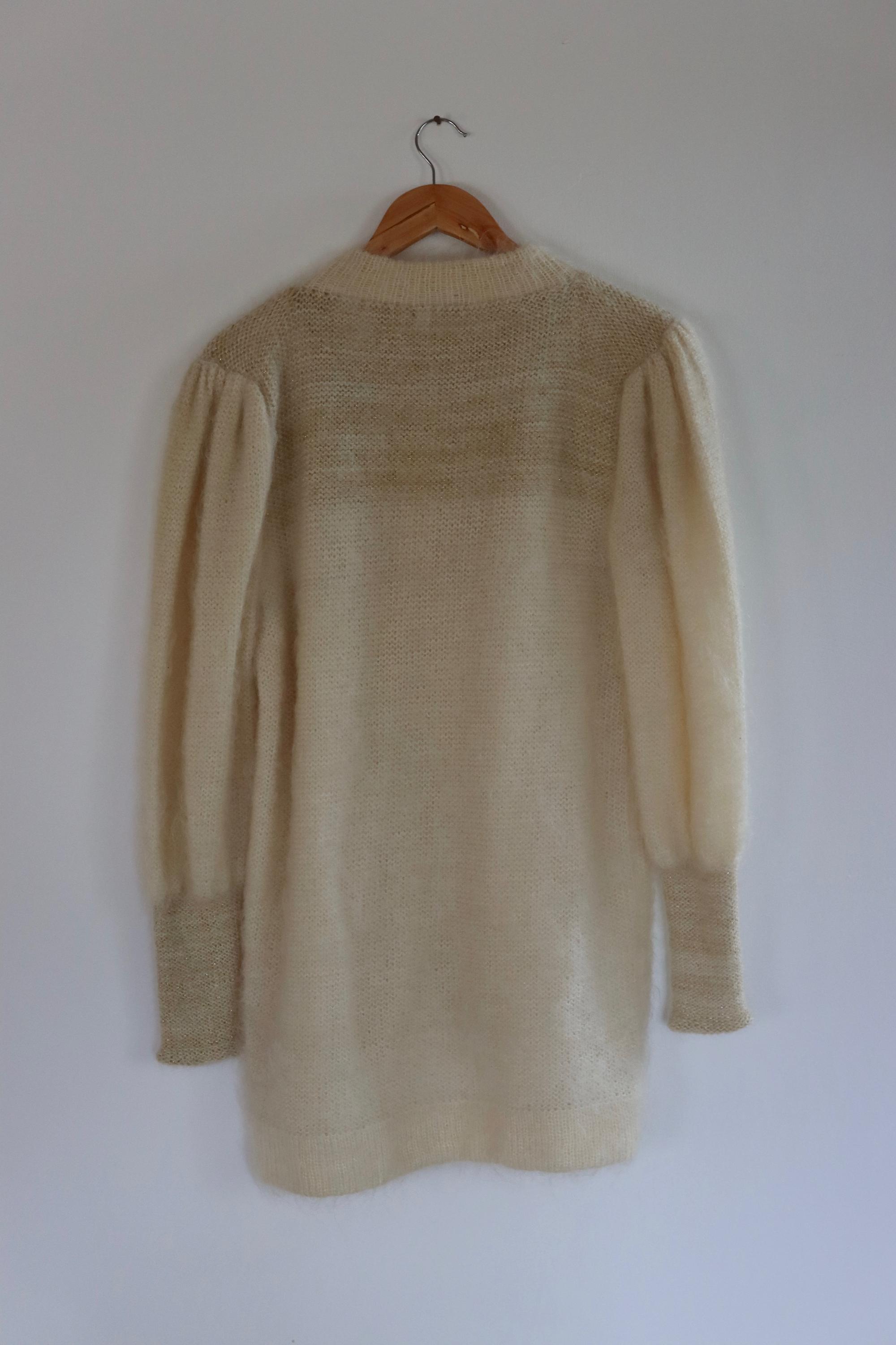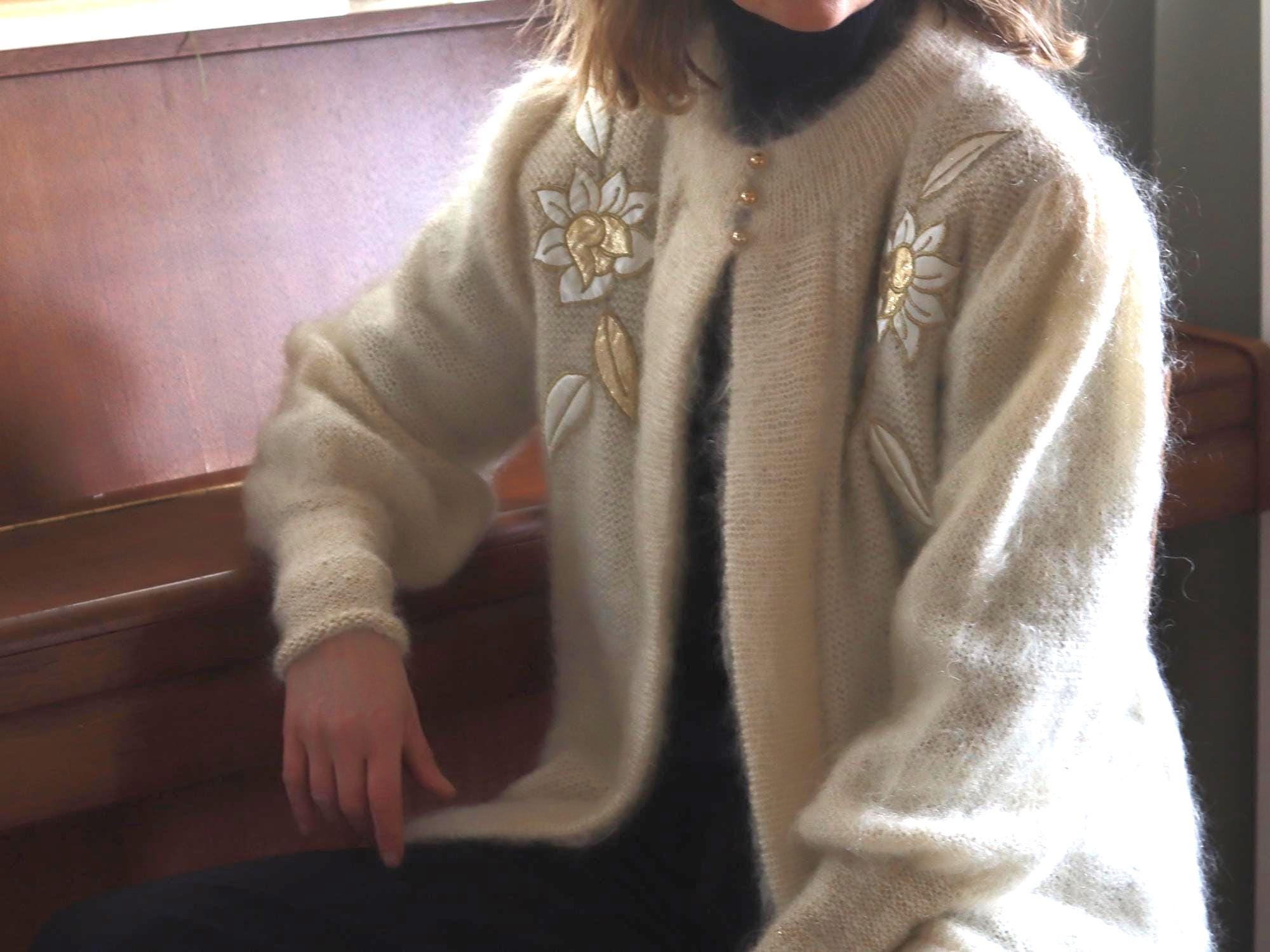 Vintage 80s mohair cardigan in cream with pearly 3 button fastening at the collar and embellishment detail.