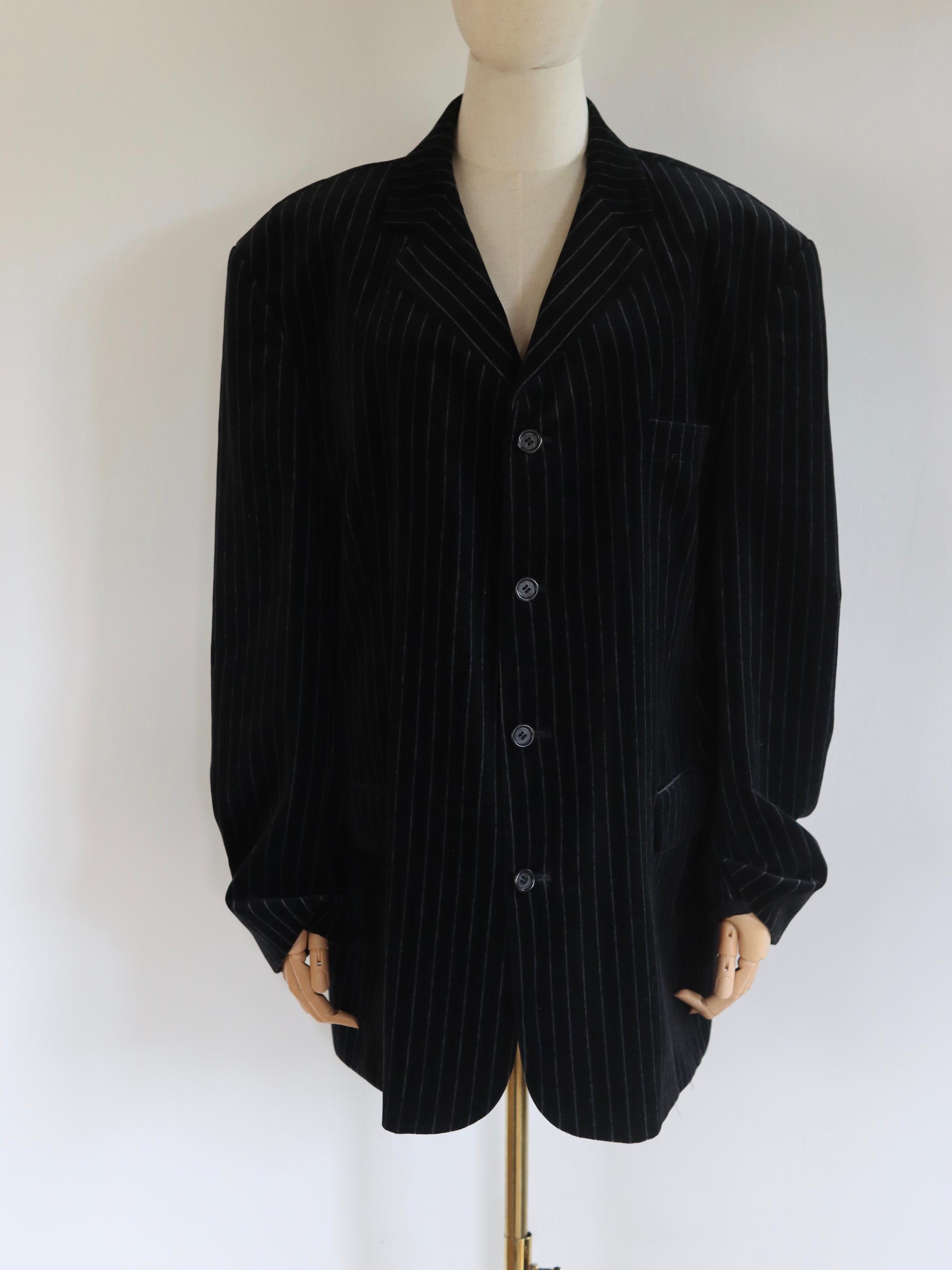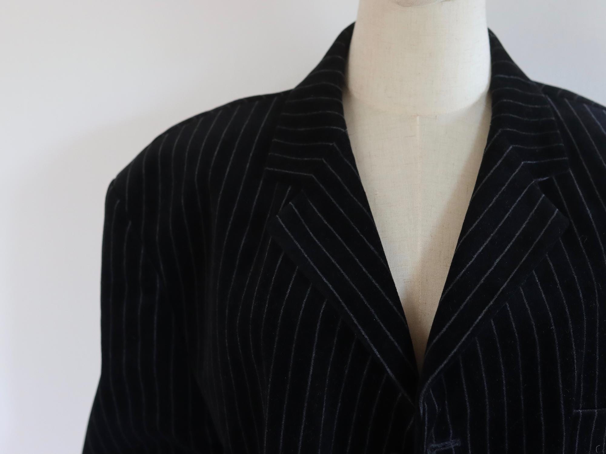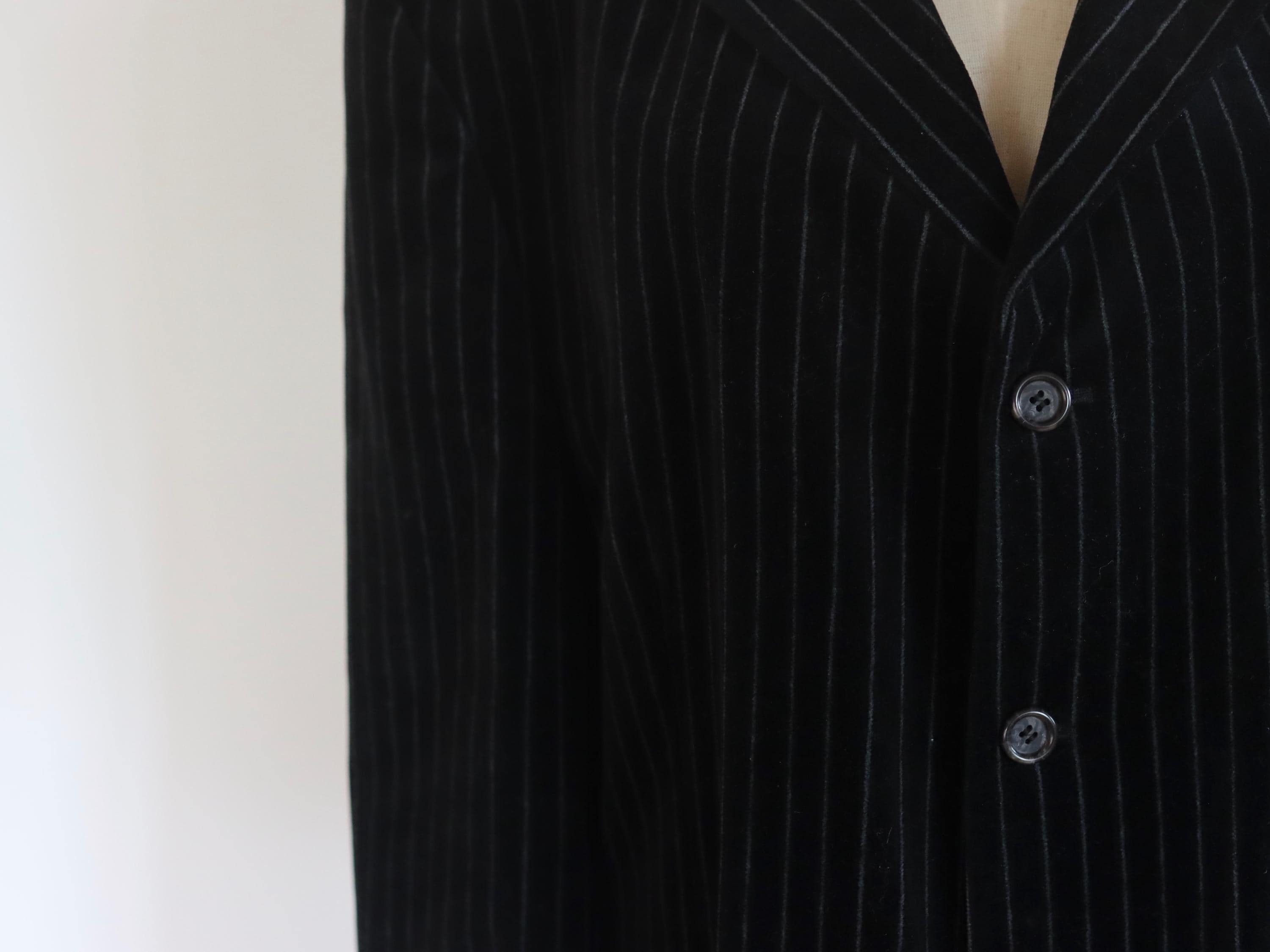 A vintage oversized Tom Wolfe London button front blazer in a pin striped black cotton velvet design.