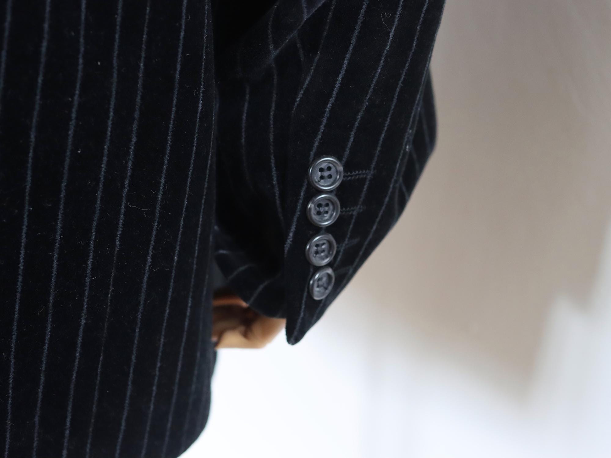 Design: Black pinstripe with a button-up closure