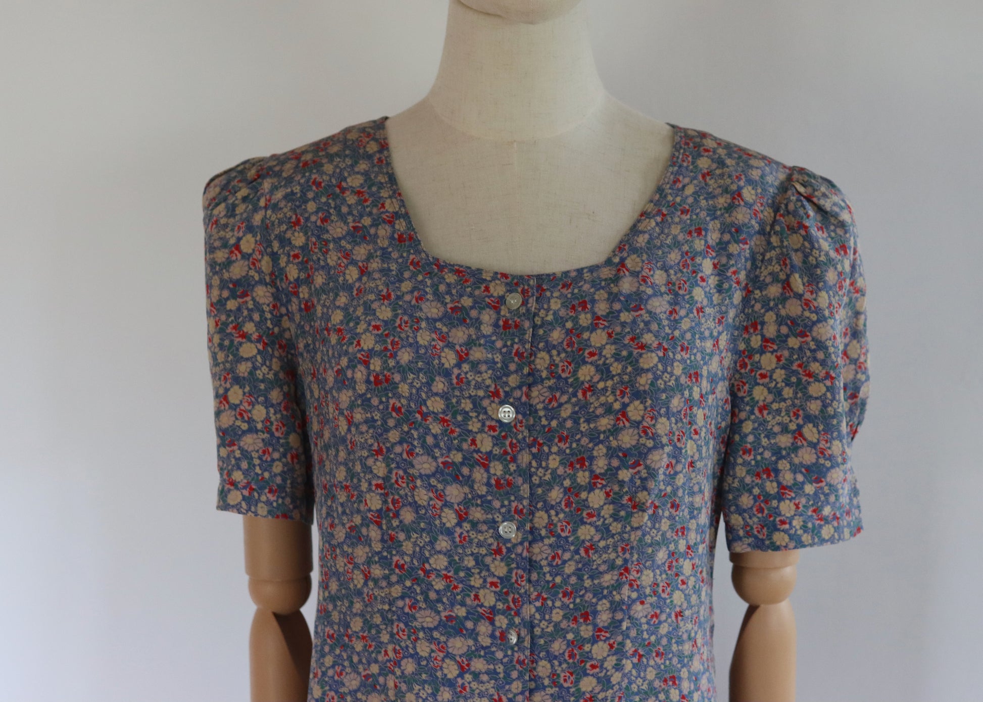 Sweet short silk floral button through dress with shoulder pads and puff sleeves, and a drop waist.